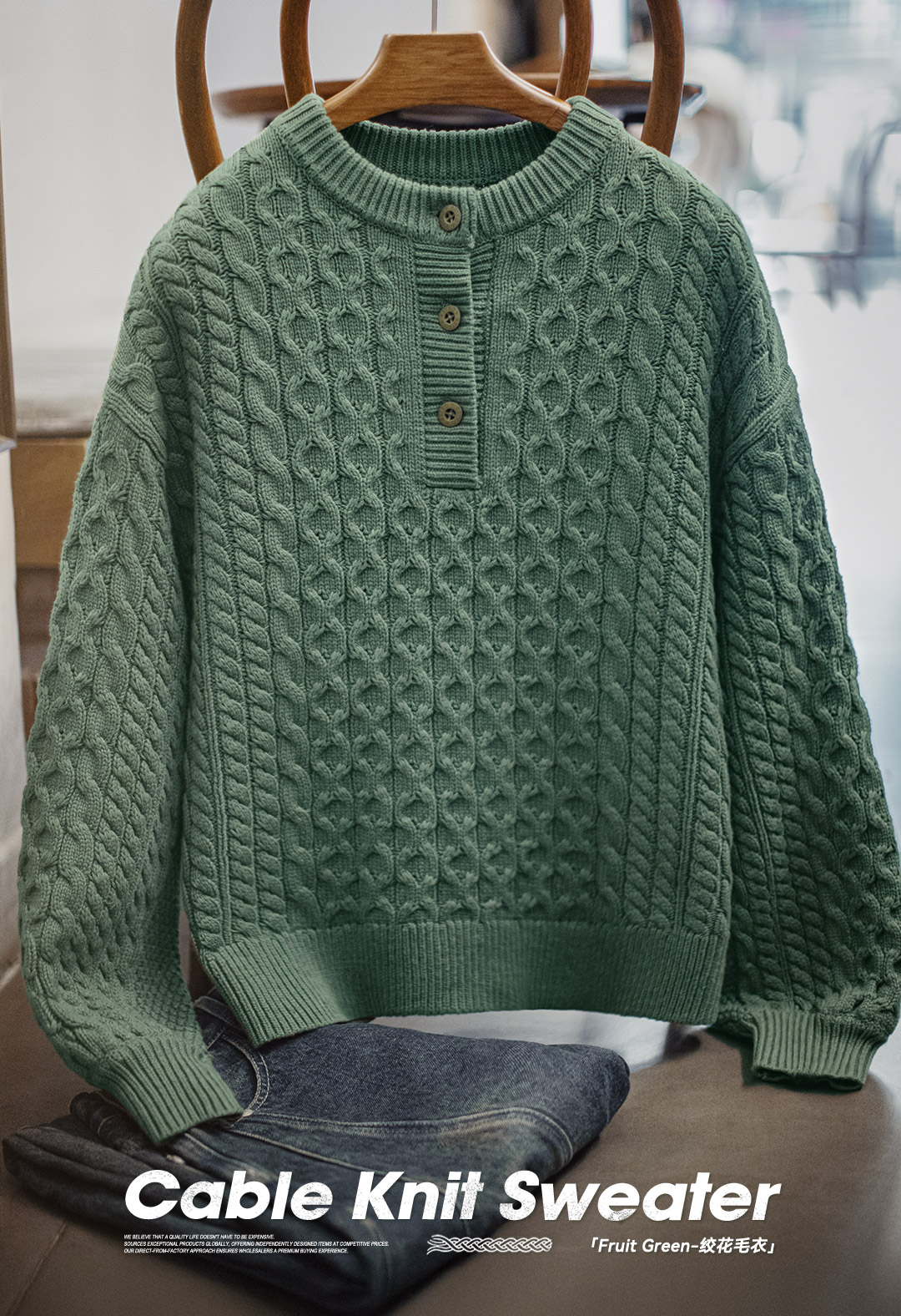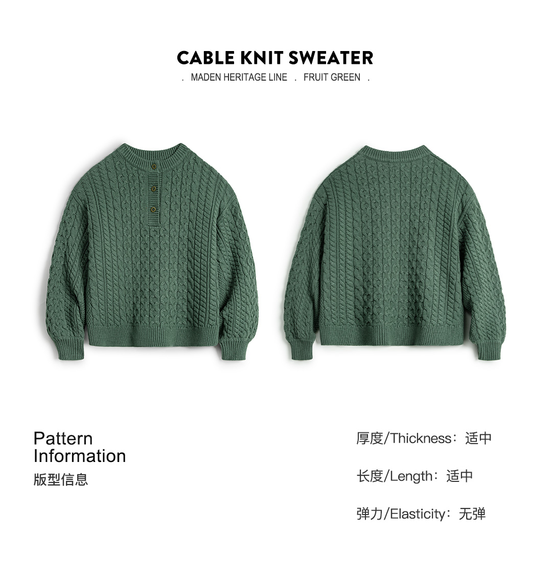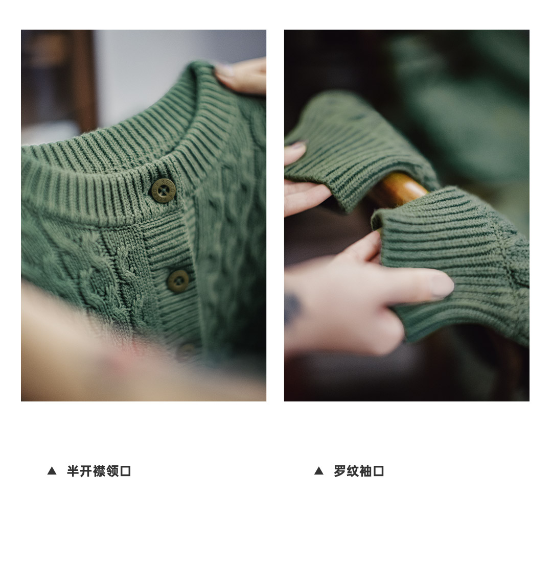 马登复古绿色亨利圆领宽松套头加厚针织衫绞花毛衣外套穿女士秋冬