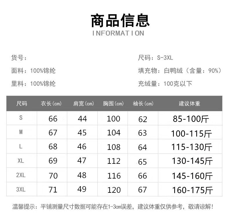 充绒量S56g,M60g,L64g,XL68g,2XL72g,3XL76g