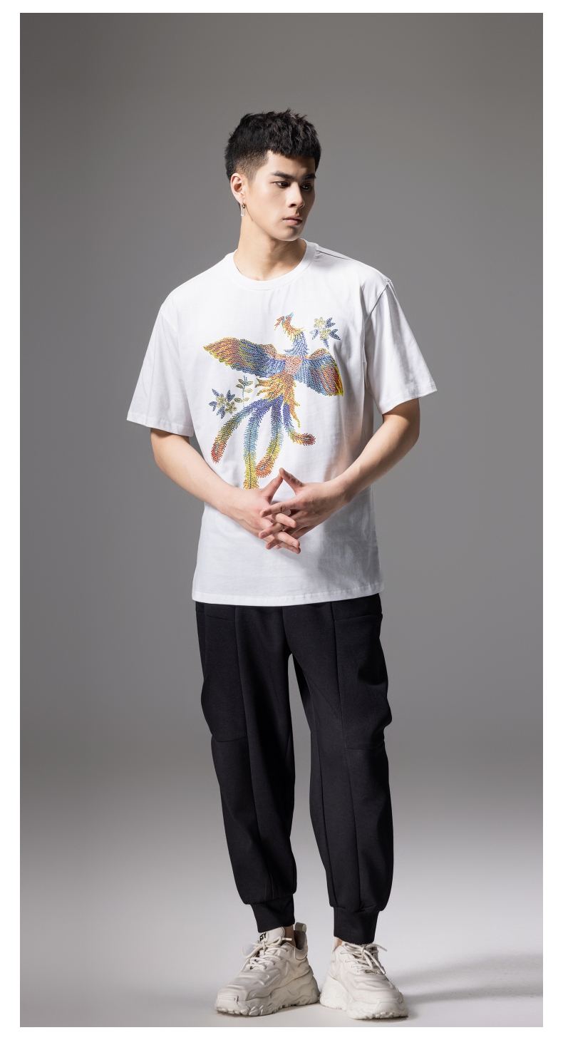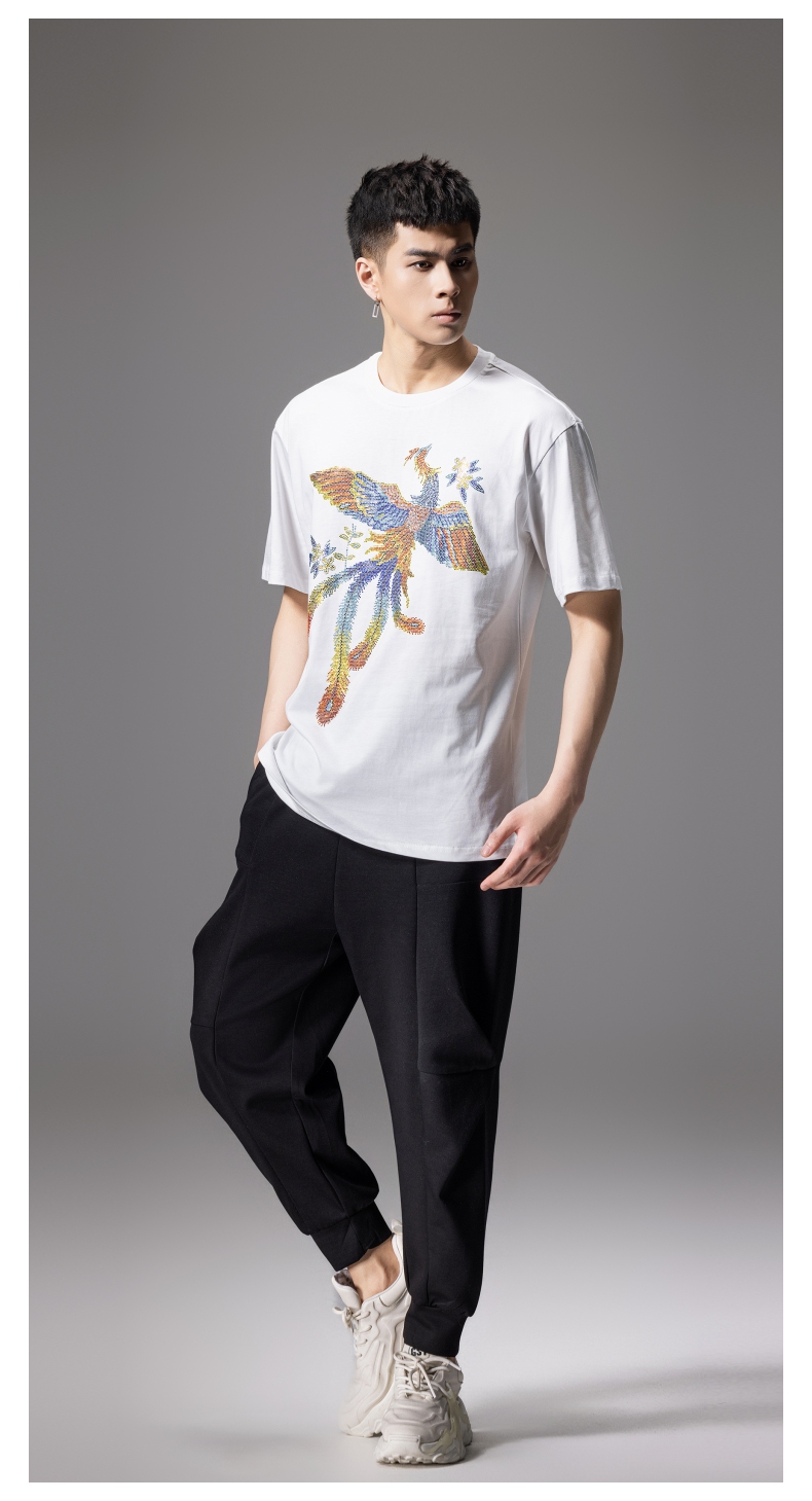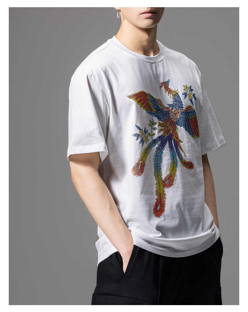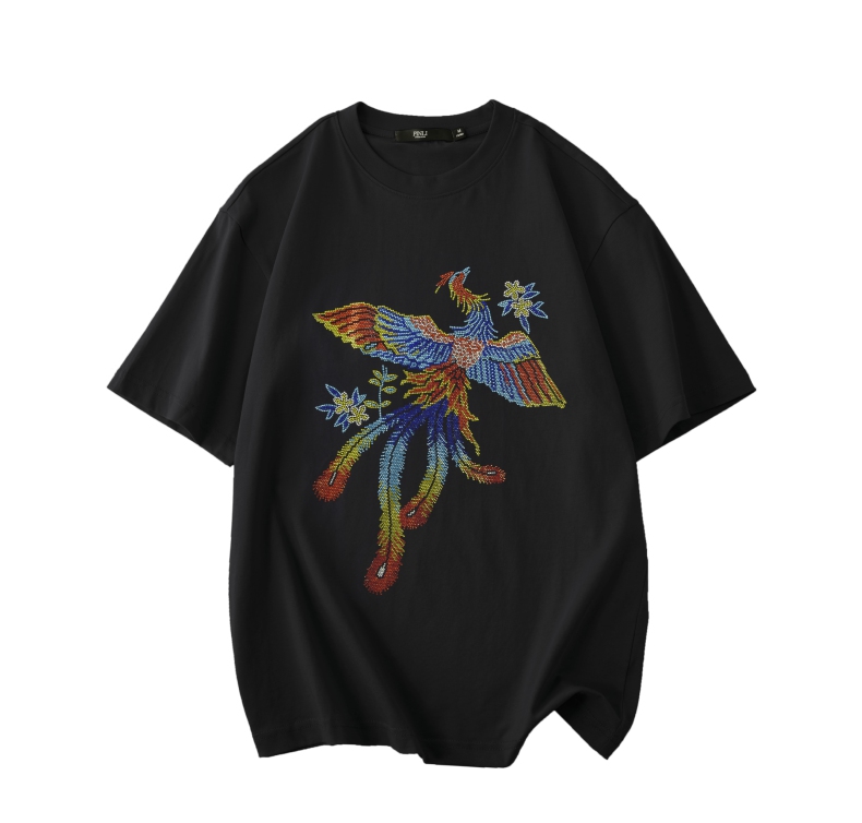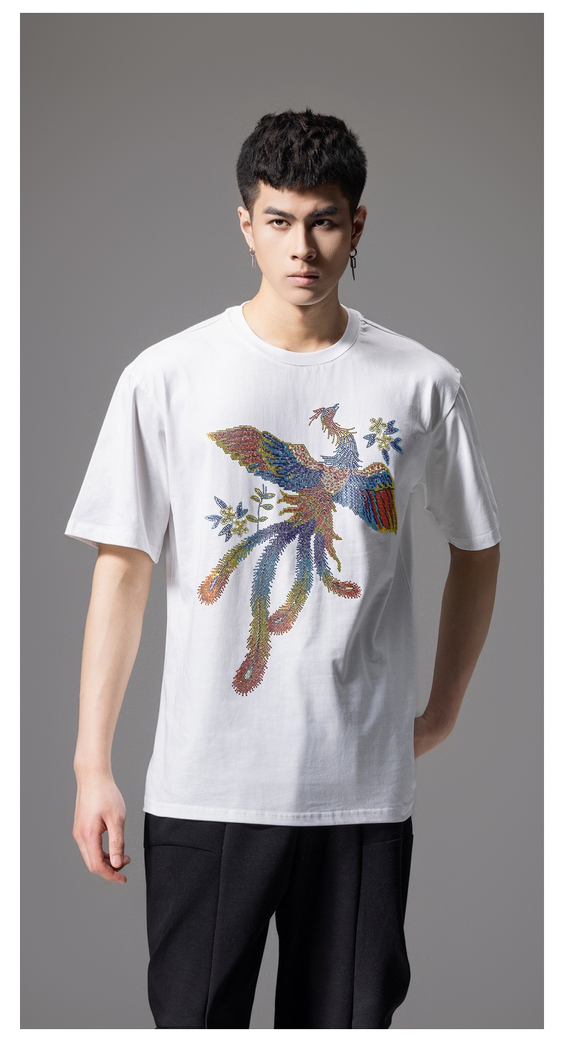 PINLI品立新中式2024夏季新款烫钻凤凰短袖T恤男士国潮休闲体恤BG242111038