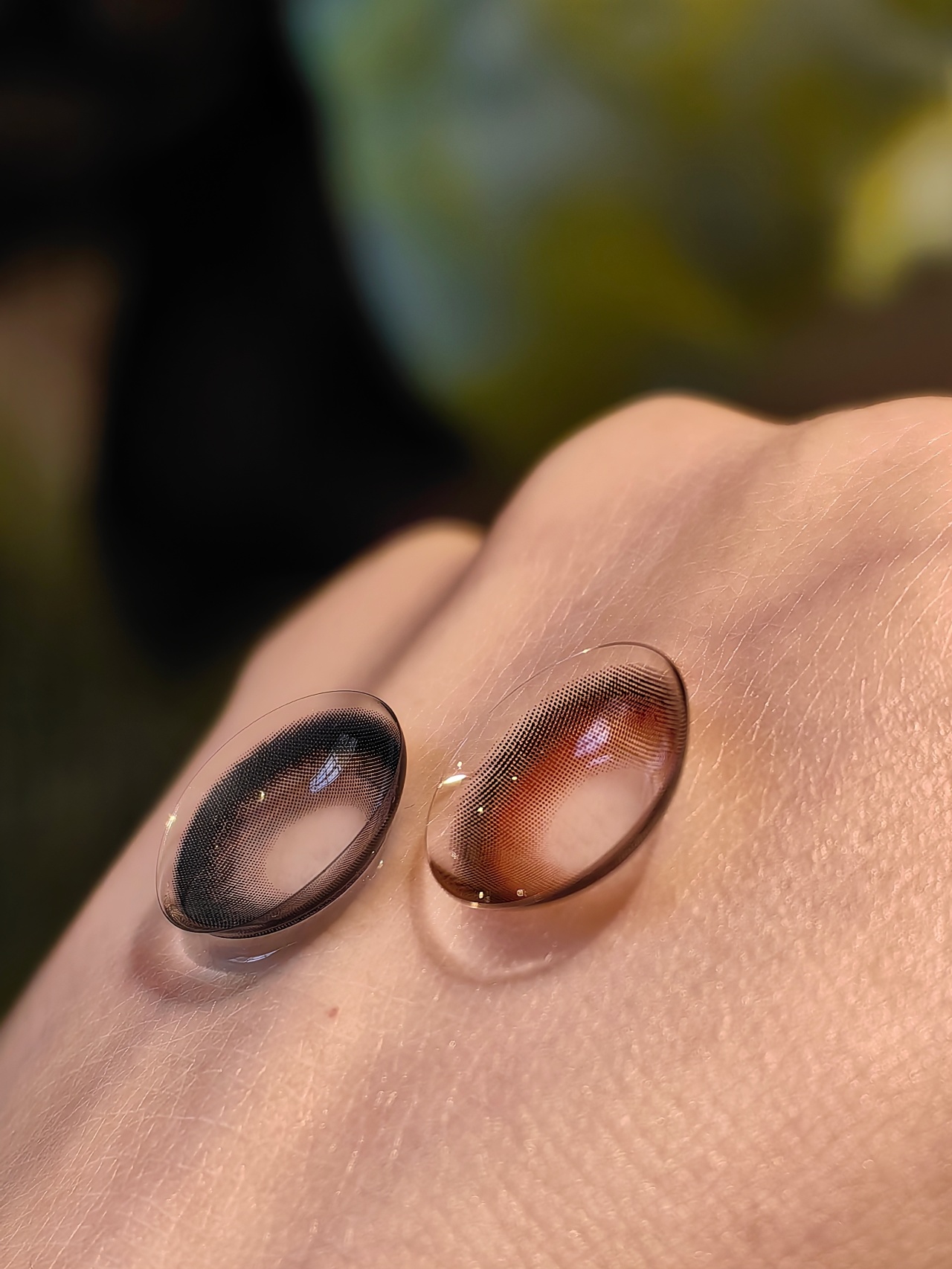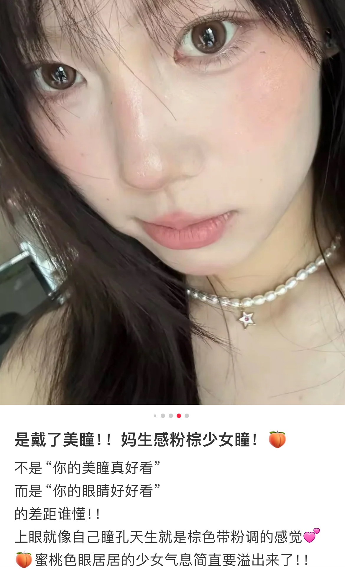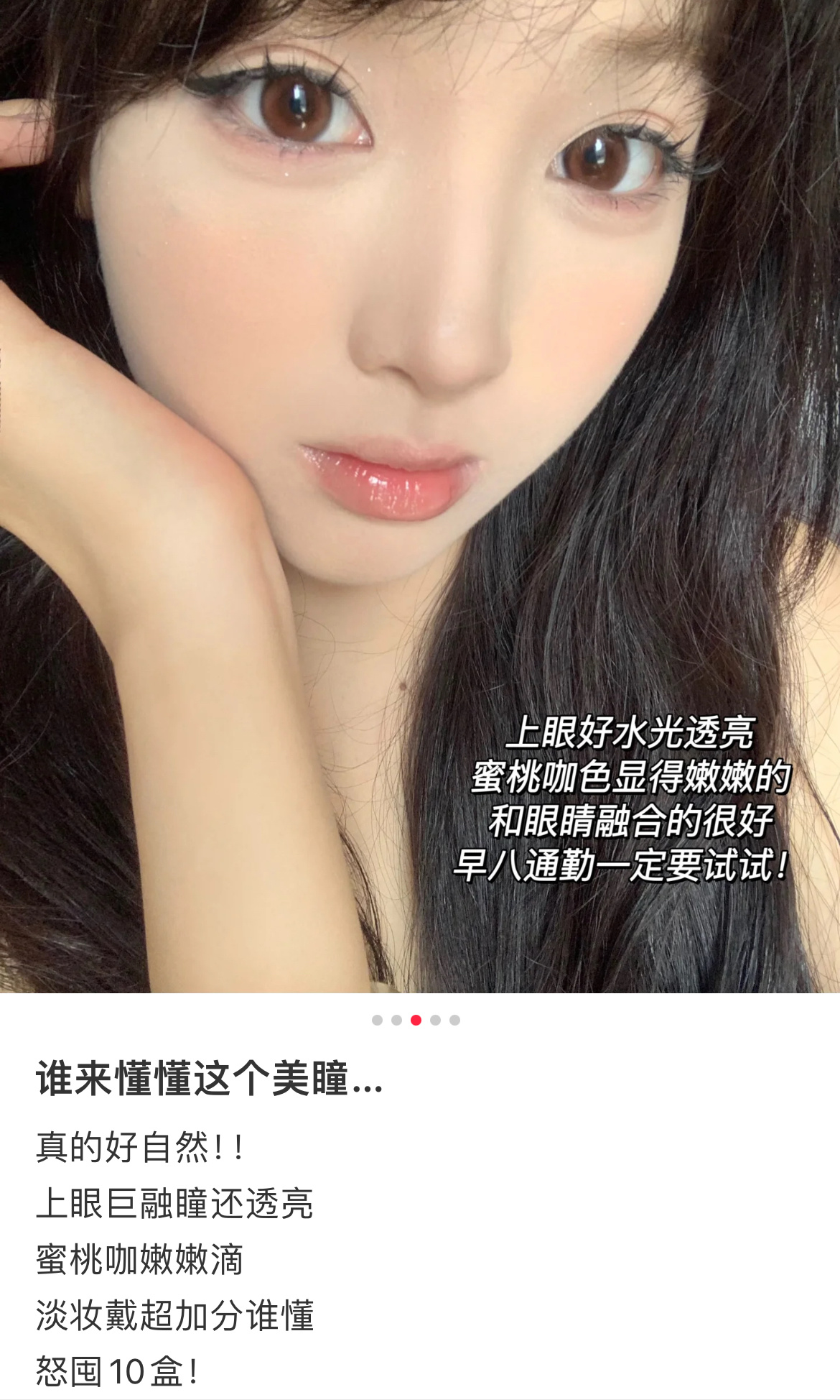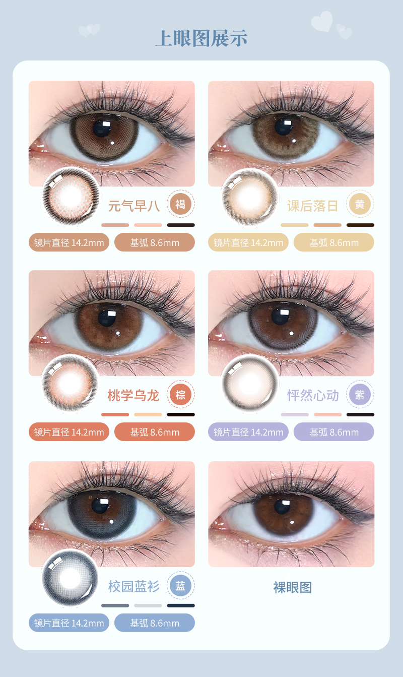 美瞳有五色可选,元气早八褐、课后落日黄、桃学乌龙棕、怦然心动紫、校园蓝衫蓝,每一种都超美,直径14.2,着色是13.5,刚刚好,不会大到像鬼,是很自然的眼珠子!元气早八褐,日常色,超温柔的,而且各种妆容发色都能搭;课后落日黄,会更柔和些,就像夕阳下的眼眸,非常有氛围感;桃学乌龙棕,这个颜色真的喜欢,浅浅的,但又不会失真,会让眼睛显得更大,气质拿捏;怦然心动紫,神秘又浪漫,搭上千禧风,绝对的焦点哦;还有校园蓝衫蓝,清新又减龄,是非常安全的颜色,不会出错!我有留桃气乌龙和校园蓝衫蓝,都很爱!而且镜片超薄的,中心厚度只有0.06mm,柔软又轻薄,舒服!