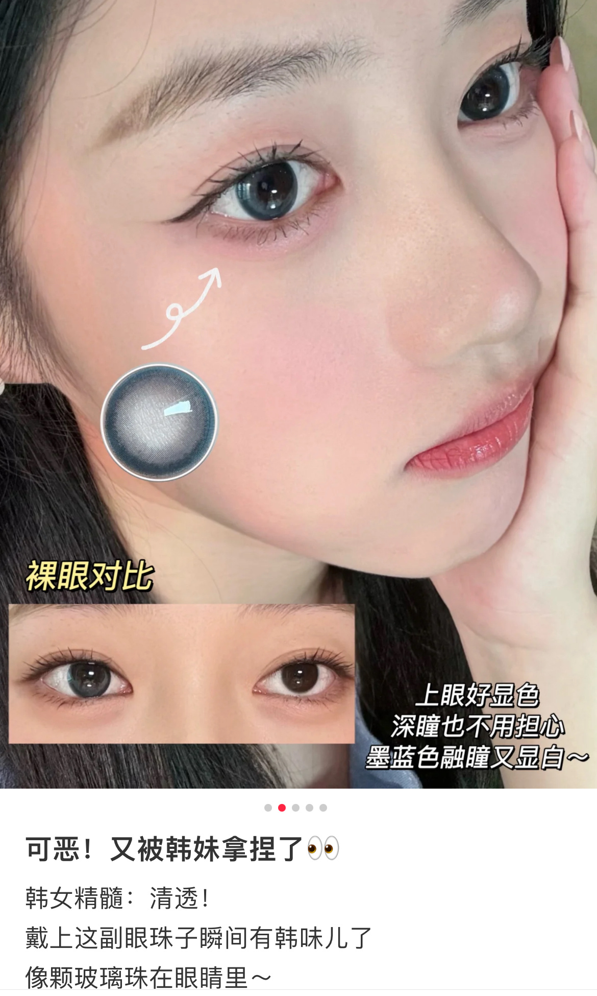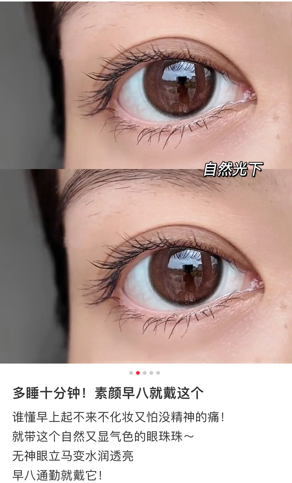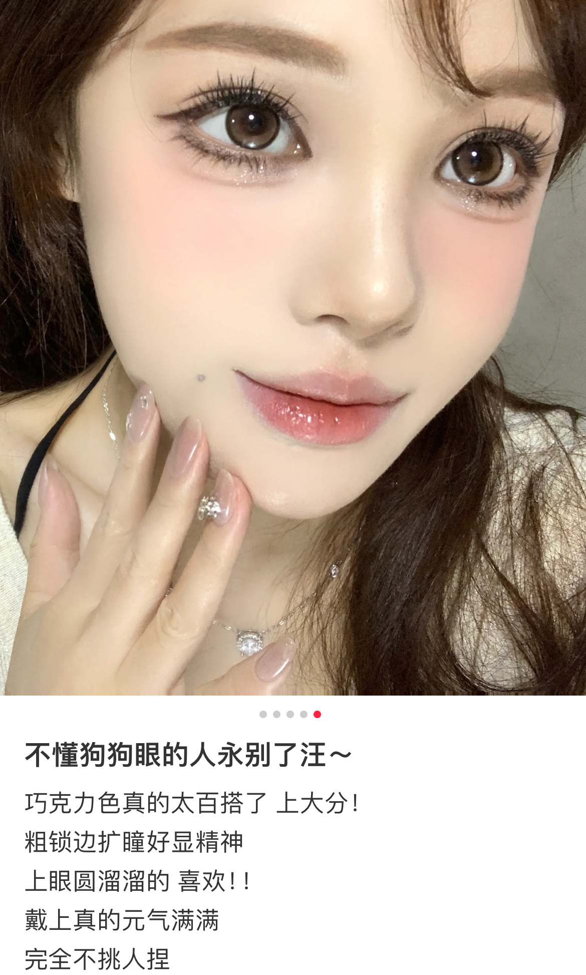 美瞳有五色可选,元气早八褐、课后落日黄、桃学乌龙棕、怦然心动紫、校园蓝衫蓝,每一种都超美,直径14.2,着色是13.5,刚刚好,不会大到像鬼,是很自然的眼珠子!元气早八褐,日常色,超温柔的,而且各种妆容发色都能搭;课后落日黄,会更柔和些,就像夕阳下的眼眸,非常有氛围感;桃学乌龙棕,这个颜色真的喜欢,浅浅的,但又不会失真,会让眼睛显得更大,气质拿捏;怦然心动紫,神秘又浪漫,搭上千禧风,绝对的焦点哦;还有校园蓝衫蓝,清新又减龄,是非常安全的颜色,不会出错!我有留桃气乌龙和校园蓝衫蓝,都很爱!而且镜片超薄的,中心厚度只有0.06mm,柔软又轻薄,舒服!