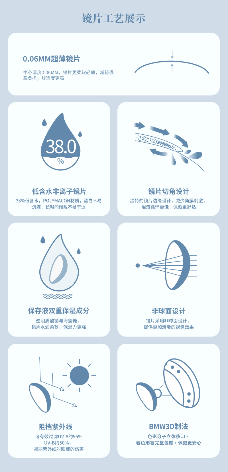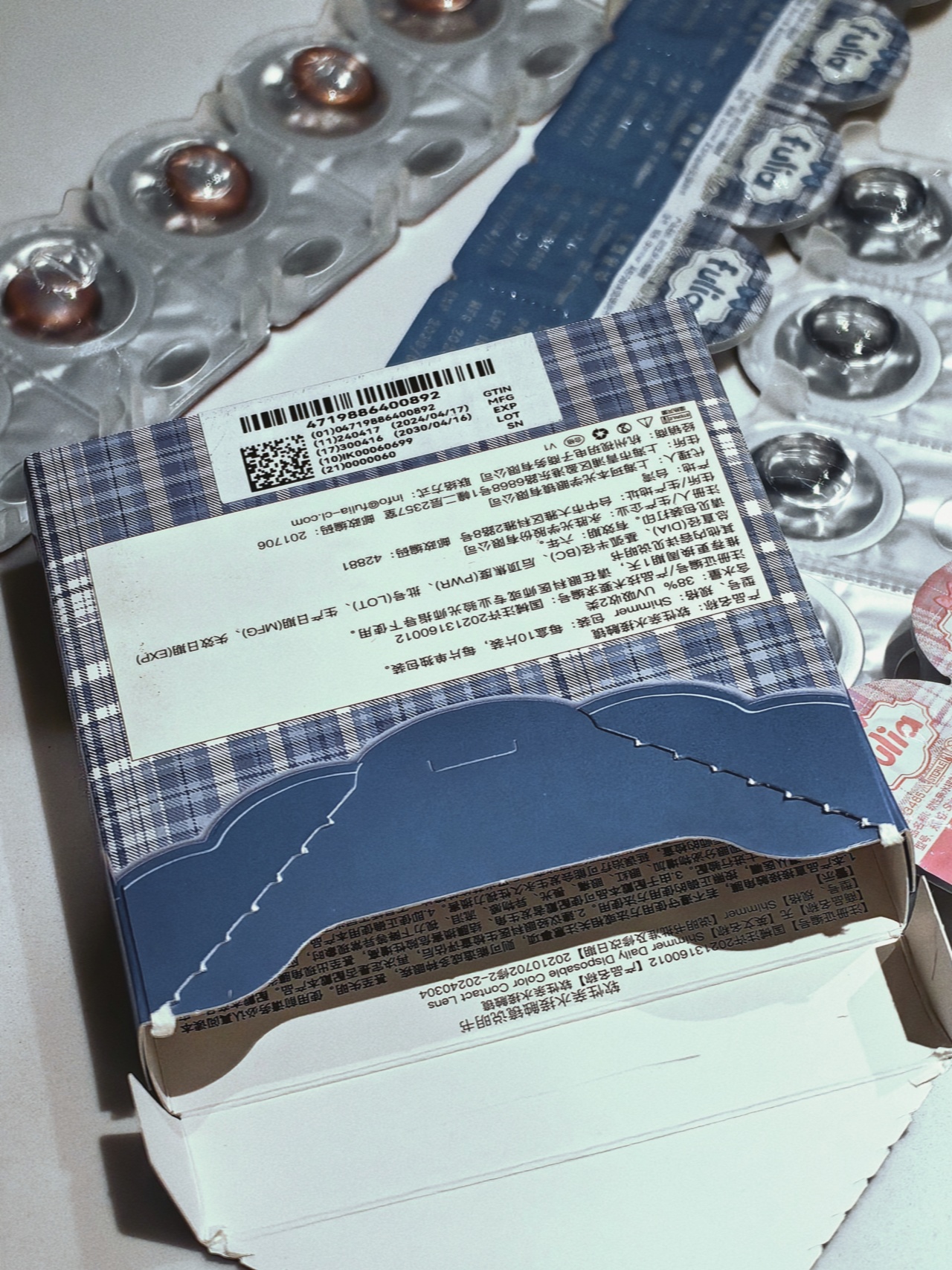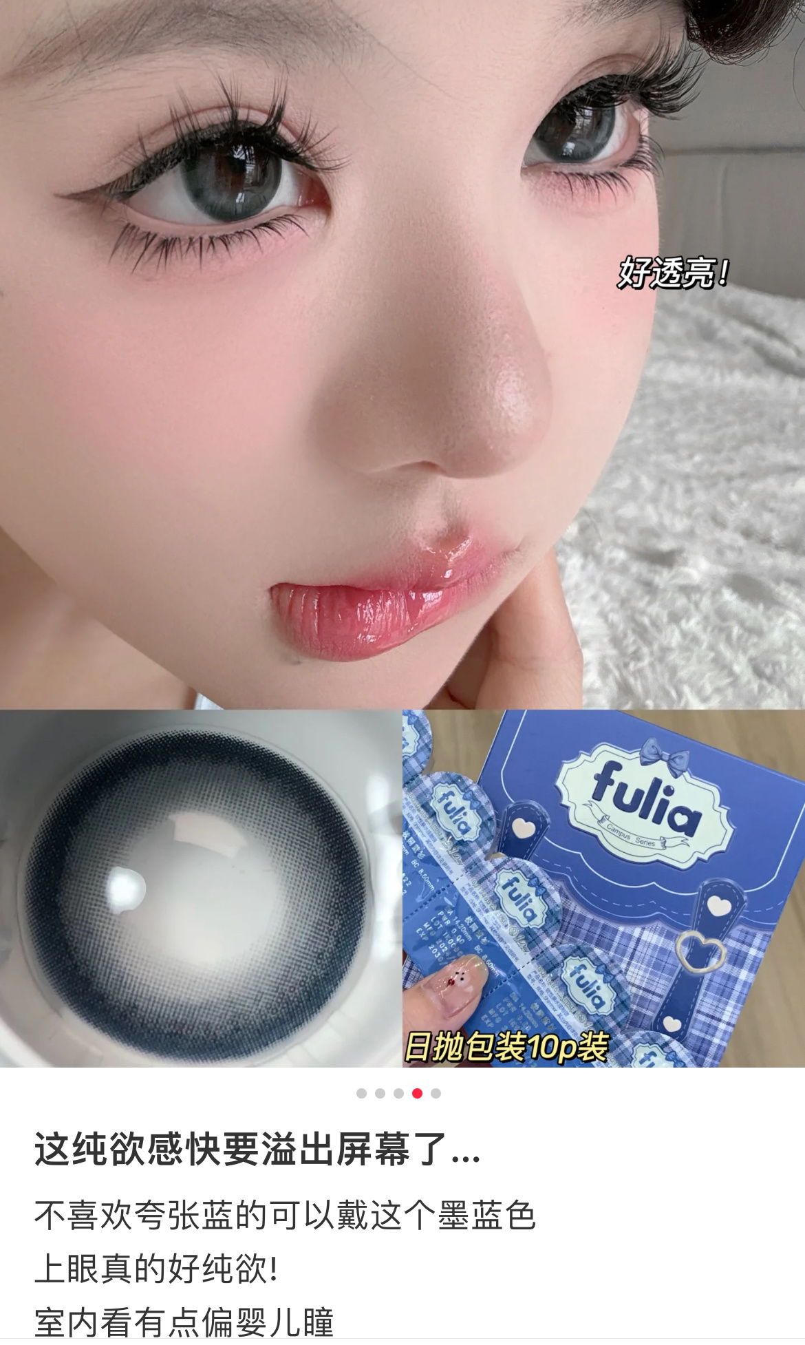 FULIA馥莉雅的美瞳,工艺很棒,采用的是非离子镜片,38%的低含水,加上POLYMACON材质,蛋白不易沉淀,长时间戴也不会干涩,眼睛一直可以水润润!镜片切角设计也很独特,边缘处理得超舒服,能减少角膜刺激,对泪液循环也更友好,戴一整天都不容易难受;非球面设计让镜片更贴合眼球,视觉效果更清晰;它还能阻挡紫外线,过滤掉大部分UV-A和UV-B,就像给眼睛加了一层防护罩;最后是BMW3D制法,色彩分子立体移印,颜色自然,也很安全,戴起来超安心!还有PMB保存液,是能在镜片上形成水分膜的,保湿效果好,水汪汪!
