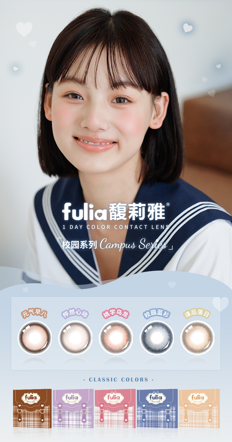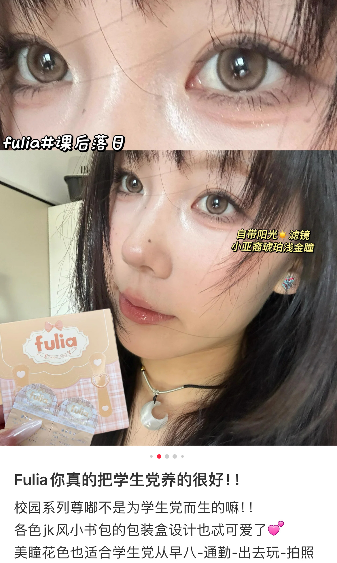 又试到不错的国产美瞳了哎,FULIA馥莉雅的校园系列,超青春的配色,戴上就忍不住想自拍几张,价格也便宜,品质又有保障,是海昌代理的哦!而且有日抛和半年抛,度数也是从0-1000度,我也可以戴啦!这次也是很认真试戴了16小时,我这种1200度又有结膜炎的大敏感眼球球都没有不适,最喜欢的一点是,好戴也好摘,新手完全可以试试!