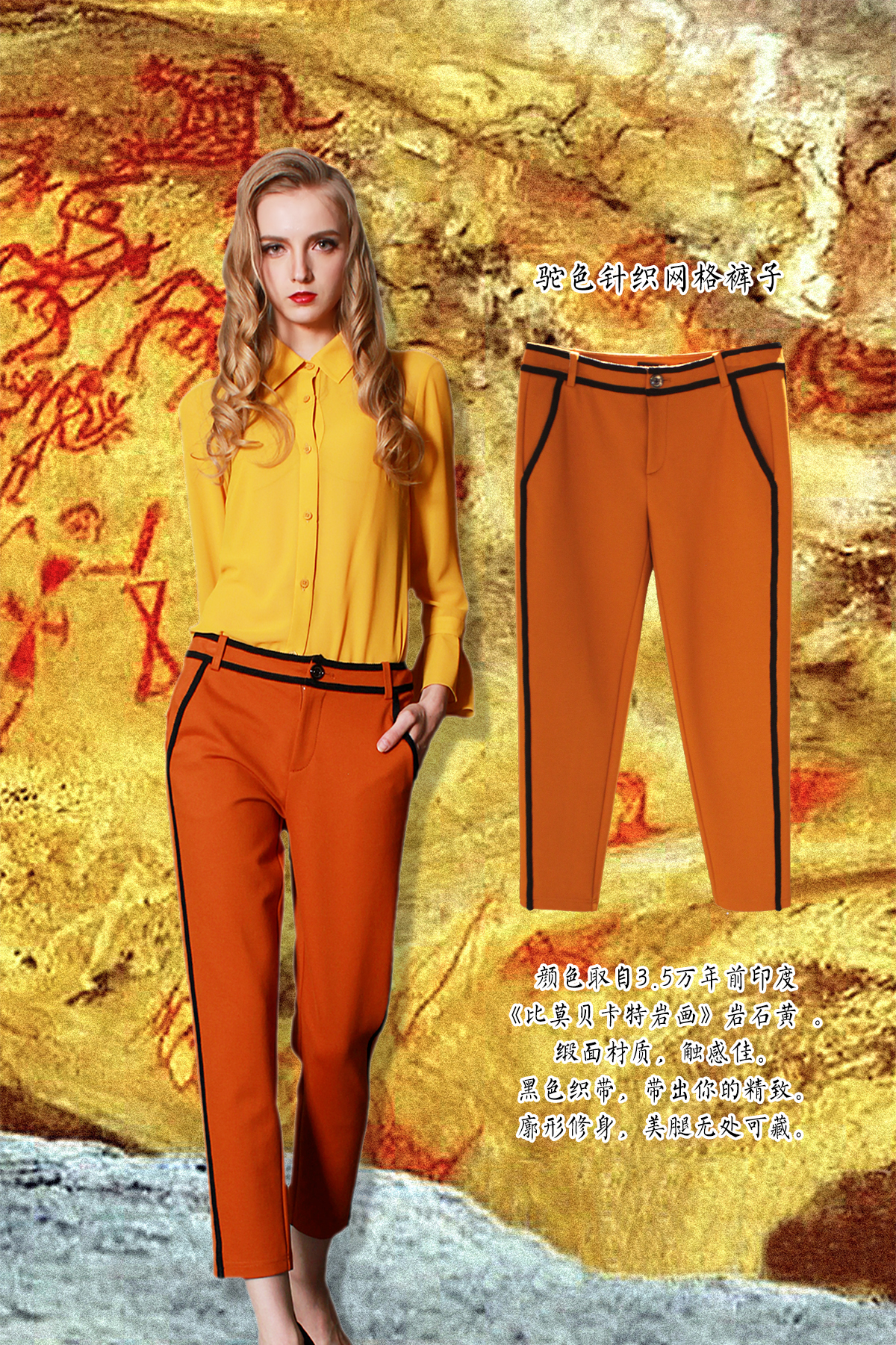 本品颜色取自3.5万年前印度《比莫贝卡特岩画》岩石黄 。缎面材质,触感佳。黑色织带,带出你的精致。廓形修身,美腿无处可藏。
