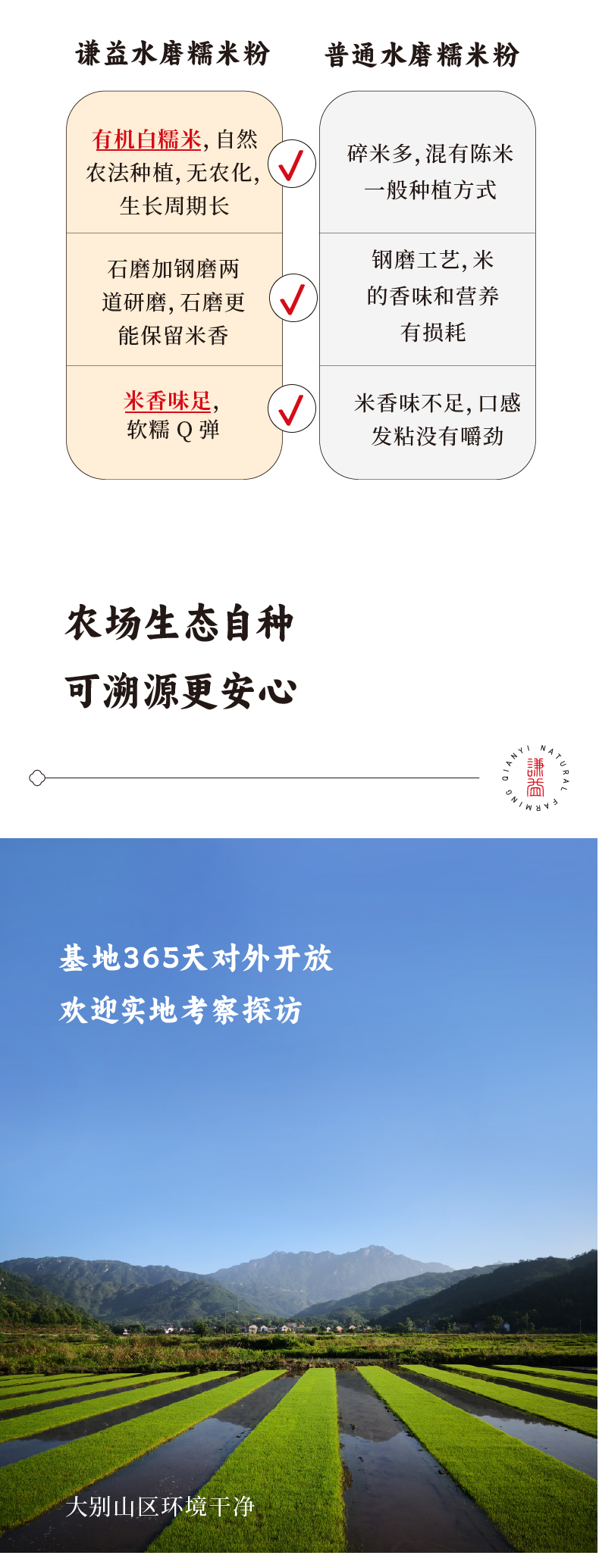 【特色】自产胭脂紫米和香禾糯米加工而成,干磨三遍保证细度,适合做汤圆,小圆子,面点,米糊。