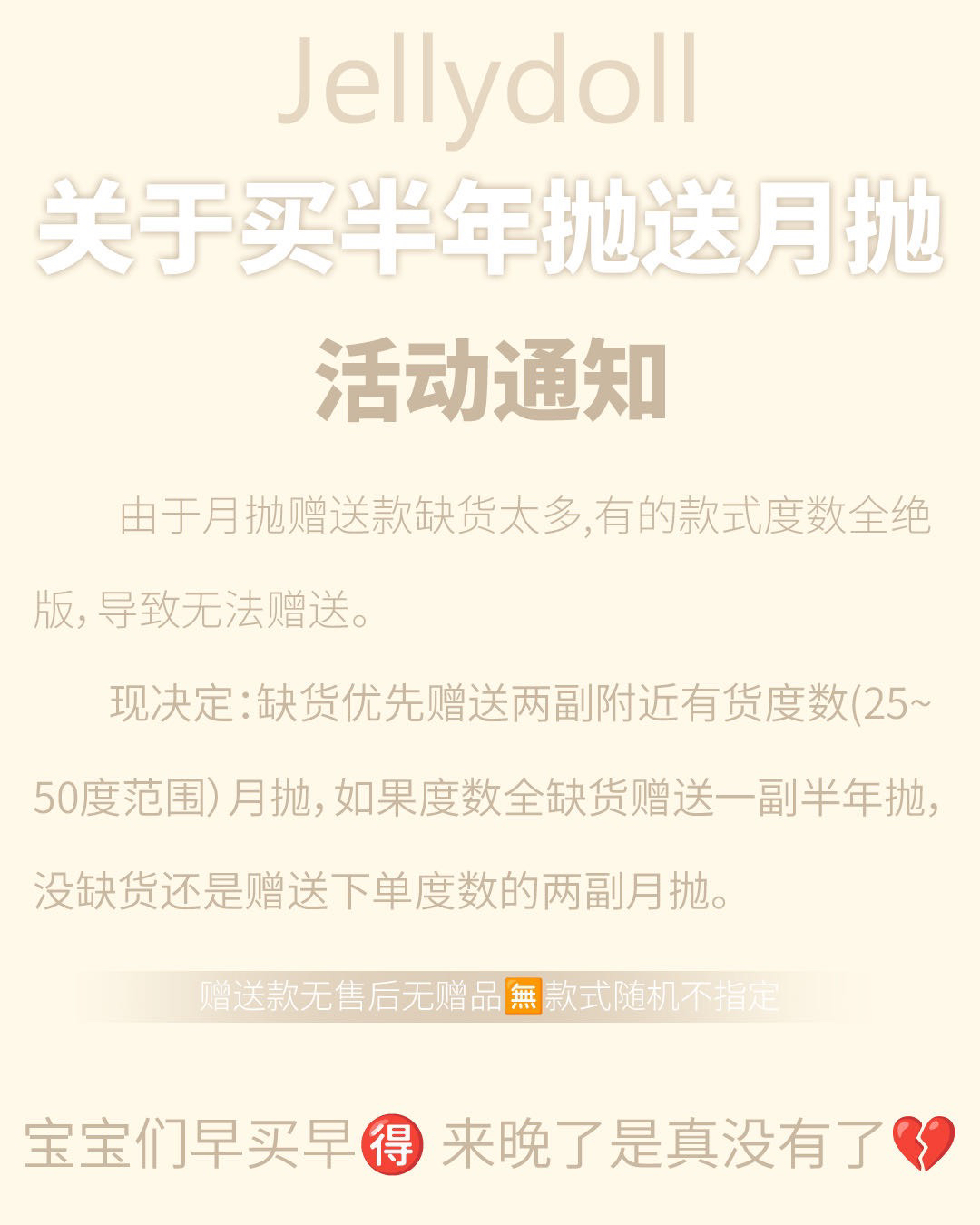 Jellydoll半年抛活动两副118 三副138送盒 买就赠送两副随机月抛或者一副半年抛。赠送款式随机/不接受指定款 如遇赠品度数缺货 赠送附近度数