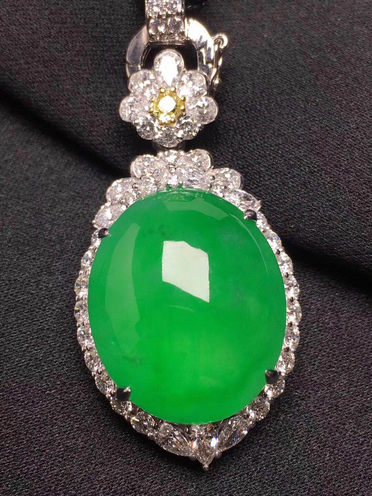 【201056】翡翠冰种阳绿蛋面吊坠,蛋面饱满,18K金钻镶豪华镶嵌,美丽大方!等着你来收裸石尺寸:20.5*17.3*6.2mm 收藏价 238000