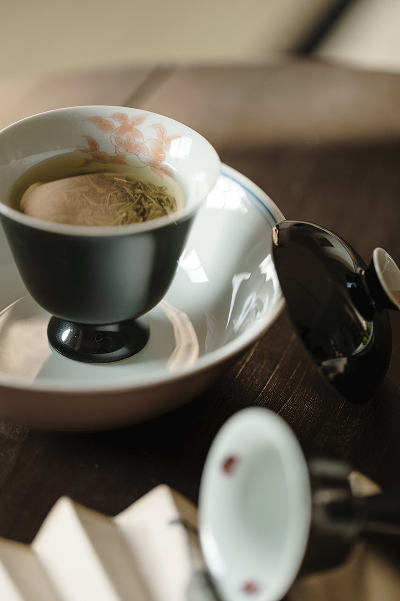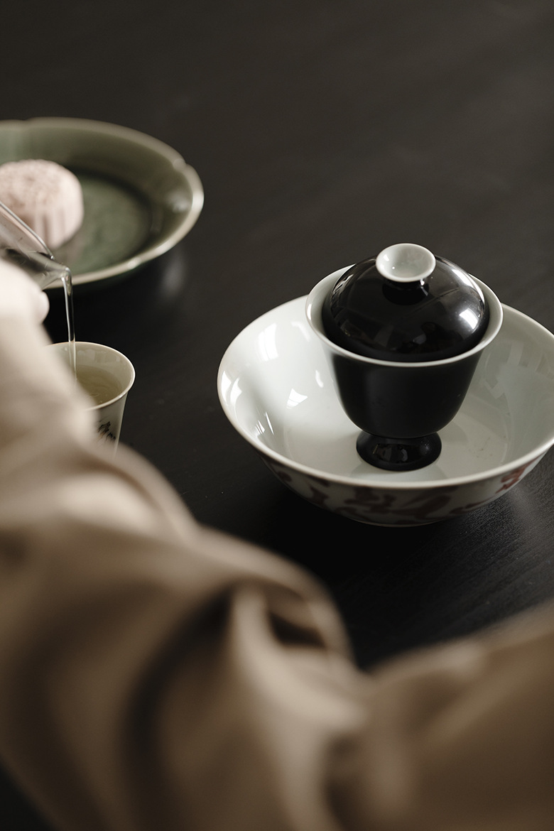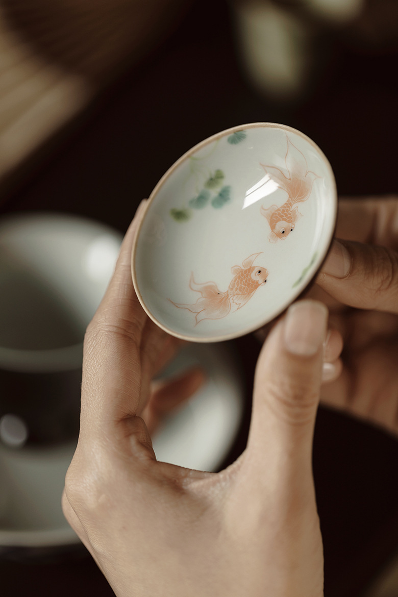 永利汇 无落玄盖碗春池釉下手绘年年有余茶碗高足二才泡手工家用