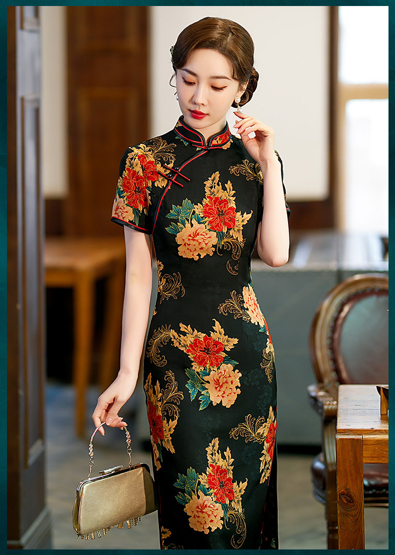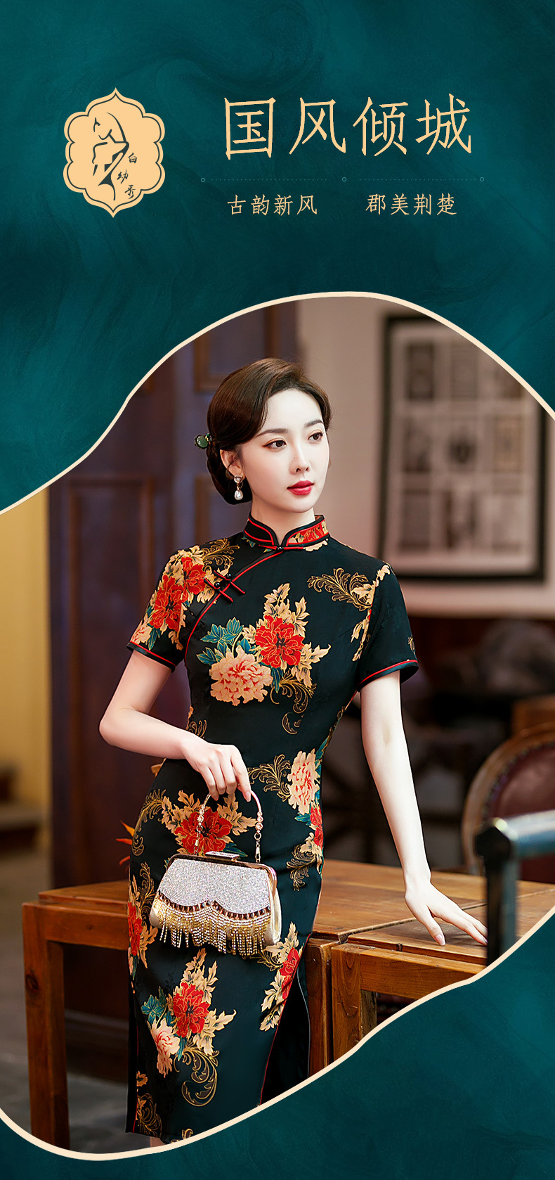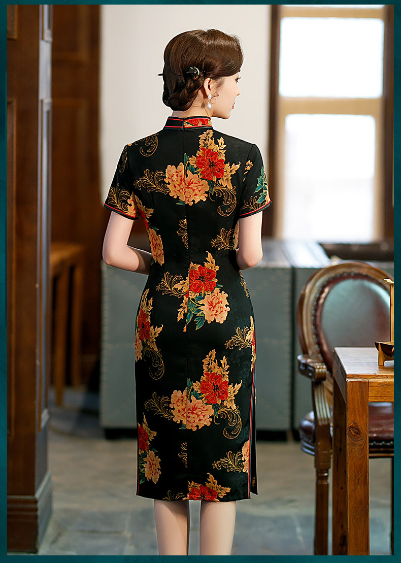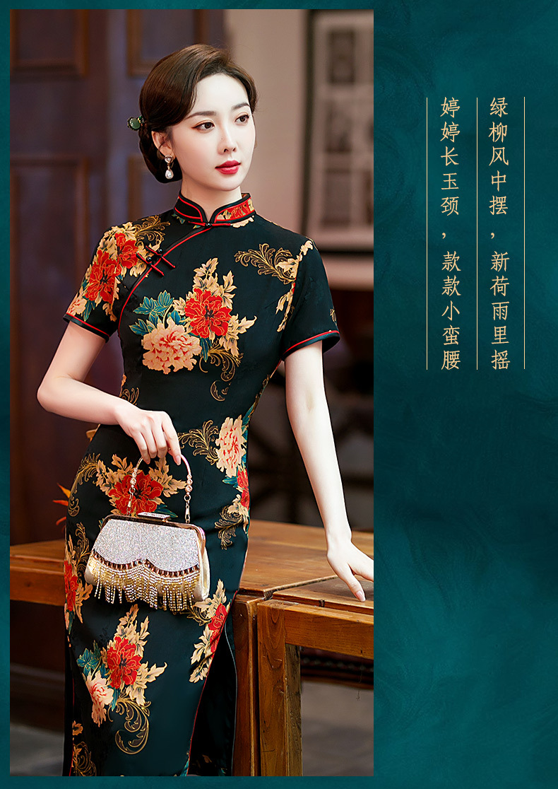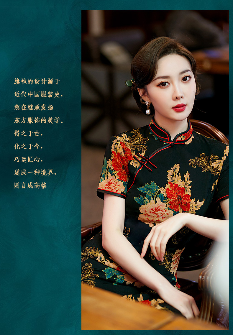 STFS-B2063新款中国风优雅气质修身立领短袖印花开叉旗袍