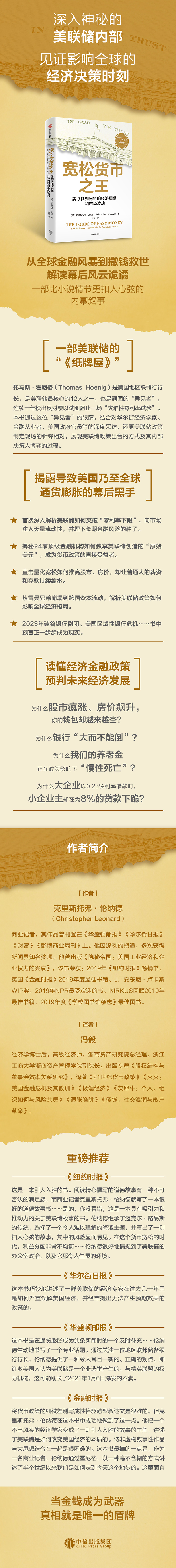 2010年11月4日,美联储通过一项名为量化宽松的货币政策,此后短短几年时间里,美联储的货币供应量增加了三倍多,目的只有一个:鼓励银行和其他投资者增加风险更高的债务。在新冠肺炎疫情爆发时,美联储在短短两个月内印出了相当于300年的钞票。因此将之称为“快钱之王”——通过快速印钱来解决问题。终美联储发现自己被困住了,印了那么多钱,却没有解决就业问题和促进经济增长,反而是市场开始崩溃,富人和穷人之间的收入差距越来越大。《纽约时报》畅销书作者克里斯托弗·伦纳德渗透到美国神秘的机构——美联储,透过一位试图警告众人的美联储前理事的工作经历,娓娓道来量化宽松如何扭曲资产价格,促使银行和华尔街转向风险更高的公司债务而不是进行投资和研发,终损害美国经济,加速了美国的收入不平等,将国家的经济稳定置于危险之中并扩大了全球金融风险。这是一份内情报道,揭露美联储跨越红线的决策内情,细数从全球金融风暴到量化宽松的撒钱救市,如何助长高风险投资,扩大收入差距,造成难以衡量的长期金融风险。