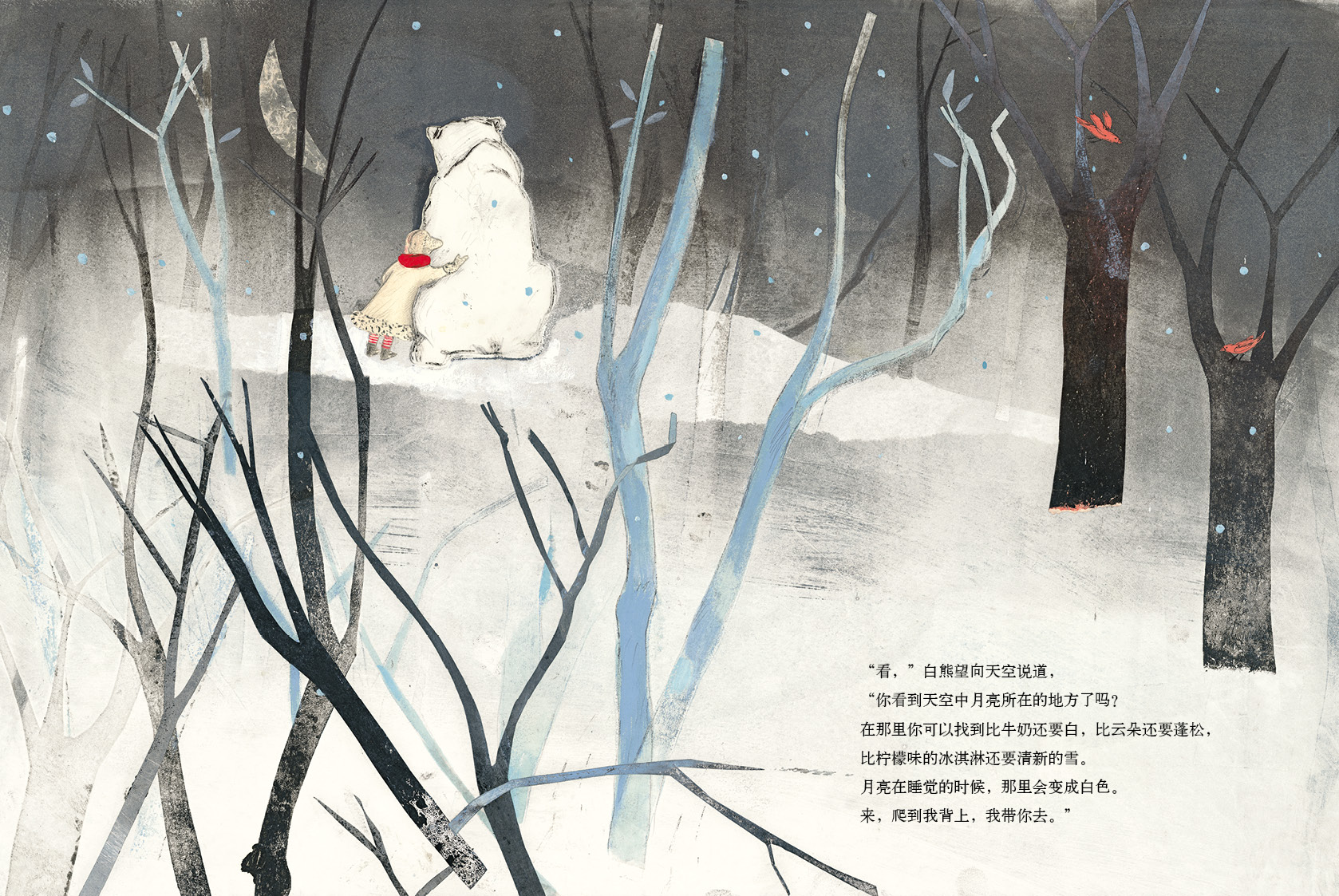 静谧雪夜中提着竹篮独自进入森林的女孩没有遇到邪恶的大灰狼,而是遇到了一只白熊。这只背着小女孩去月亮上收集雪花、之后又消失不见的白熊正是那些默默守护孩子成长的人们;虽然小女孩收集的雪还是融化了,但是白熊温暖的身影,一起在雪中嬉戏的回忆却不会融化,这正是每个成人能给予孩子的最好的礼物;小女孩亲手为白熊系上的那条带着自己温热体温的红色围巾,也是孩子给予的成人最好的礼物。
