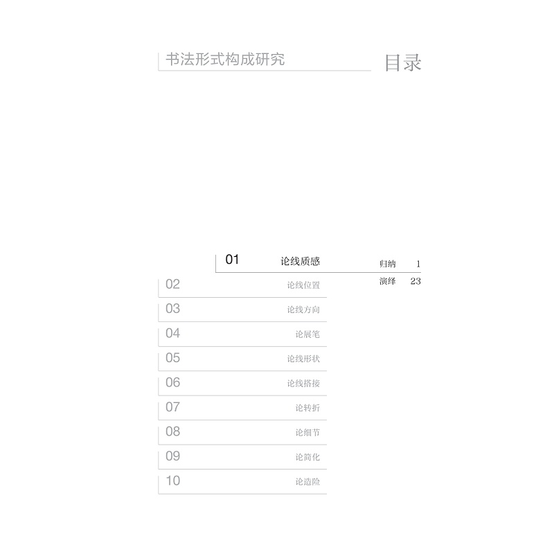 本书对书法形式的构成要素、各要素的视觉效应及文化指涉、构成的基本原理、构成的表意规律、形式与风格的适应性等问题展开具体深入的研究。由十个专题研究构成:论线位置、论线方向、论线形状、论展笔、论线质感、论简化、论线搭接、论转折、论细节、论造险。 与同类图书相比,本书的鲜明特色在于: 1、突破同类研究囿于某家某帖的技法考察的狭隘视野,致力于书法形式构成普遍规律的探寻;2、把书法技法研究的旧范式与形式构成研究的新范式结合起来,力争一加一大于二; 3、归纳与演绎相结合,归纳立足作品提炼要义,演绎贯穿不变之道和变化之术。