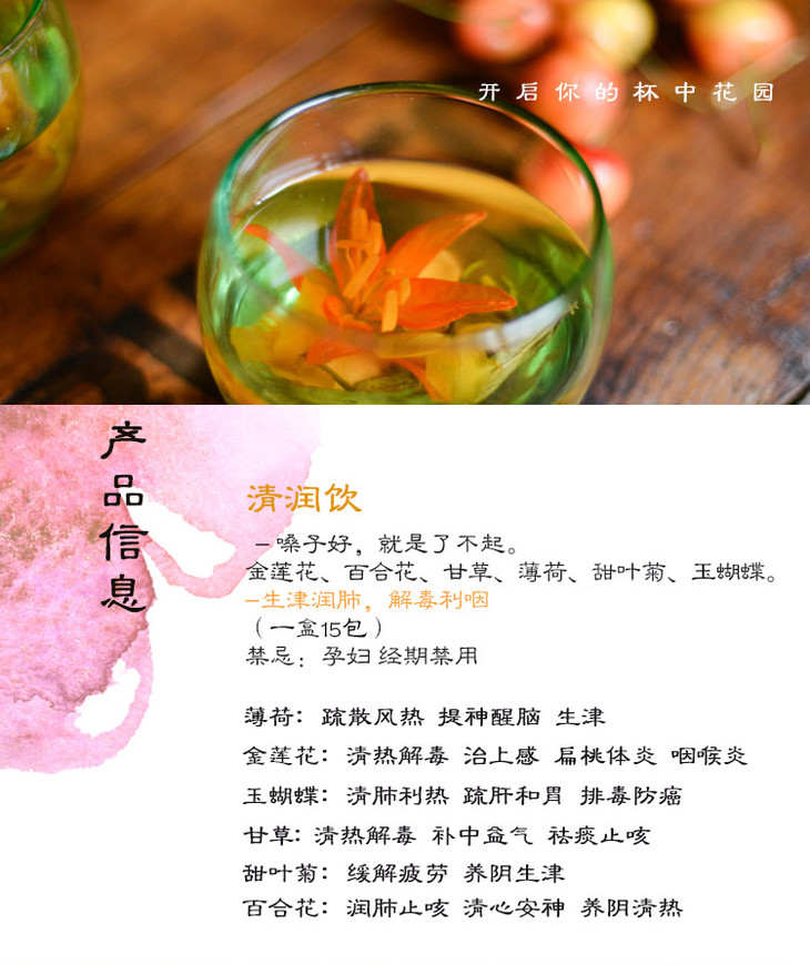 原料:金莲花、百合花、玉蝴蝶、甜叶菊、薄荷、甘草