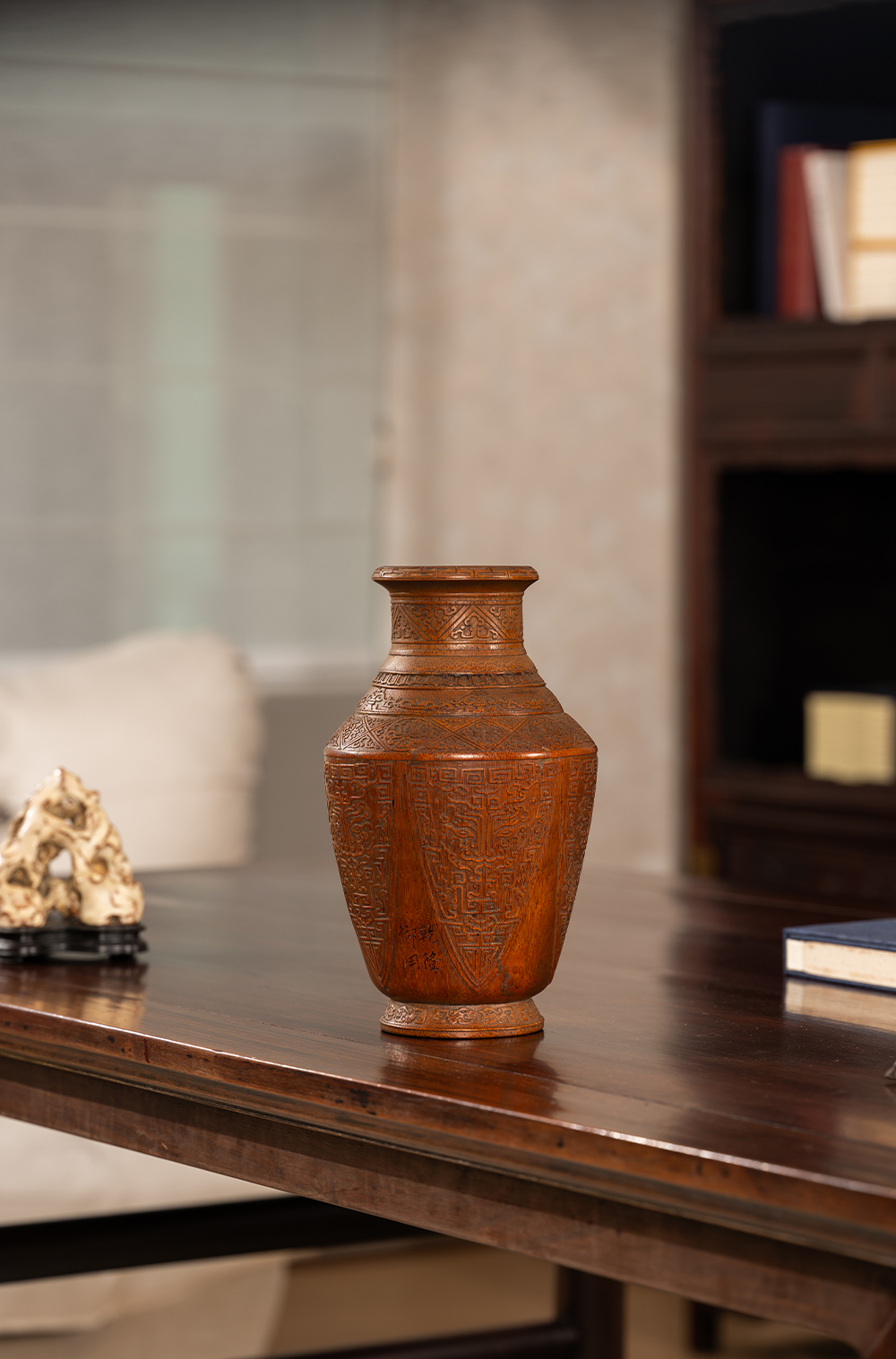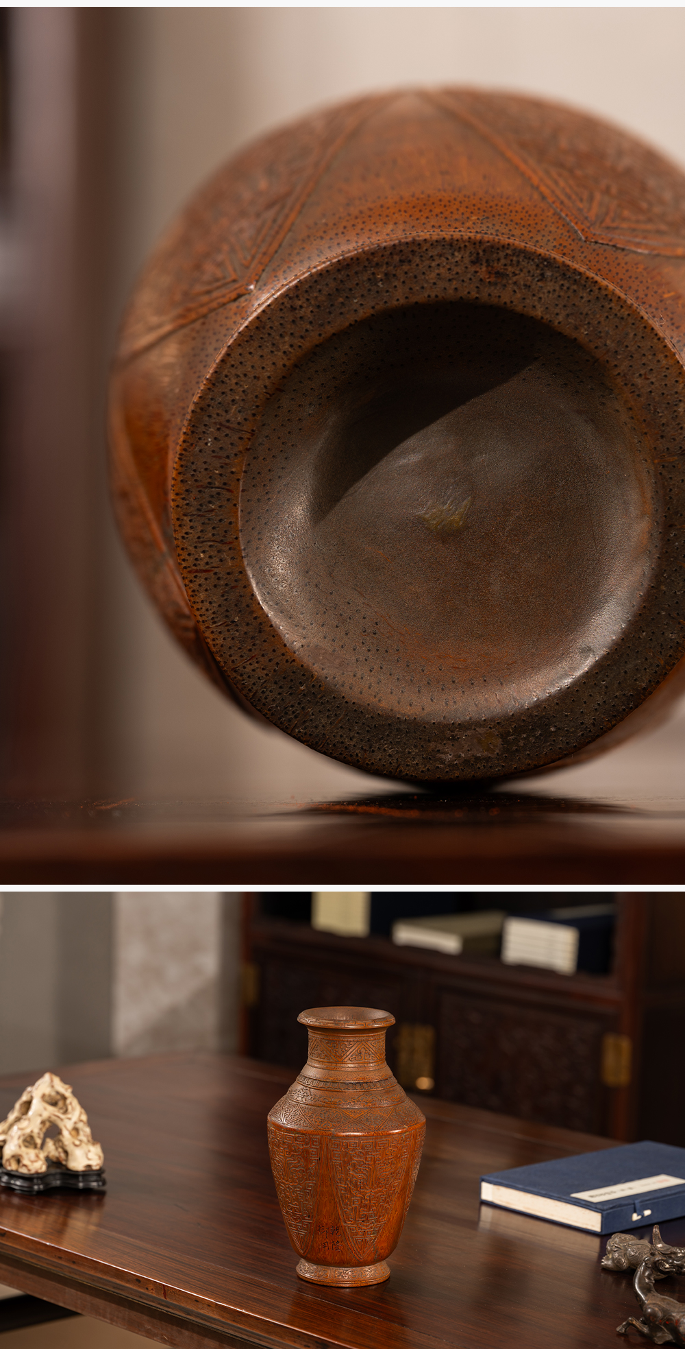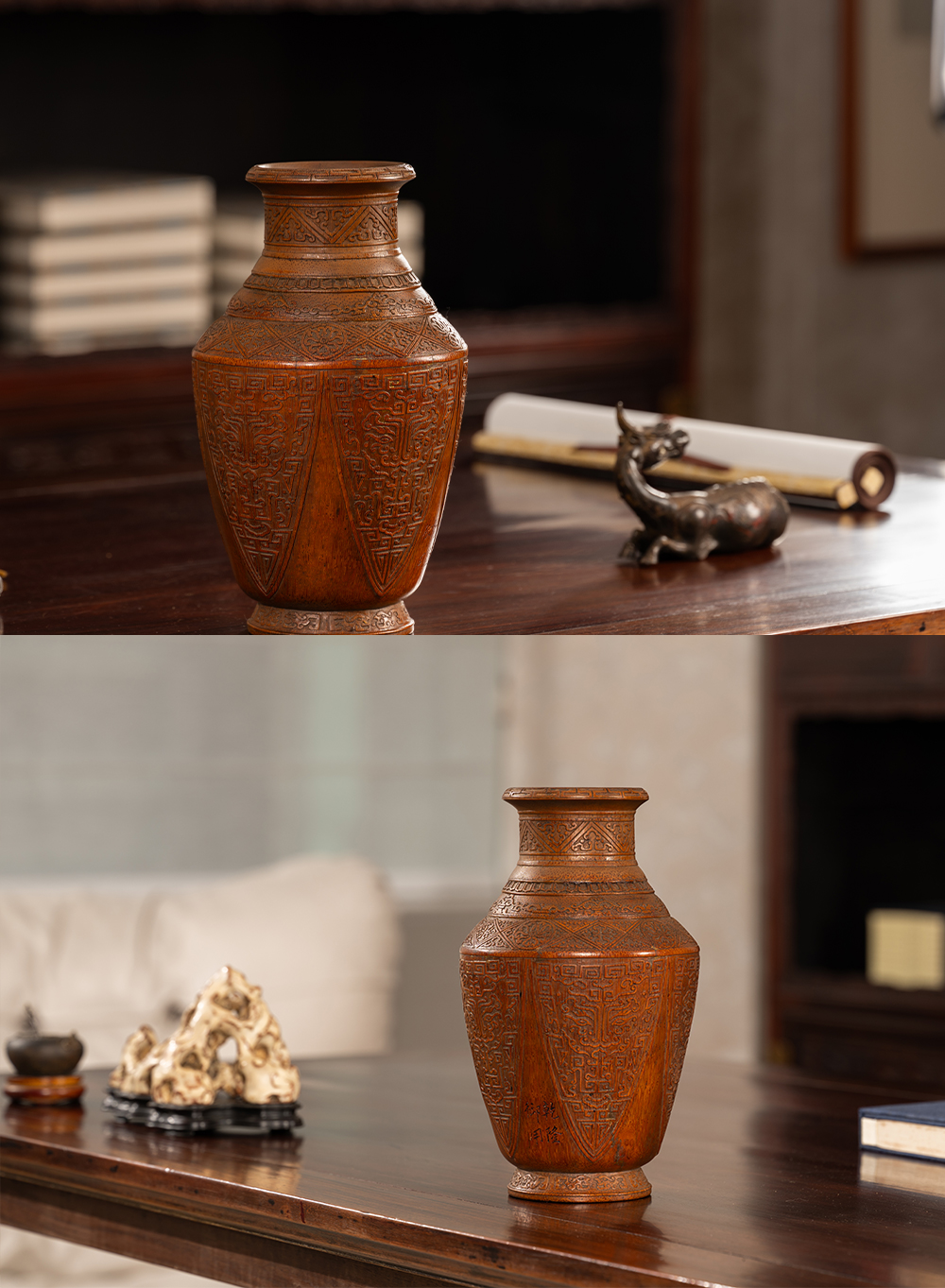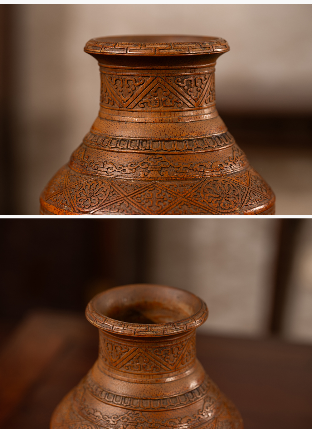 清 竹雕蕉叶兽面纹赏瓶