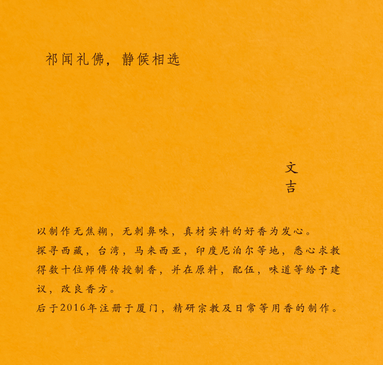 - 初有发心,以香为业;遂遍访诸地,觅学香方,得师授业,日日精学不辍,有所得;后,于闽地始作“文吉”。
