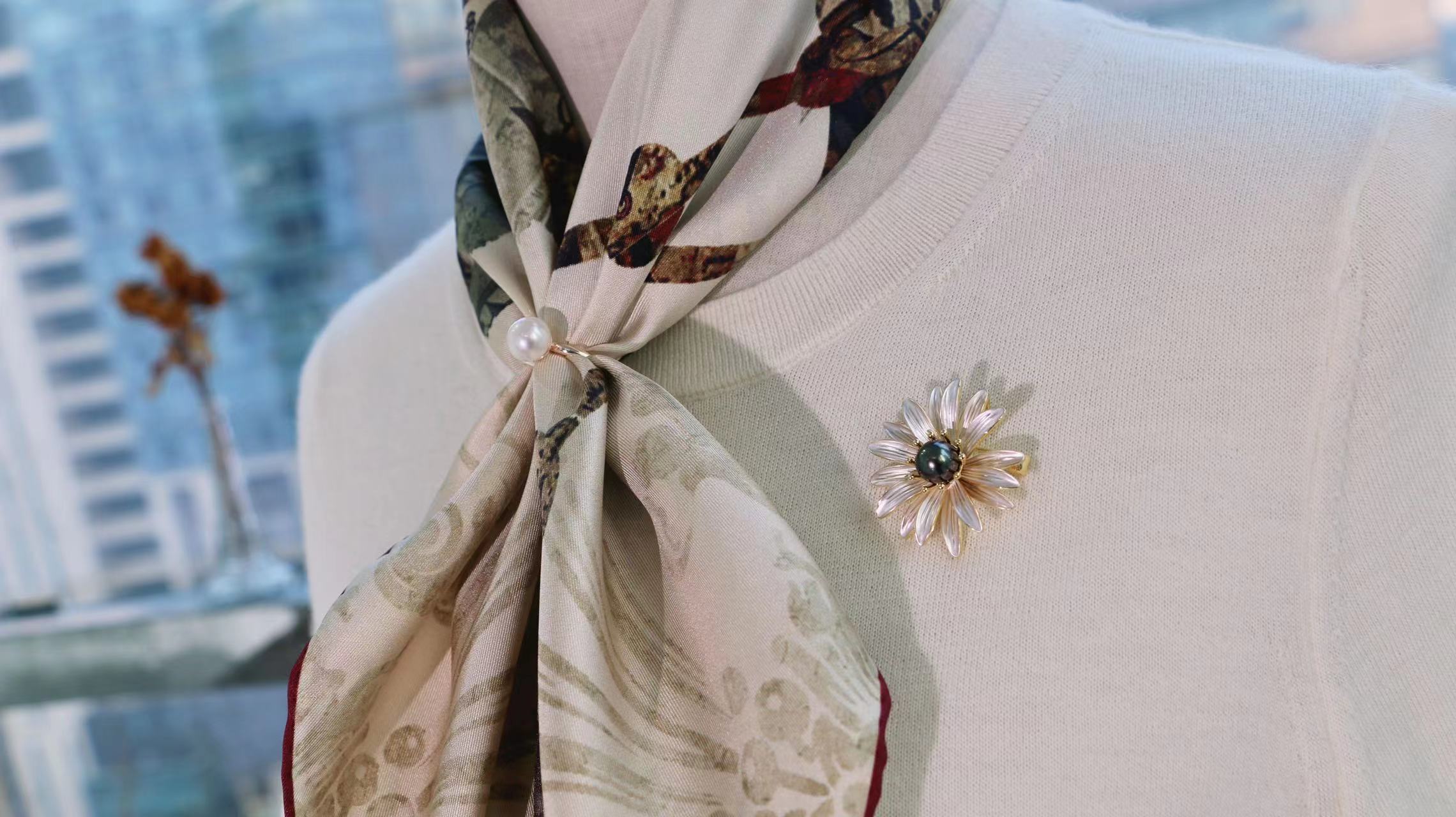 【甄珠贝·时尚高级感系列】70*70cm双面异色【马头碎片】丝巾和【雏菊】胸花和珍珠丝巾扣三件套礼盒