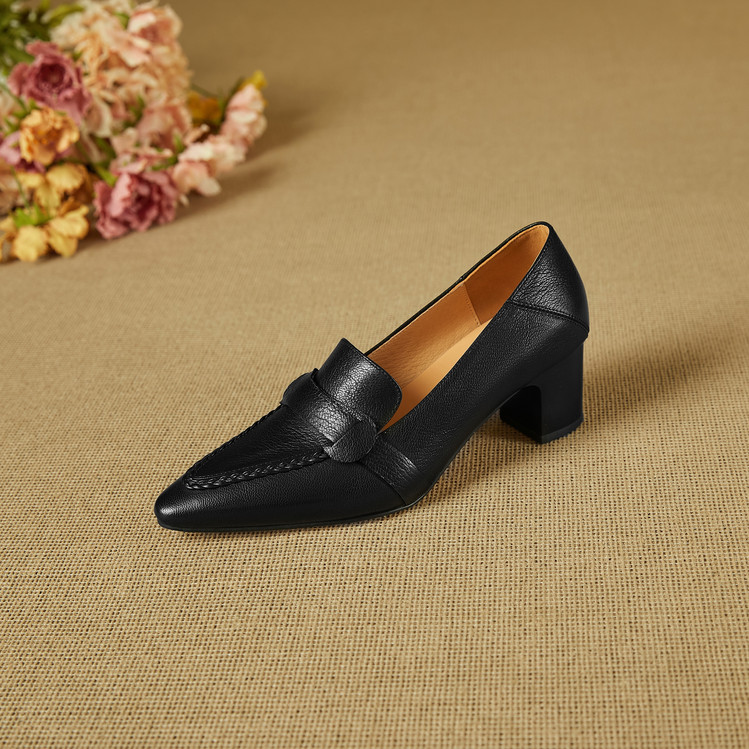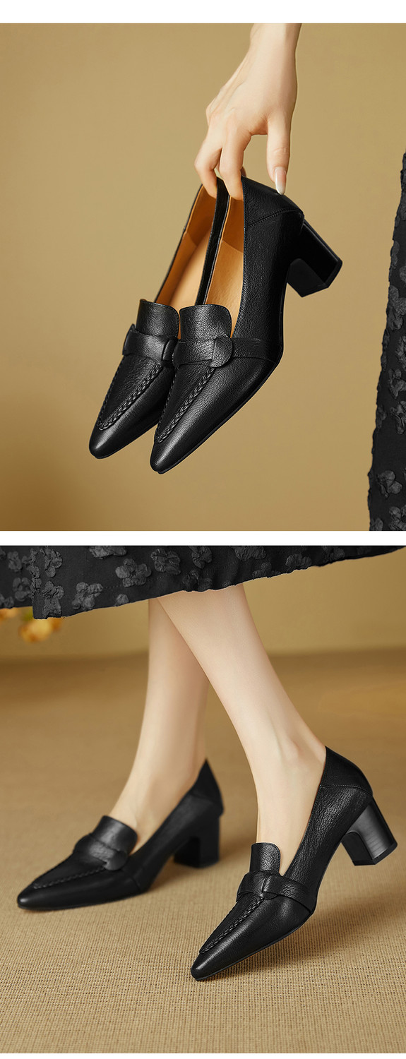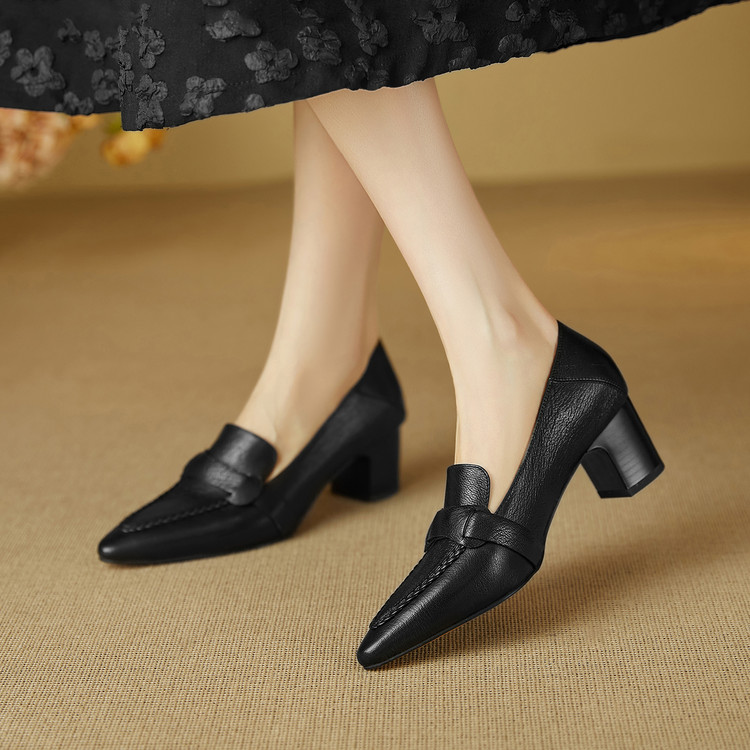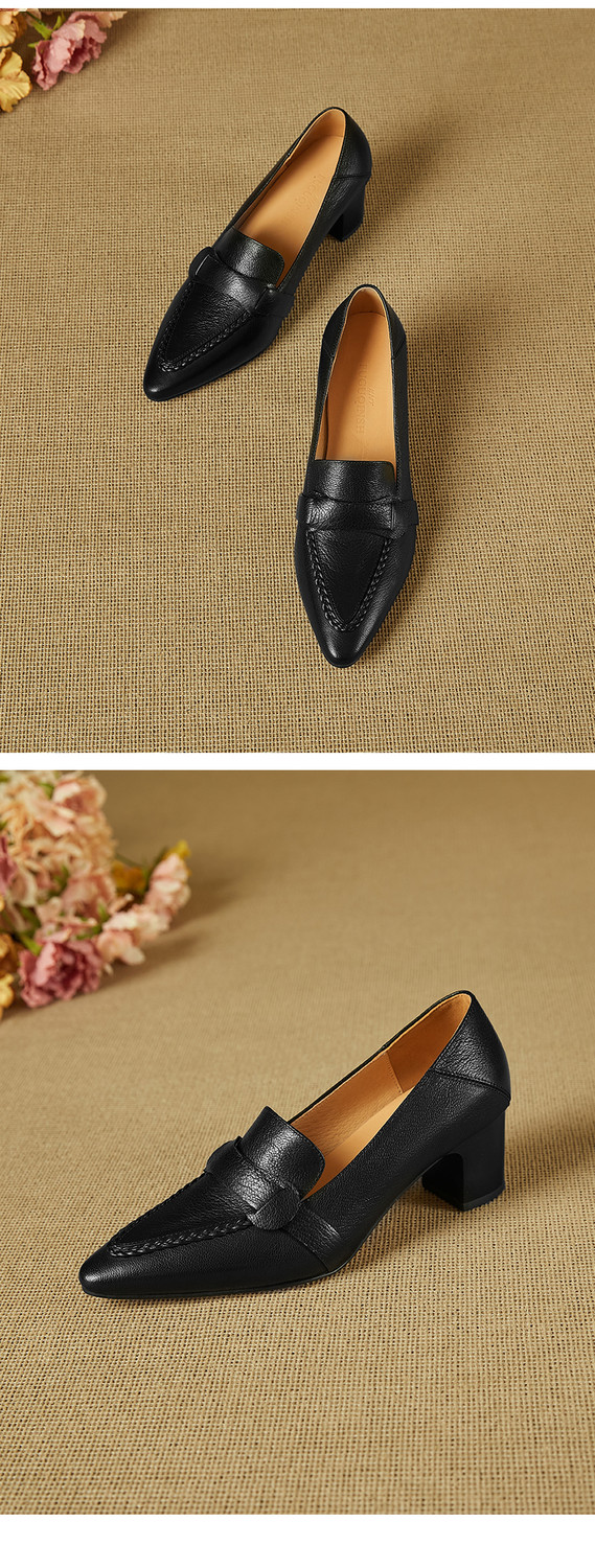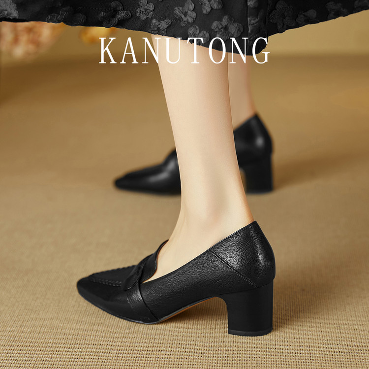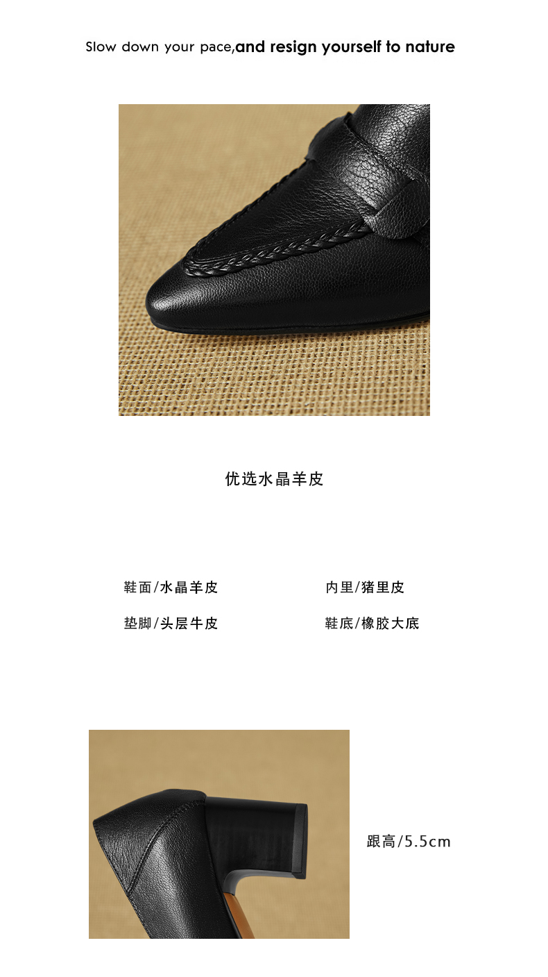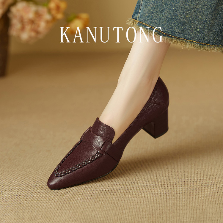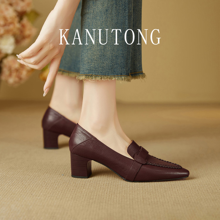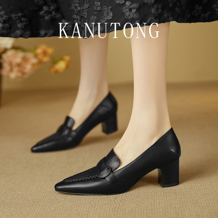 【预售5天】5.5cm复古简约粗跟尖头高跟鞋真皮浅口通勤职业女鞋KNTNX&KT1808