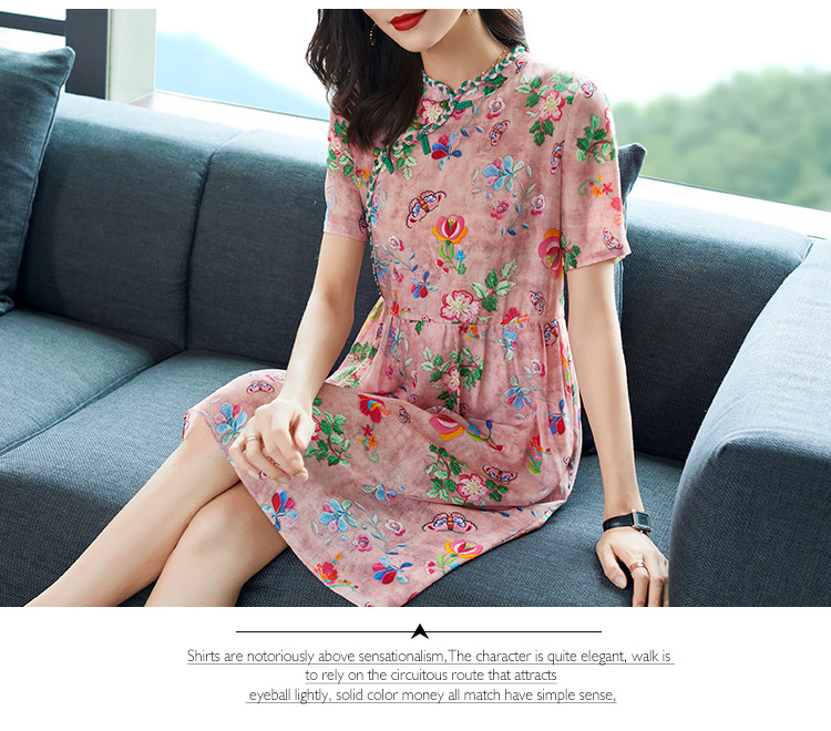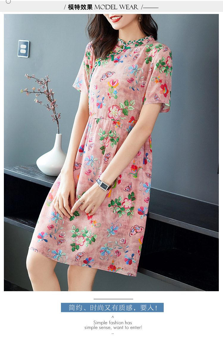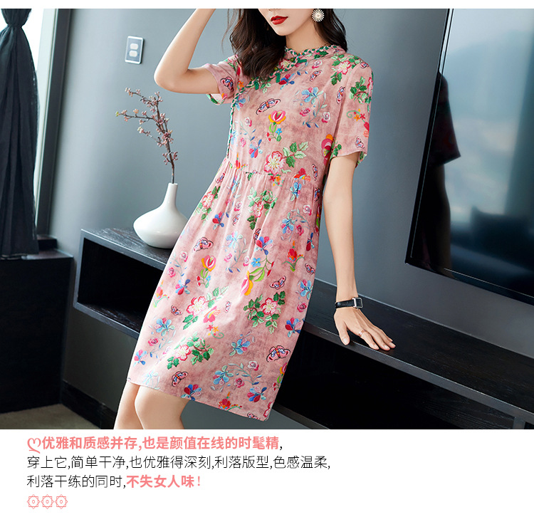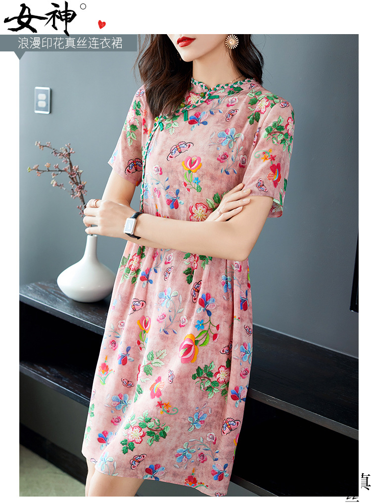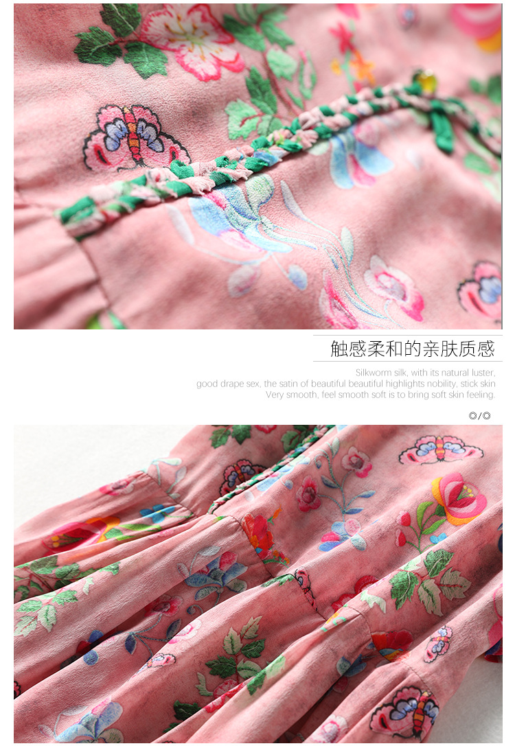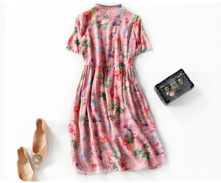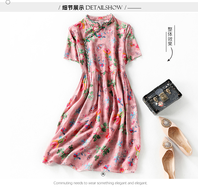 CS-72843新品气质复古风手工编织花朵印花短袖真丝连衣裙