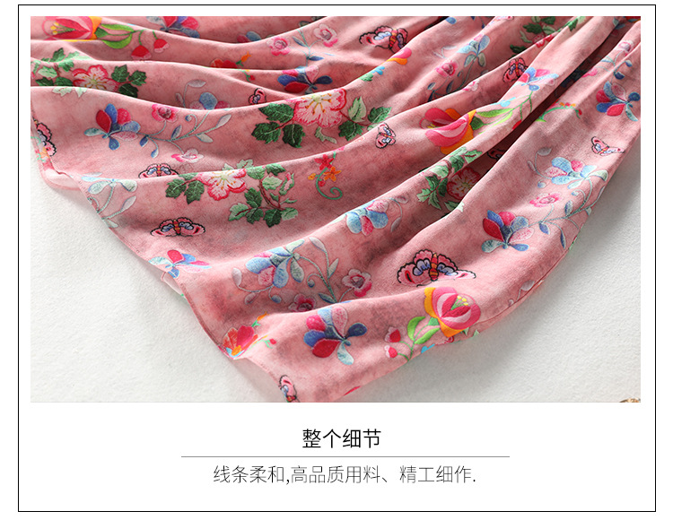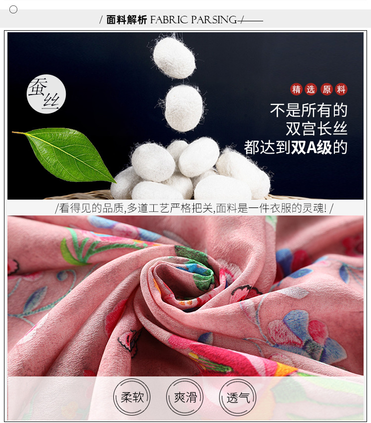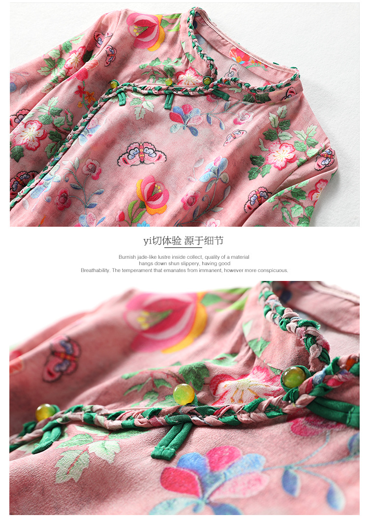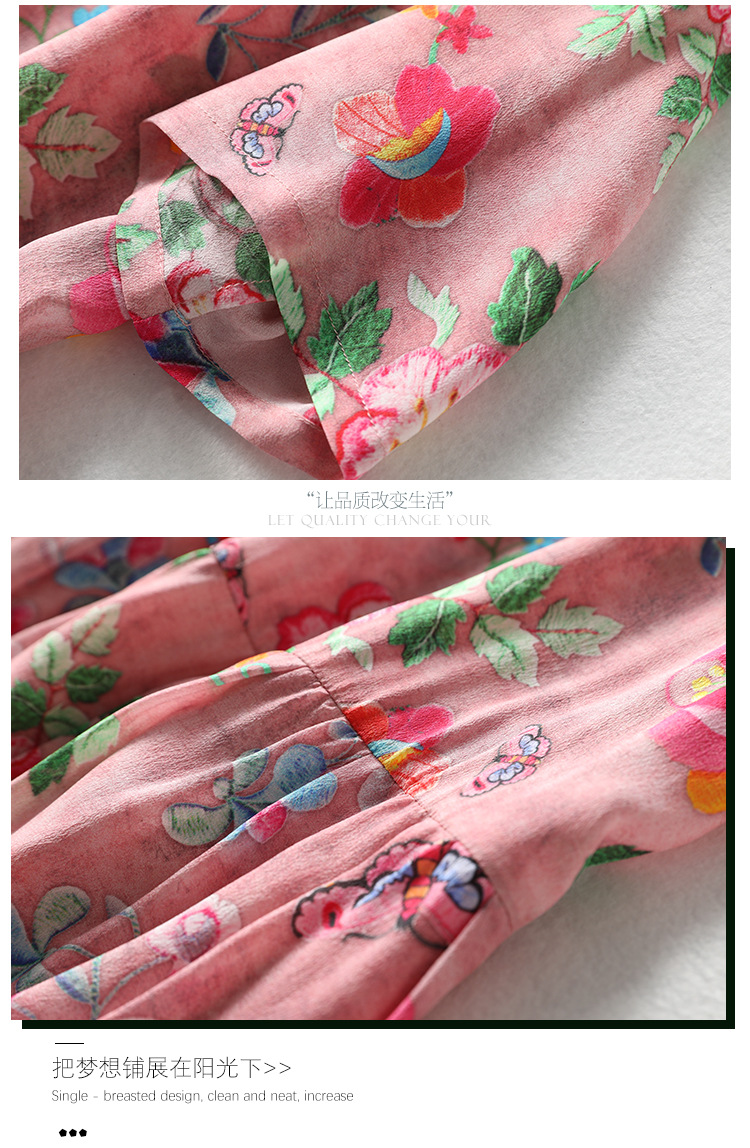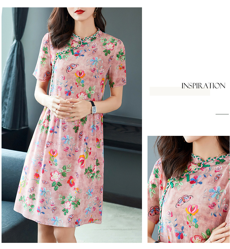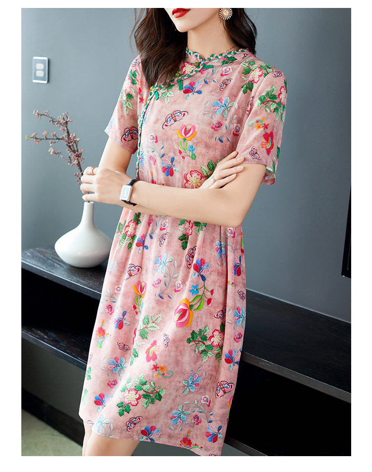 CS-72843新品气质复古风手工编织花朵印花短袖真丝连衣裙