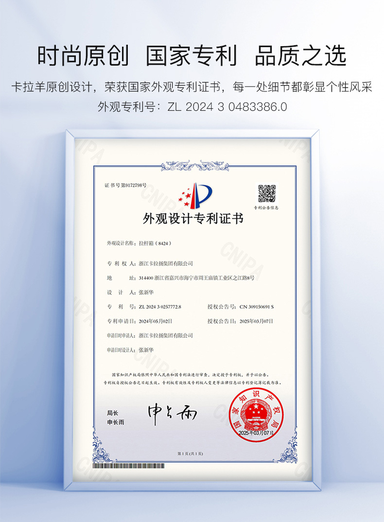 - 浙江卡拉扬集团有限公司专注箱包27年,旗下有卡拉羊和9UM两大品牌,有浙江海宁和江苏沭阳两大工厂,拥有多项知识产权,是集智能化、设计生产、品牌营销为一体的综合型企业。