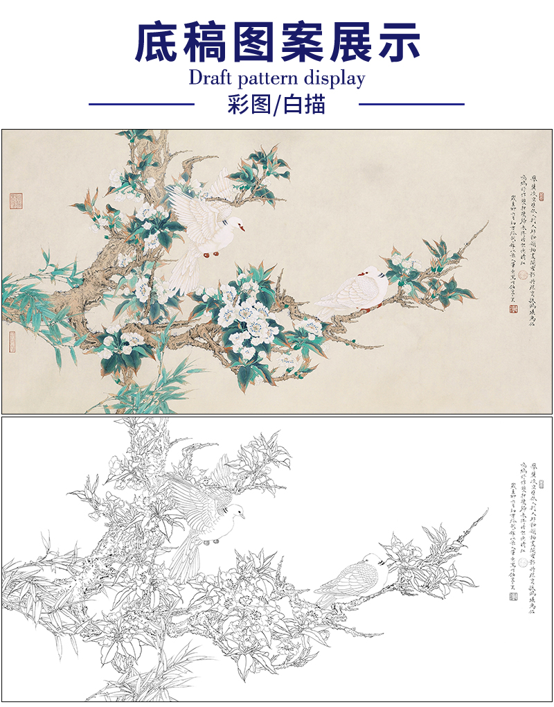 任重花鸟工笔画白描底稿《雪梨斑鸠》梨花临摹勾线高清打印稿RD42