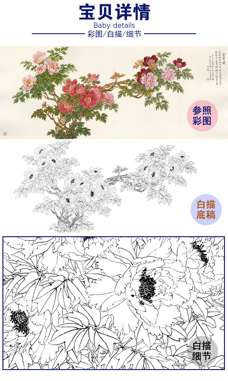 横幅工笔花鸟白描底稿-牡丹-金鸿钧富贵图-JR18