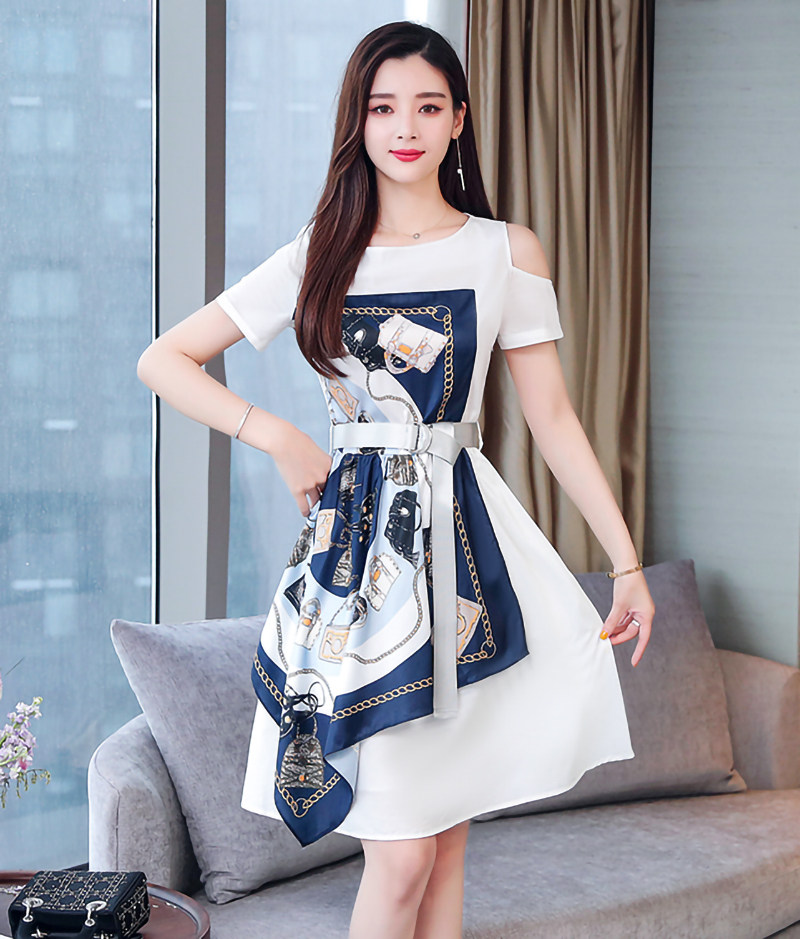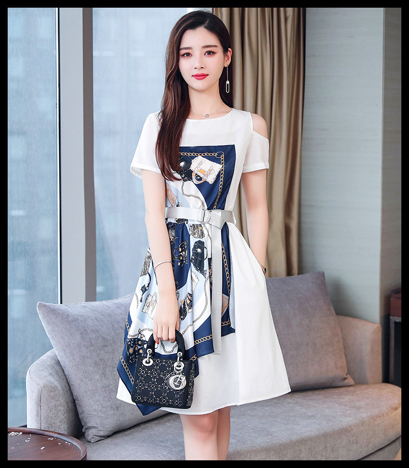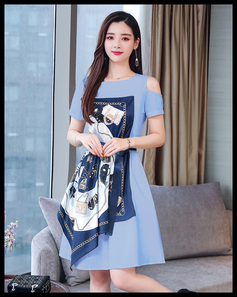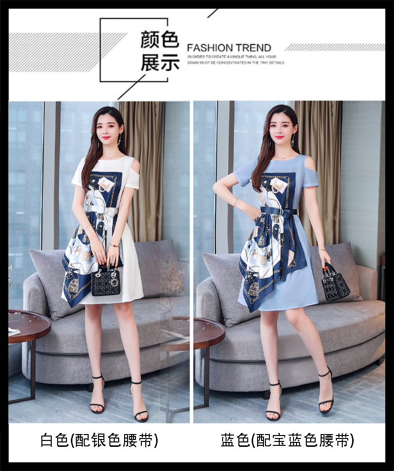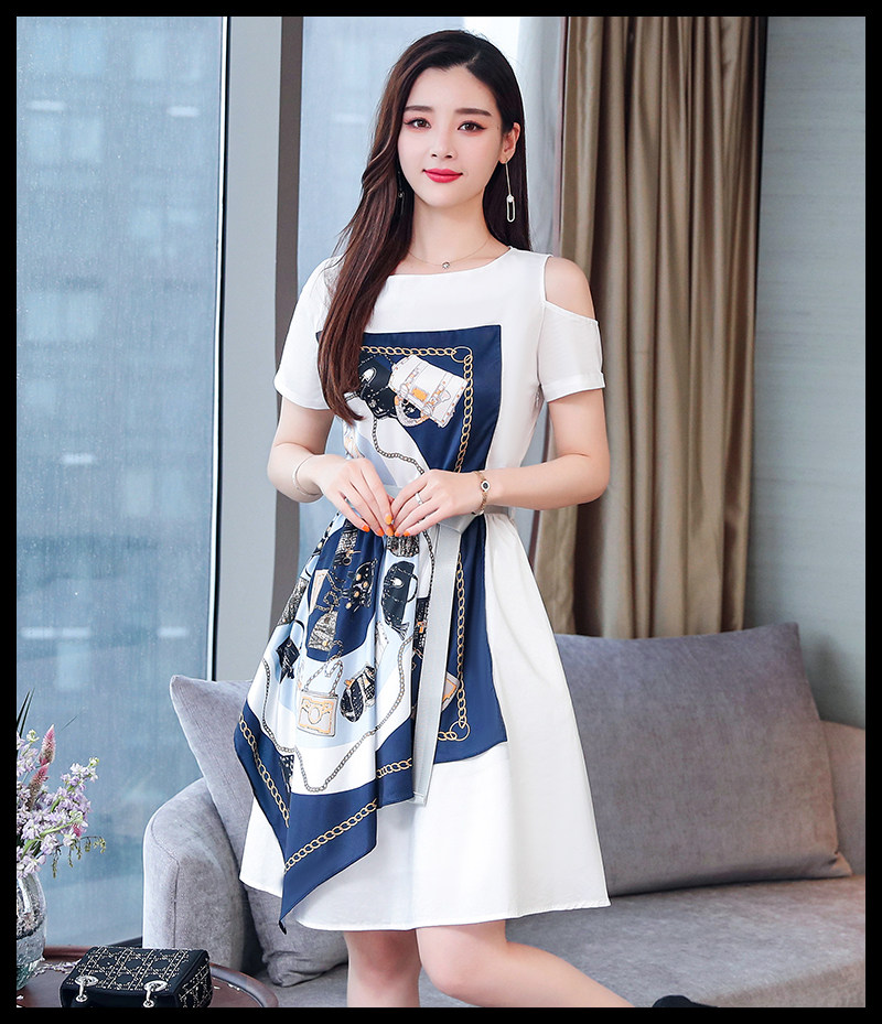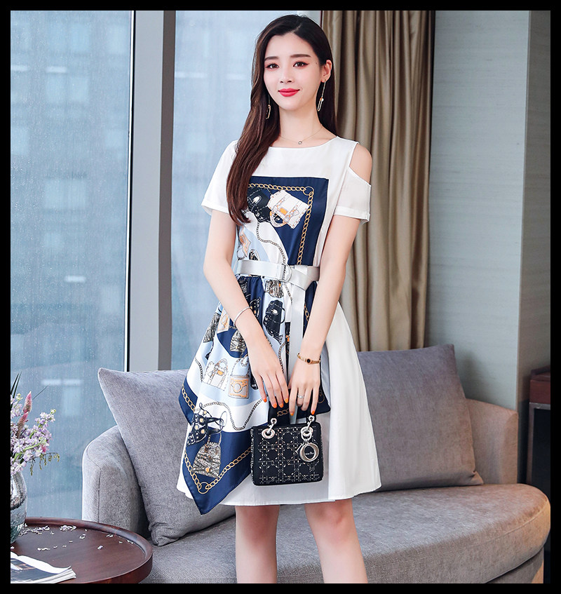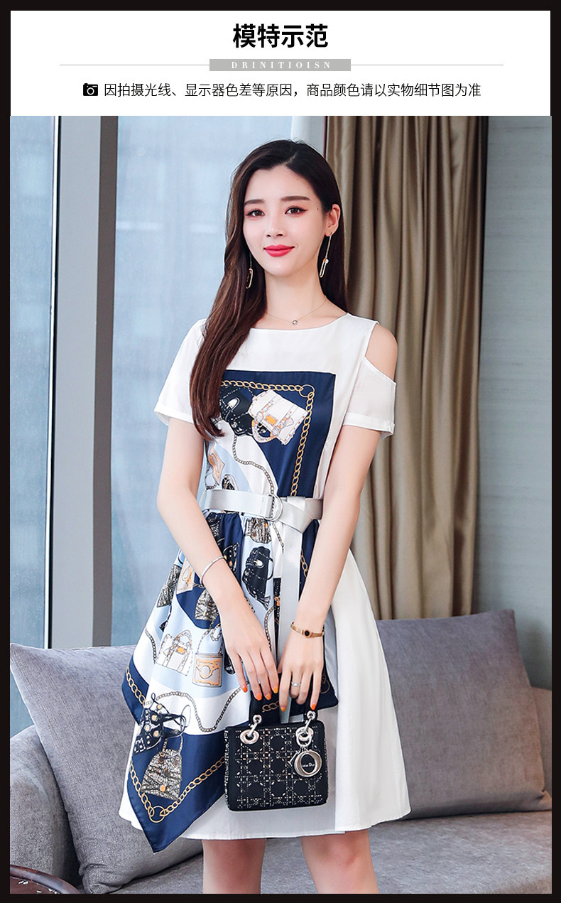 HZN-DM6162夏季新款露肩设计感收腰拼接印花丝巾短袖连衣裙 XCX