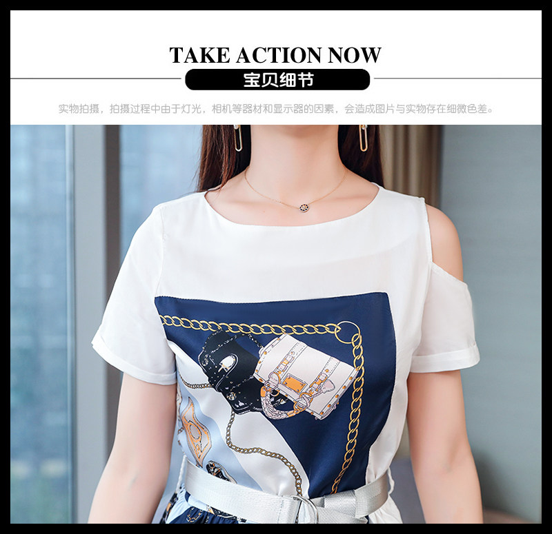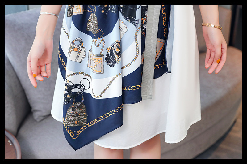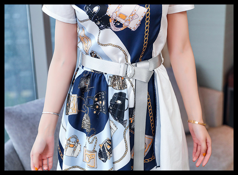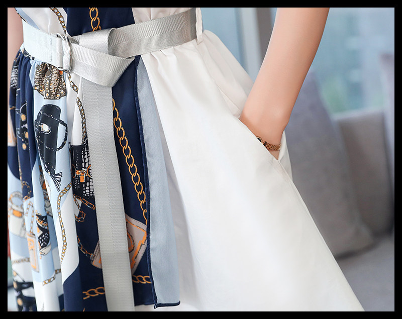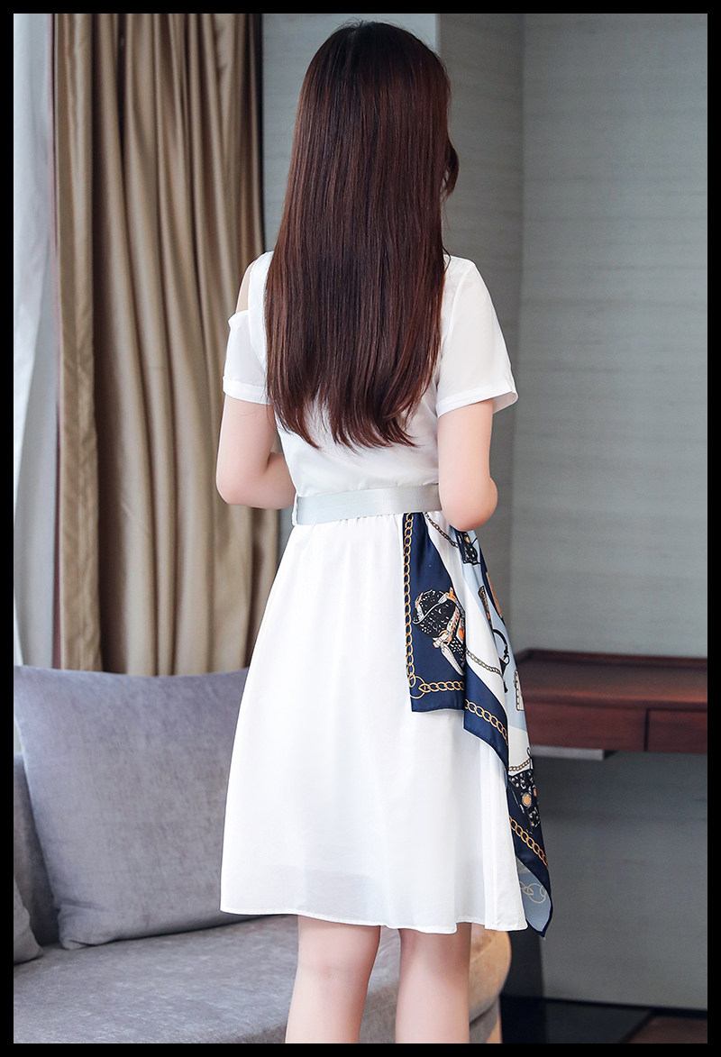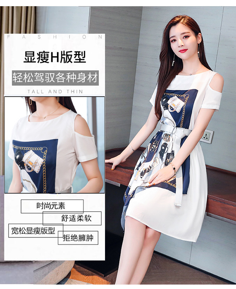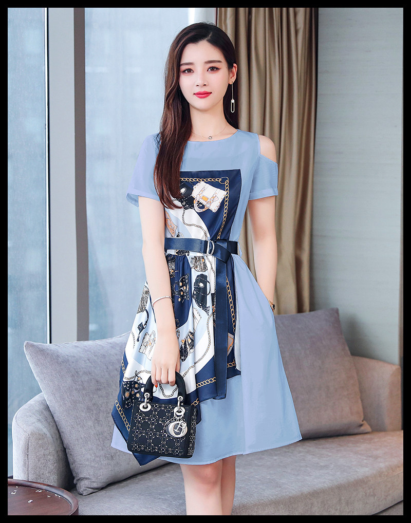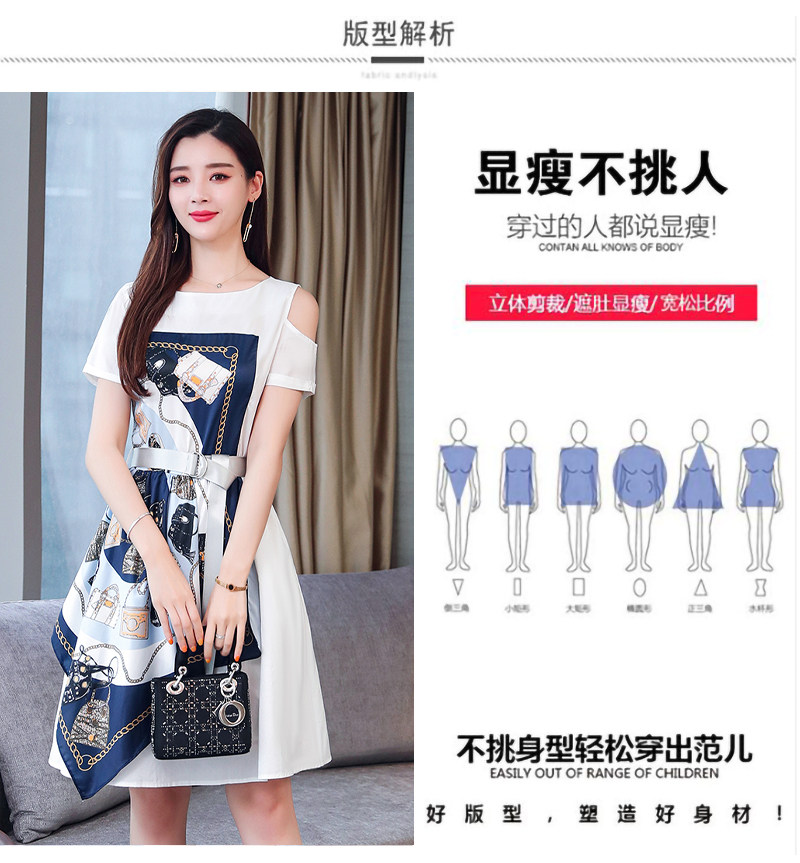 HZN-DM6162夏季新款露肩设计感收腰拼接印花丝巾短袖连衣裙 XCX