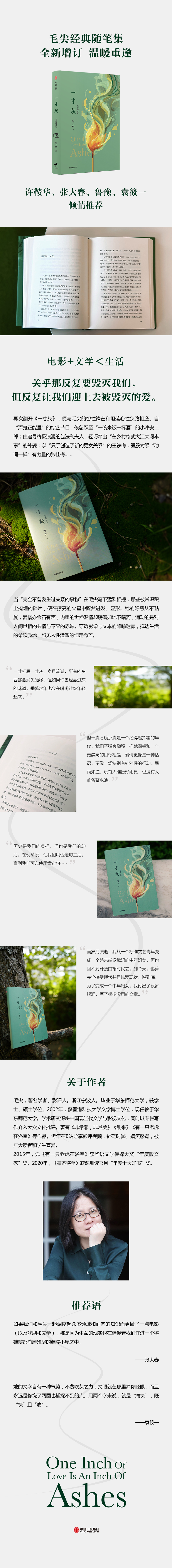 “一寸相思一寸灰。岁月流逝,有的东西都会消失殆尽,但如果你曾经尝过灰的味道,垂暮之年也会在瞬间让你年轻起来。”《一寸灰》集结了著名专栏作家、影评人毛尖近年发表的71篇随笔。电影评论、文学评论、生活随笔等兼而有之,随手一翻即见生趣。毛尖文风犀利、语藏机锋,堪称“毒舌”,可嬉笑怒骂之间,又有“世俗的温暖”,她能不着痕迹地“将完全不曾发生过关系的事物容纳进一个魔幻的瞬间”:从黑帮片演进发现文化价值,从综艺节目开播引申至节制美学,从包法利夫人谈及“我”外婆,从美剧英剧透析七夕脱单指南……如黄裳所言“毛尖用笔之活,近时无两”。