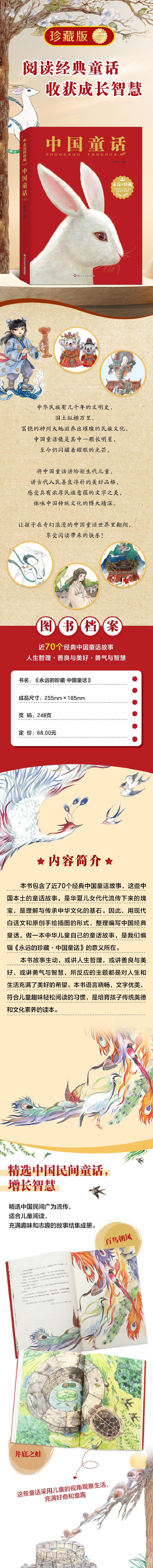 本书包含了近70个中国童话故事,这些中国本土的童话故事,是华夏儿女代代流传下来的瑰宝,是理解与传承中华文化的基石。因此,用现代白话文和原创手绘插图的形式,整理编写中国童话,做一本中华儿童自己的童话故事,是我们编辑《永远的珍藏·中国童话》的意义所在。本书故事生动,或讲人生哲理,或讲善良与美好,或讲勇气与智慧,所反应的主题都是对人生和生活充满了美好的希望。该书语言晓畅,文字优美,符合儿童趣味轻松阅读的习惯,是培育孩子传统美德和文化素养的优秀读本。