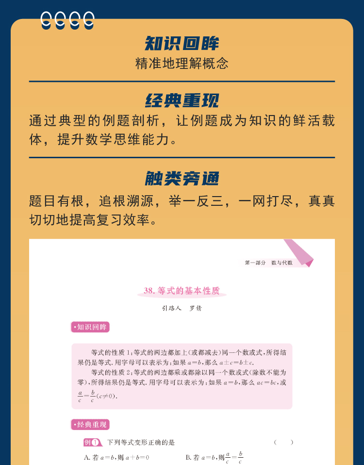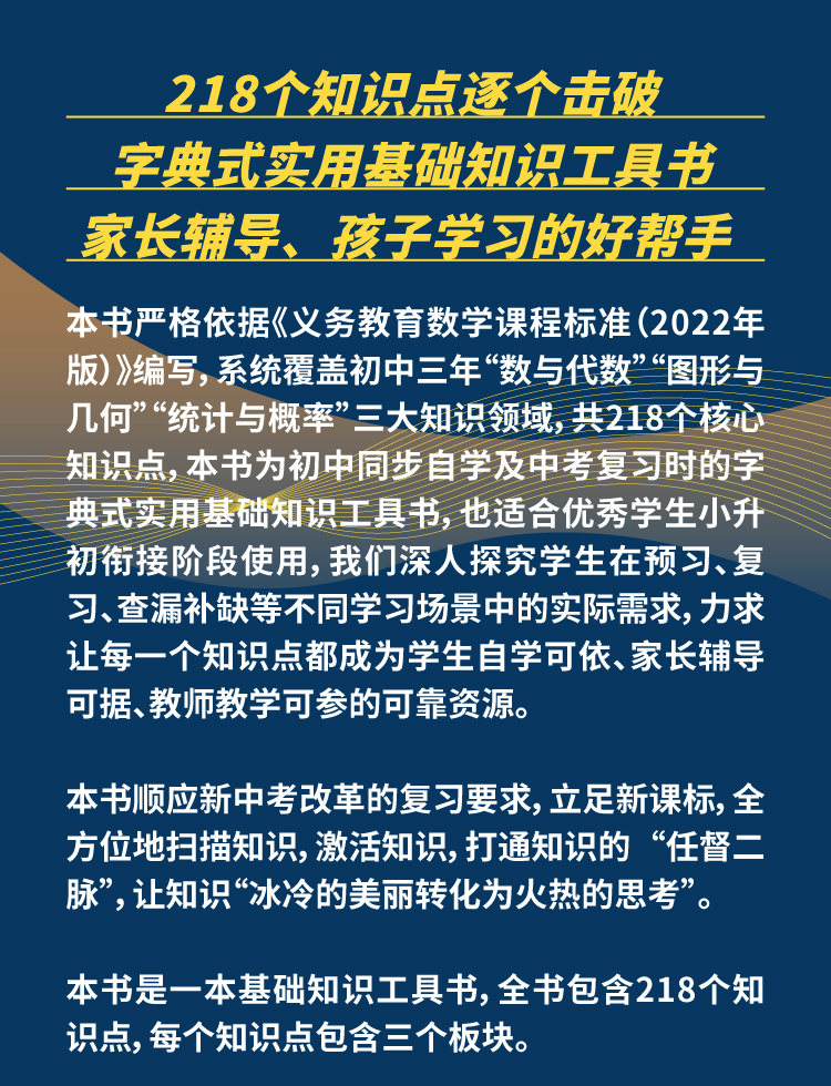 中考数学复习的落脚点在哪里?突破点在哪里?如何高效地复习,这就是我们迫切需要解决的中考数学复习之问。本书顺应新中考改革的复习要求,立足新课标,全方位地扫描知识,激活知识,打通知识的 “任督二脉”,让知识“冰冷的美丽转化为火热的思考”.本书是一本基础知识工具书,全书包含近200个知识点,每个知识点包含三个板块:知识回眸:精准地理解概念;经典重现:通过典型的例题剖析,让例题成为知识的鲜活载体,提升数学思维能力;触类旁通:题目有根,追根溯源,举一反三,一网打尽,真真切切地提高复习效率。