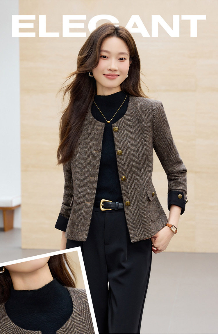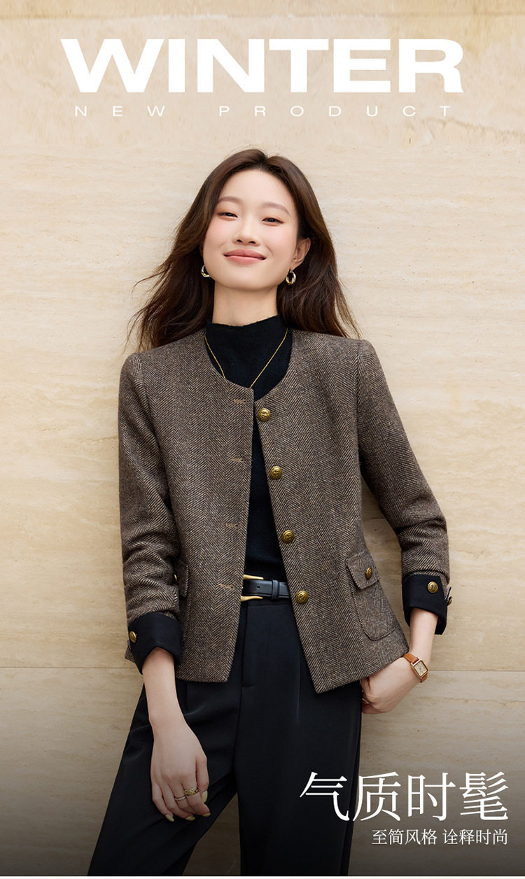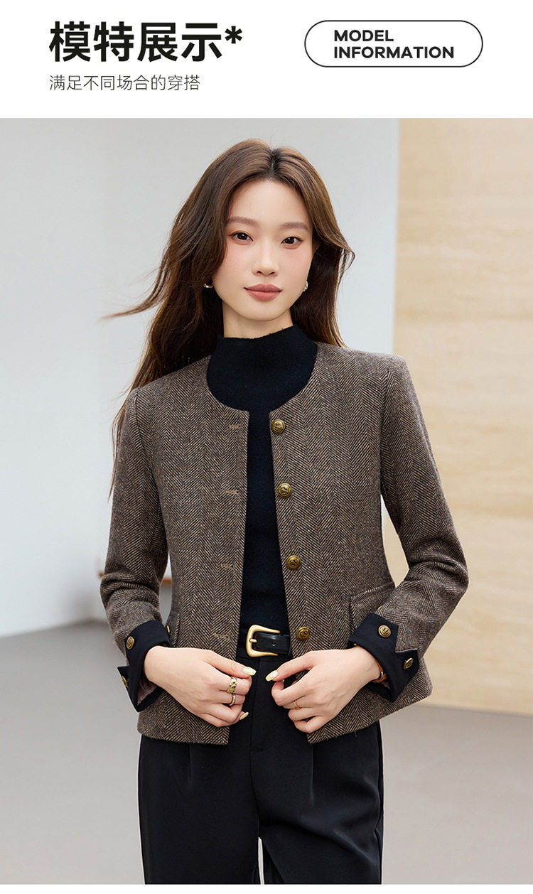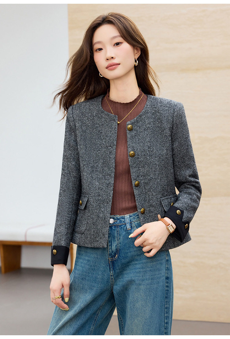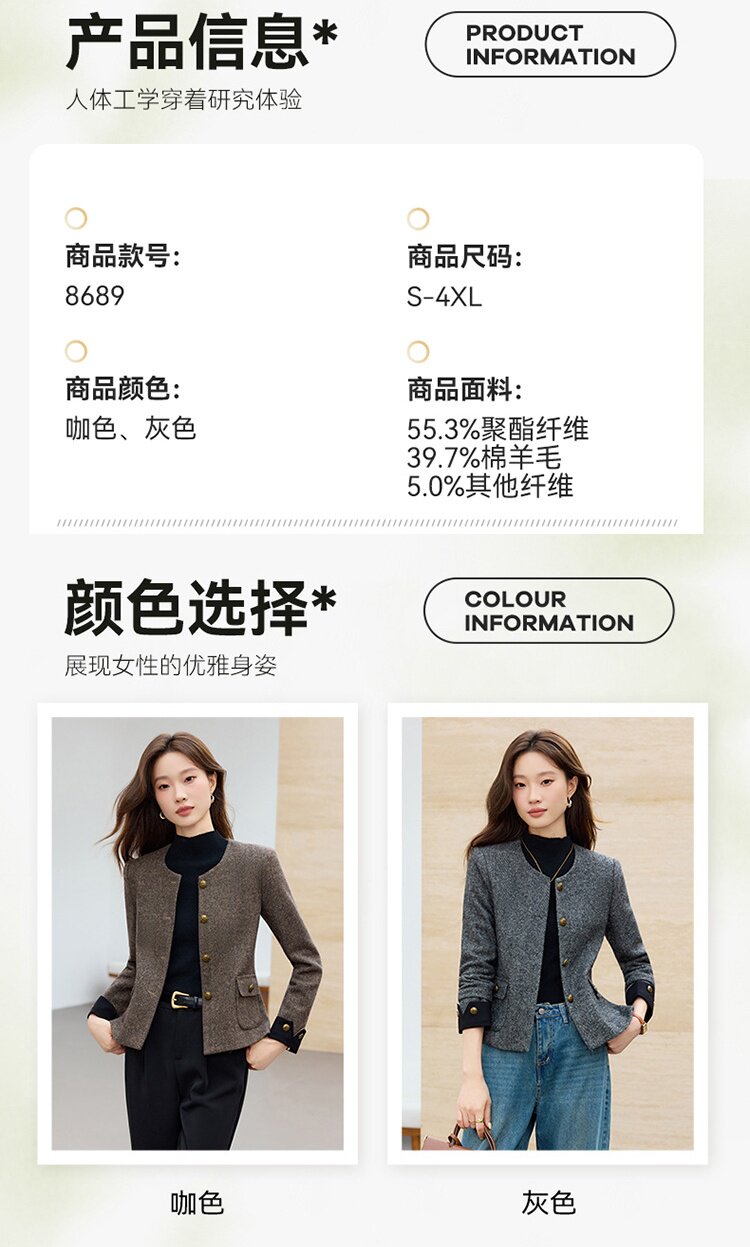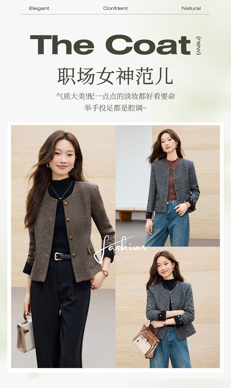 「自」全新升级【铂金会员183/天猫239/差价56】(01303)洛诗琳气质小香风西装外套女2026早春新款亮丝圆领拼色上衣