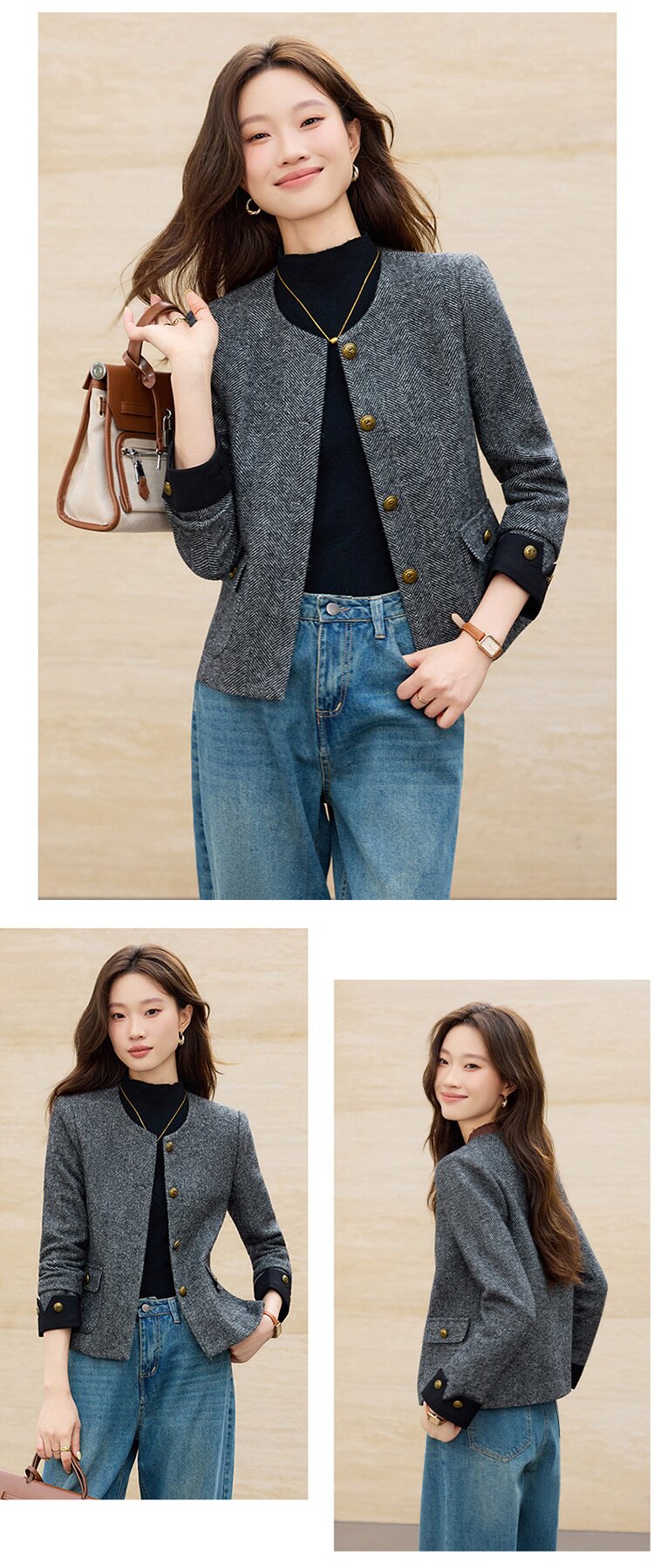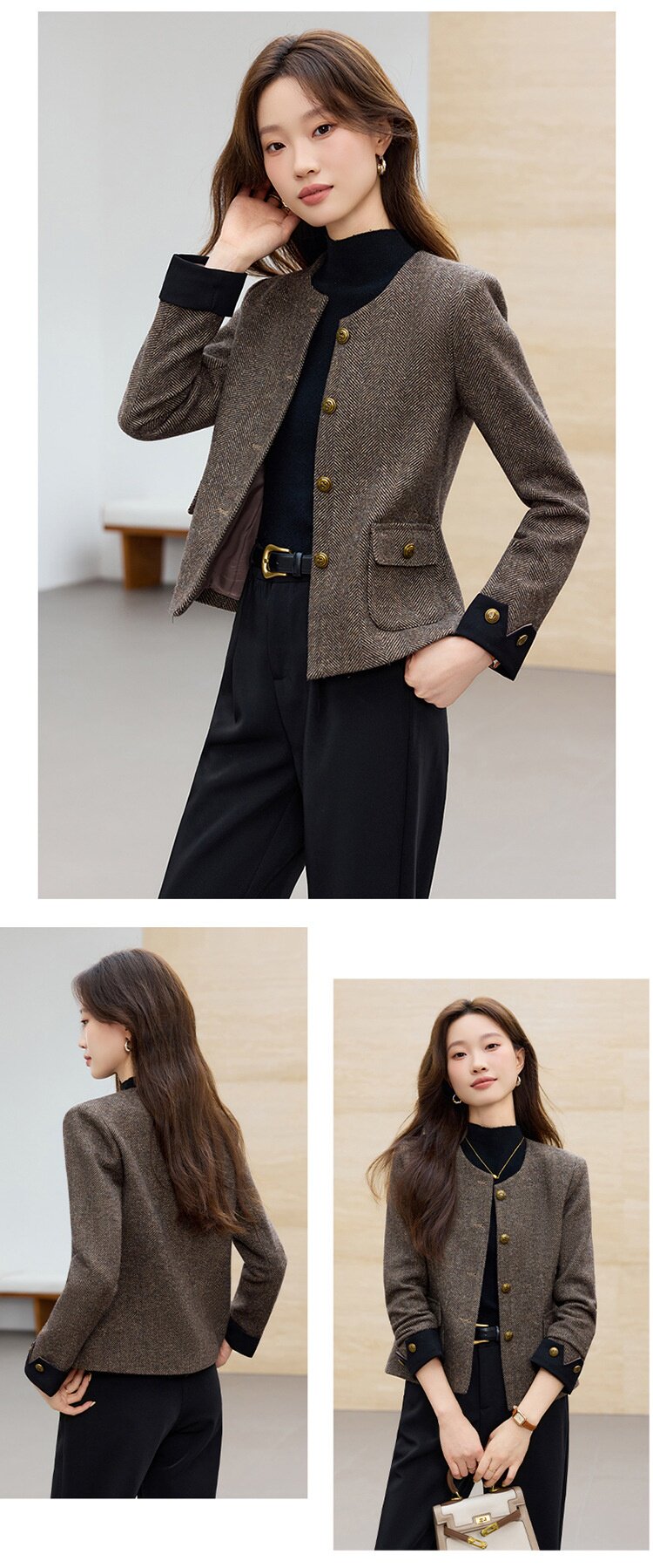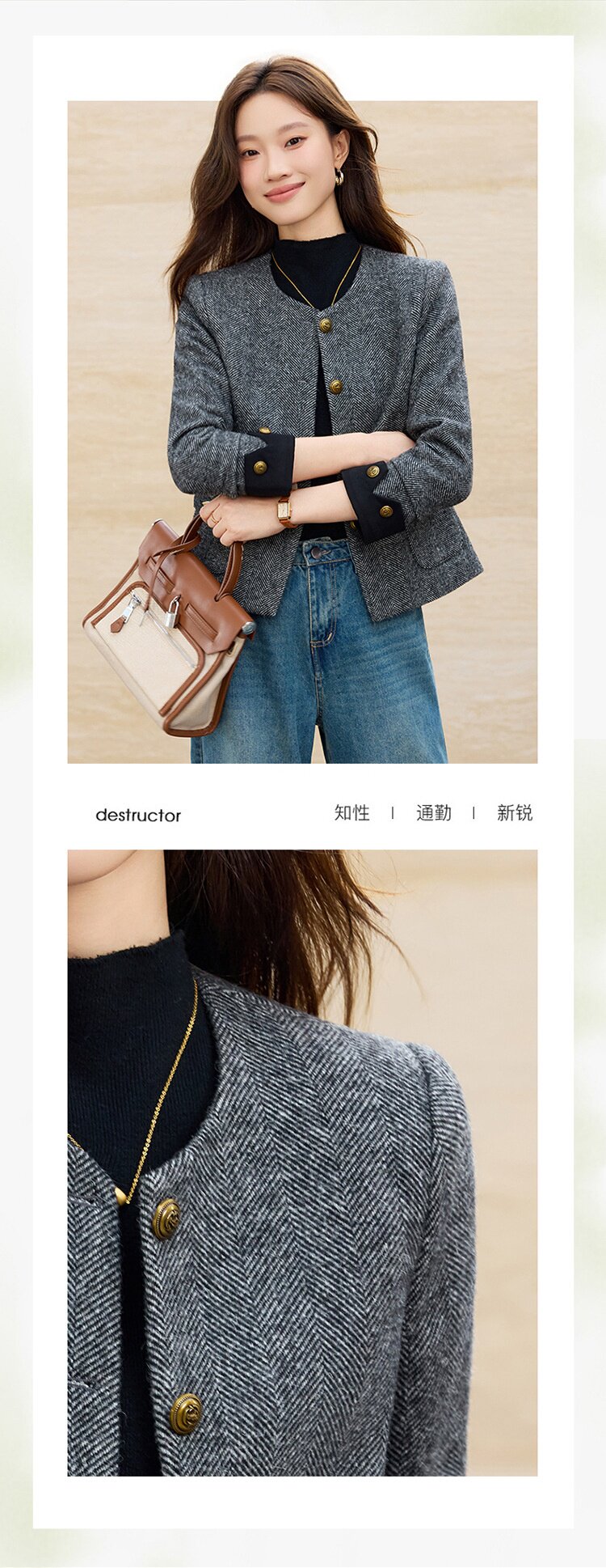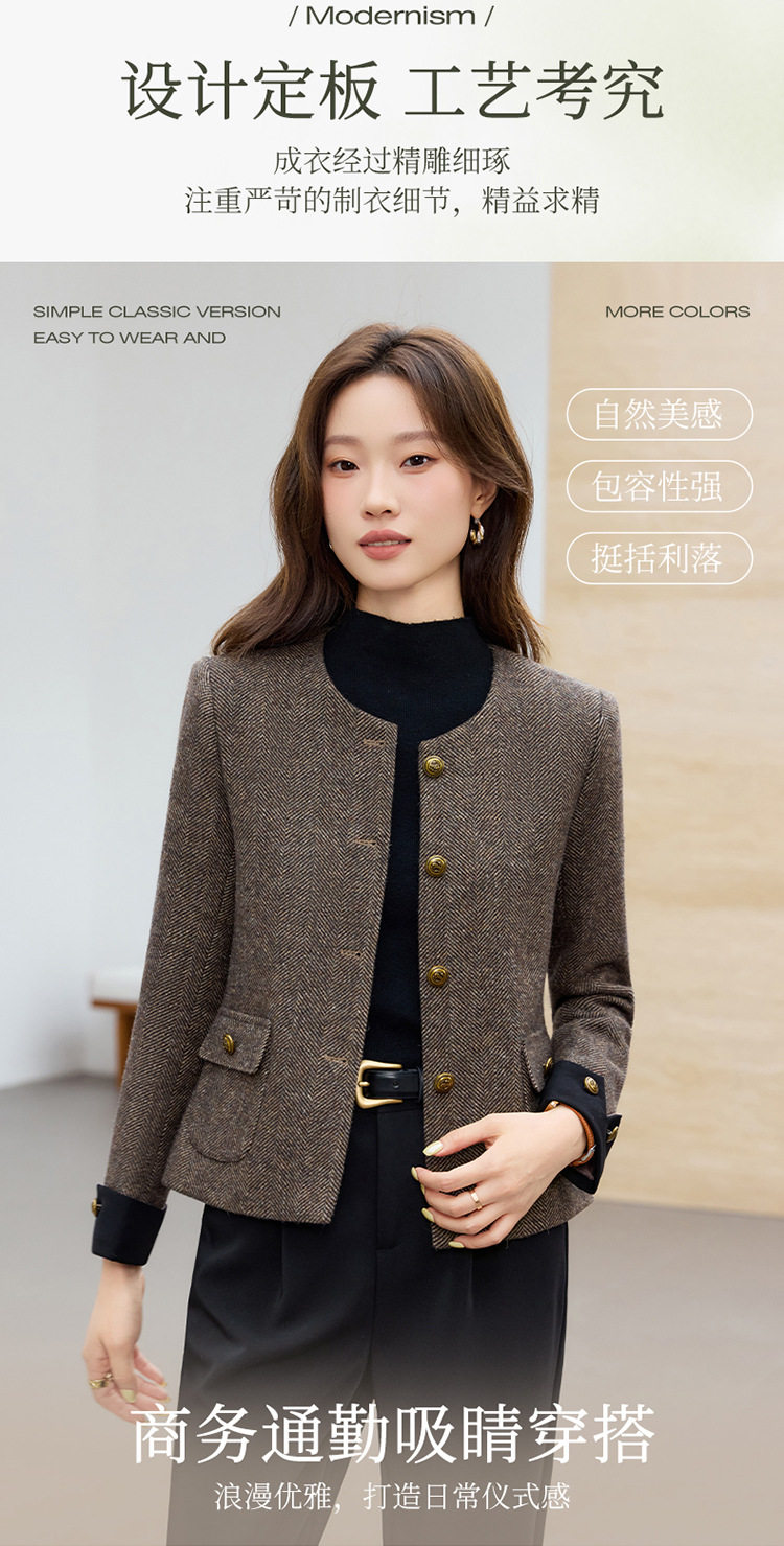 「自」全新升级【铂金会员183/天猫239/差价56】(01303)洛诗琳气质小香风西装外套女2026早春新款亮丝圆领拼色上衣