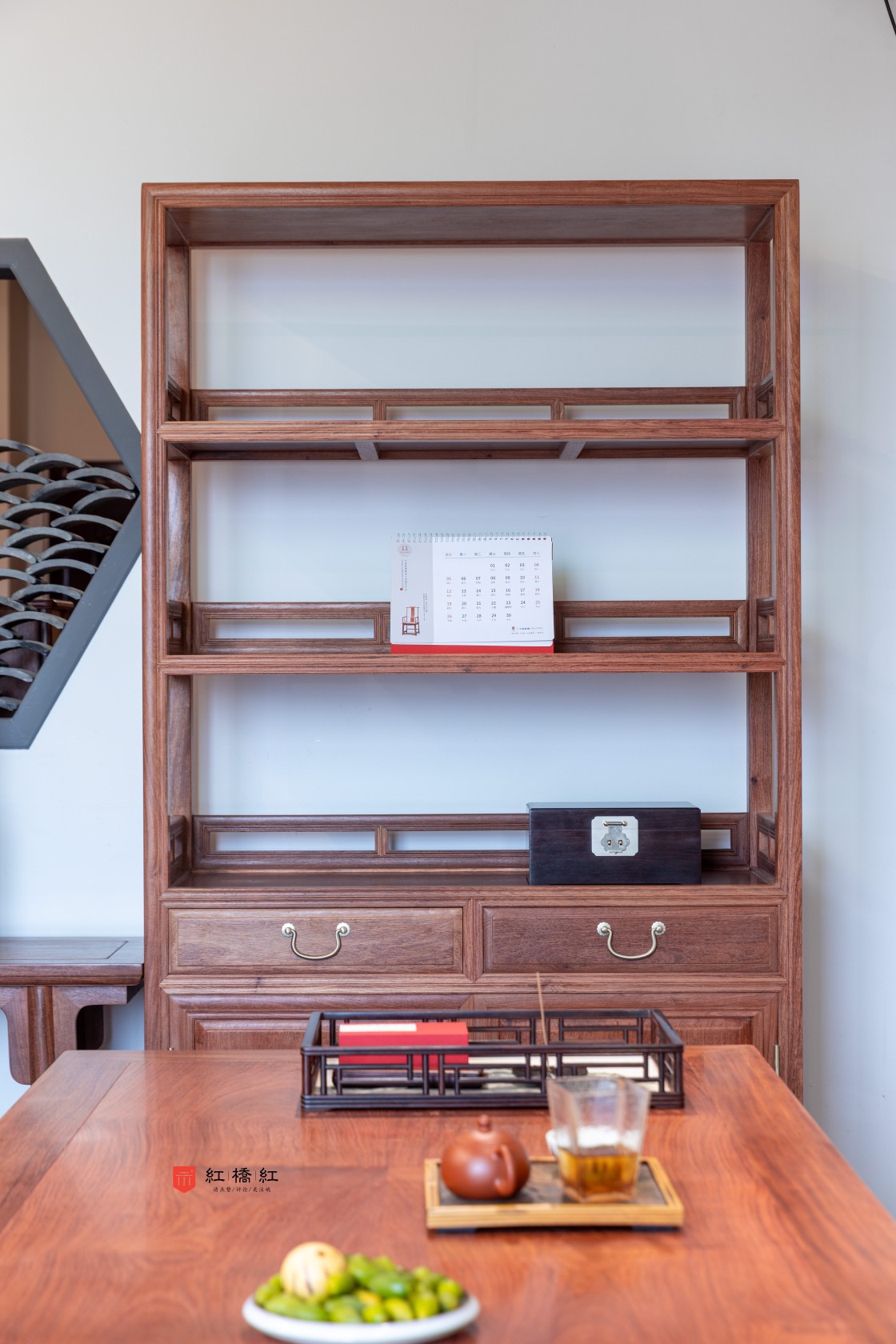 196 抽屉柜门 线条素工 书架:书架设层架将空间分割成三层,三面设开光围栏,横竖材综合打洼与指甲圆的处理,一个内凹、一个外凸,在一潭清水般的器物上,造出微风拂过、涟漪接续的起落与波折,让四面的观赏性大大提高,整器层次分明,空灵通透,光素无华,用以陈列书籍、物品、令室内空间豁然开朗。