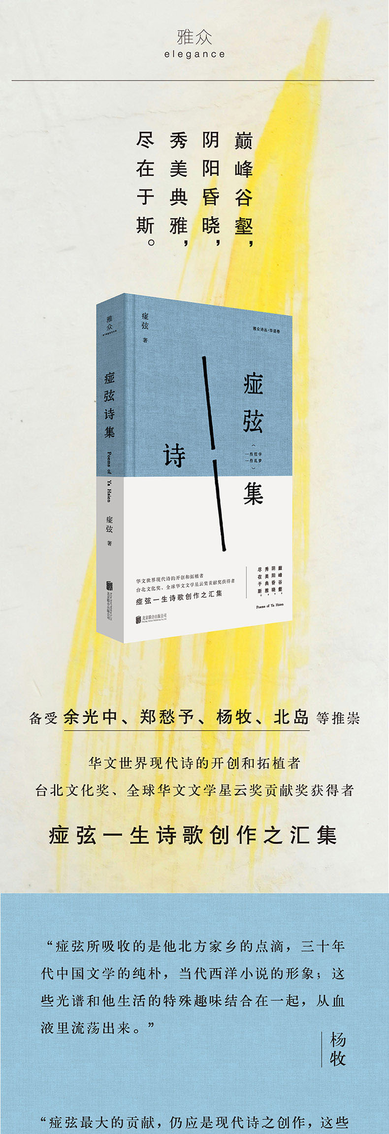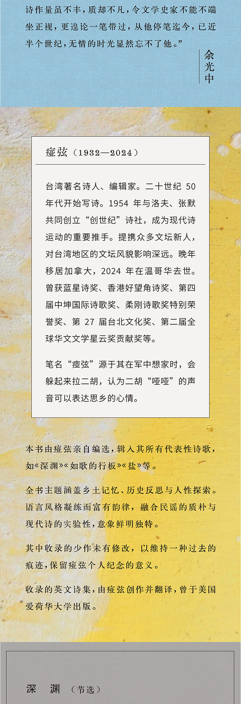 1.痖弦毕生诗作精粹,以纯粹诗性语言熔铸时代记忆与人性洞察,被余光中、杨牧等大家誉为“不可忽视的文学经典”。