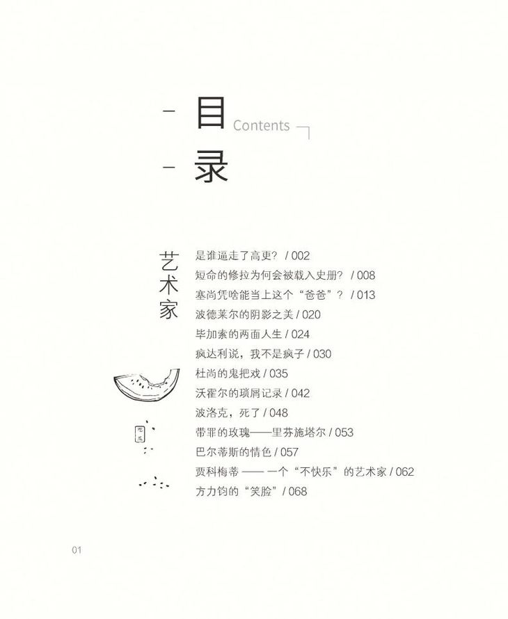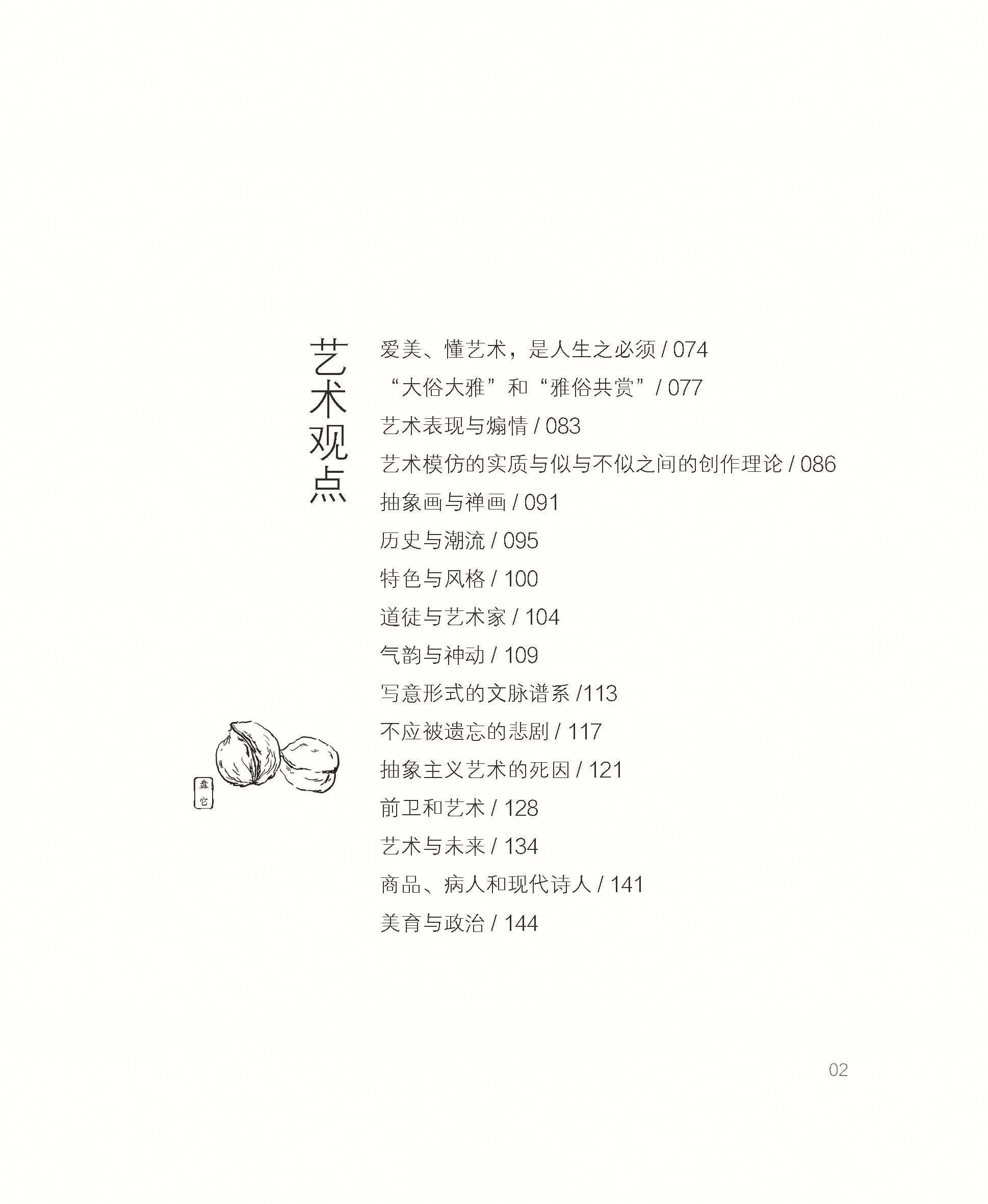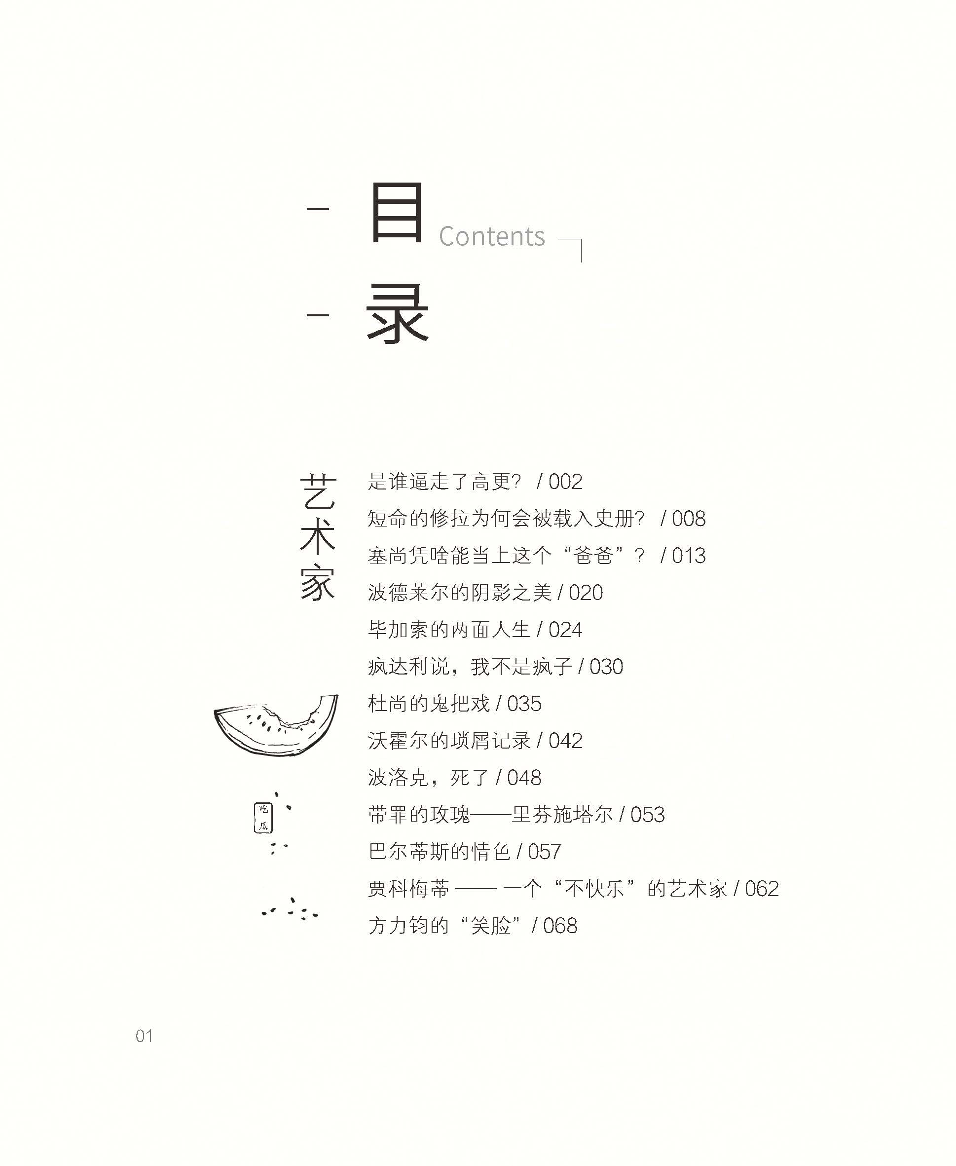 全书分为三部分。第一部分“艺术家”,趣谈13位现当代艺术家的生平轶事;第二部分“艺术观念”,用理性的艺术批评的方式重新复盘常见的艺术观点,推翻惯性思维造成的僵化认识;第三部分“艺术现象”,揭穿、挑明现今社会中令人混乱、迷惑的艺术现象。