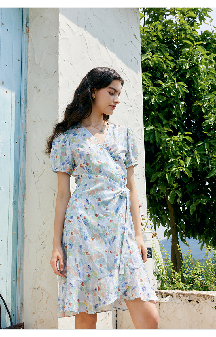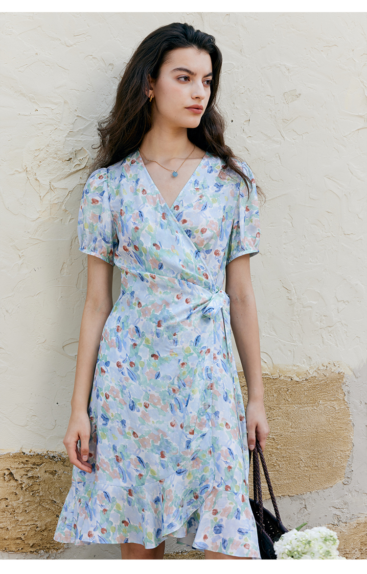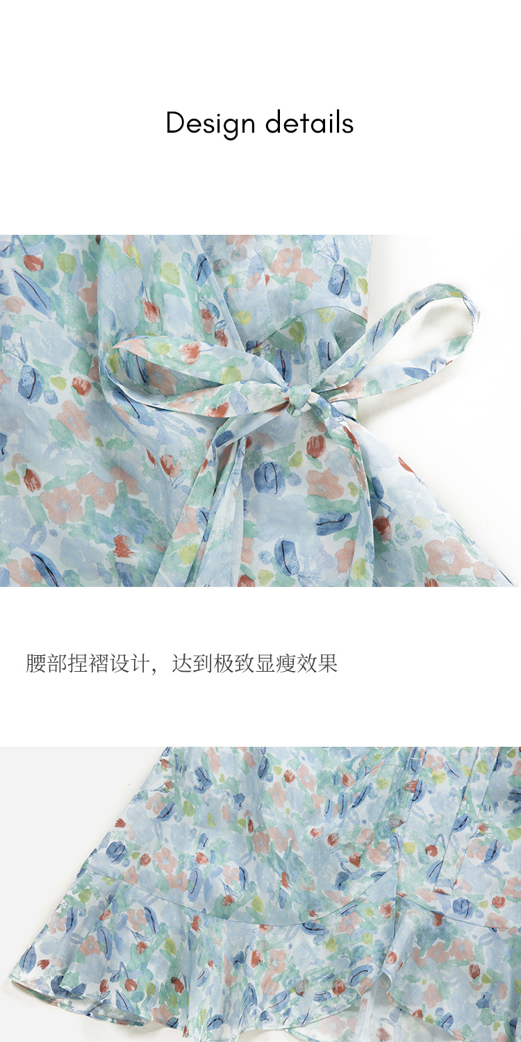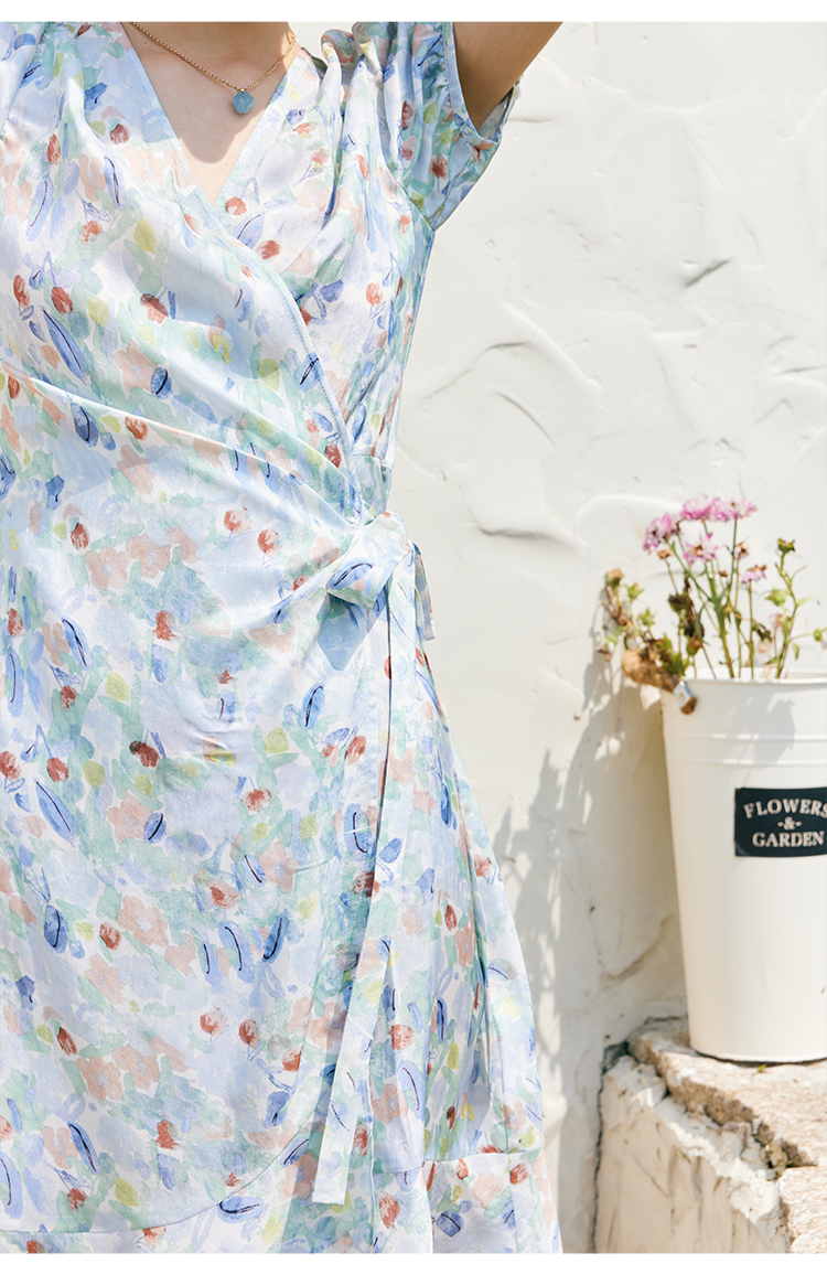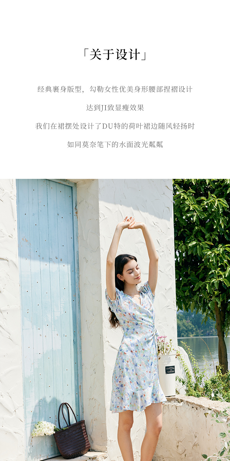 HeyDres法式裹身碎花连衣裙女夏季抽褶收腰设计气质荷叶边裙子