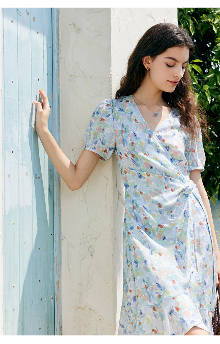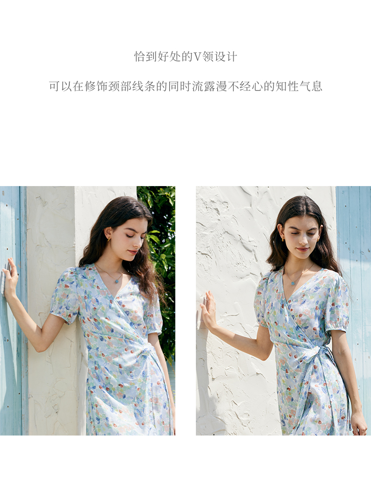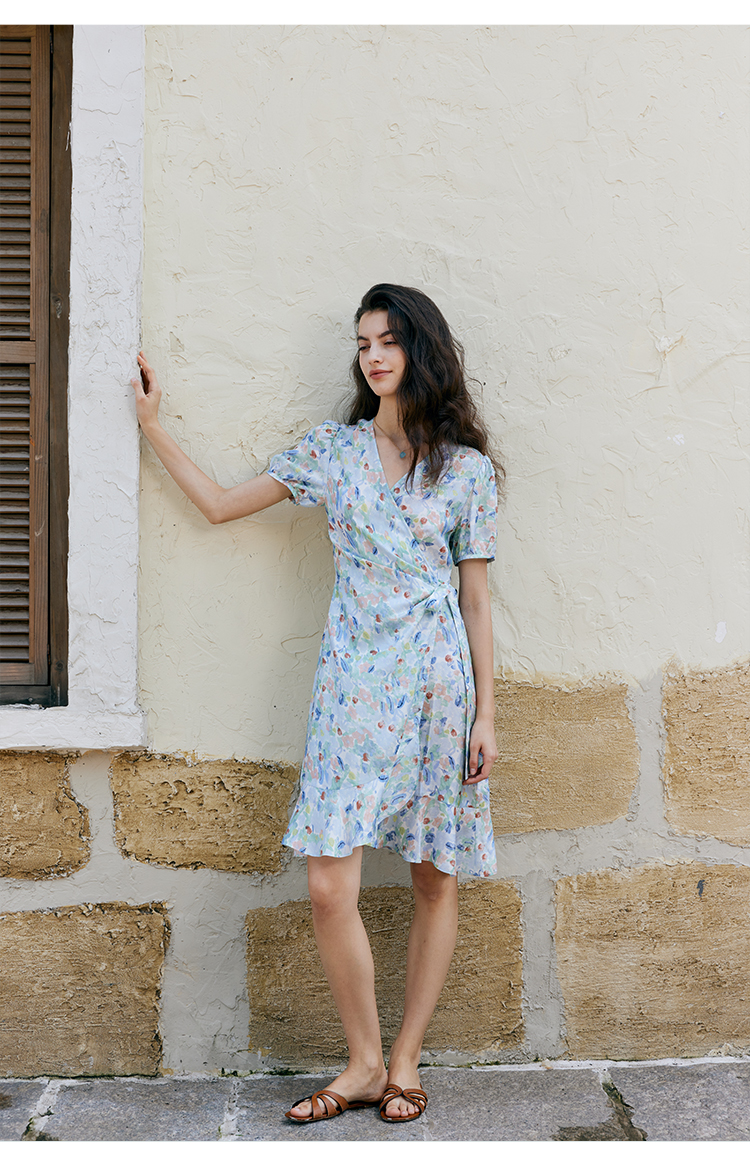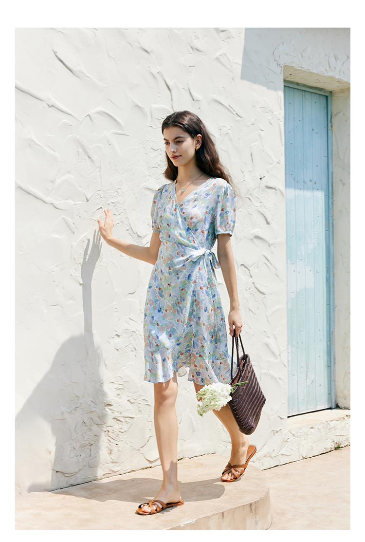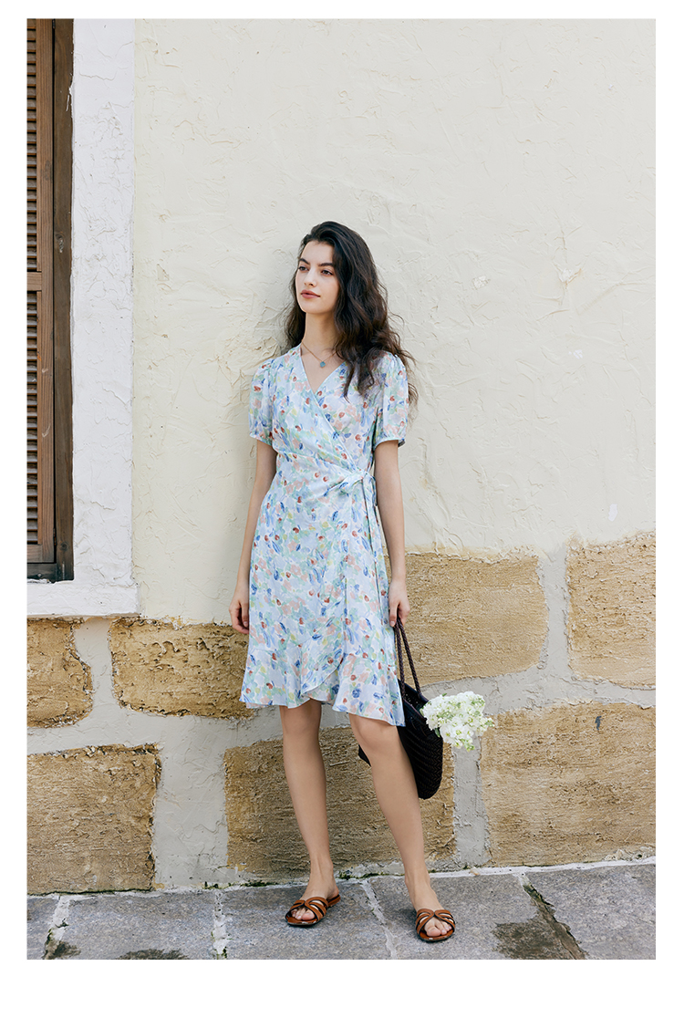 HeyDres法式裹身碎花连衣裙女夏季抽褶收腰设计气质荷叶边裙子