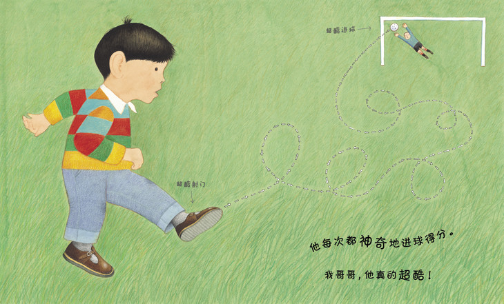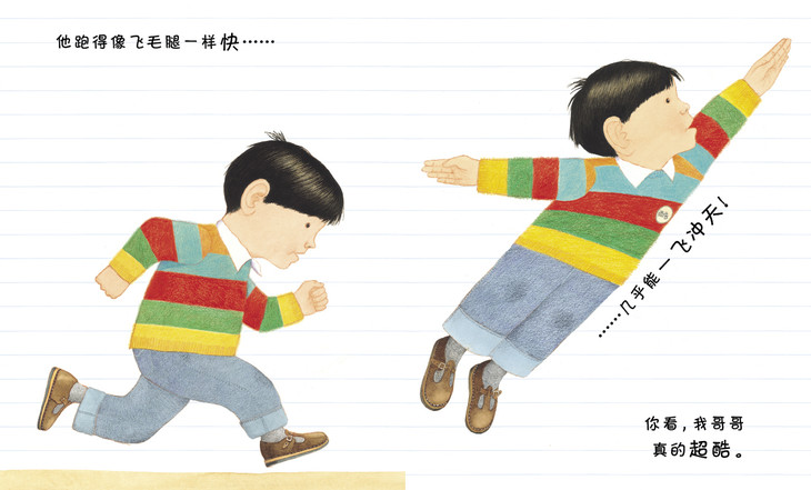 每一个孩子心中,哥哥都是特别酷的。在安东尼·布朗的这本新作中尤其如此:哥哥是超级跳高选手、身手矫健的蜘蛛人、顶尖滑板高手、狂野的摇滚歌手、耀眼的迪斯科舞王……总之,这位哥哥真的很酷!如果说《我爸爸》和《我妈妈》是给所有父母的献礼,那这本《我哥哥》也同样有安东尼纪念自己哥哥的意味。