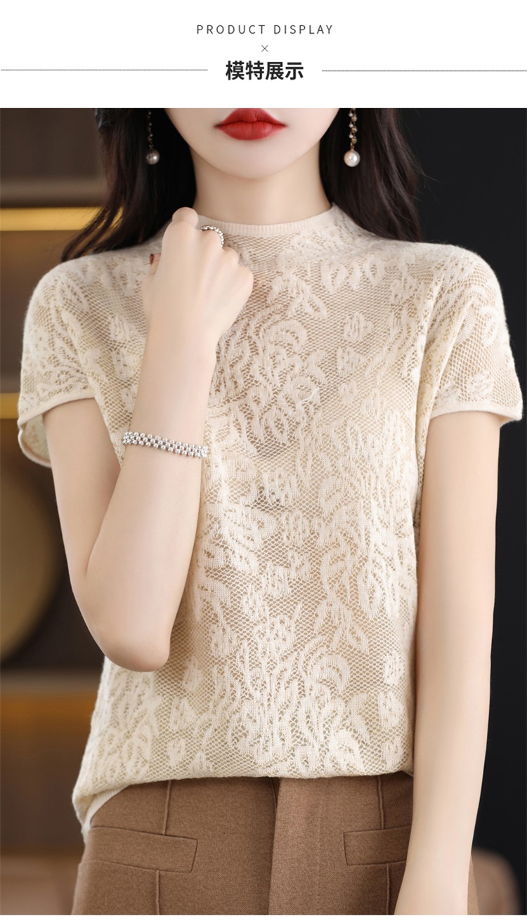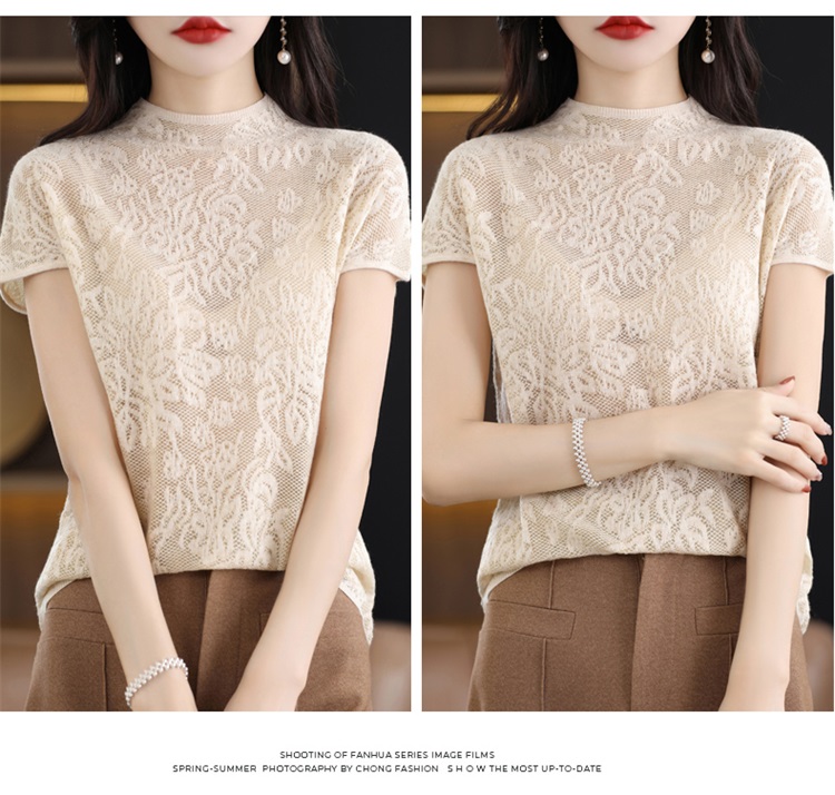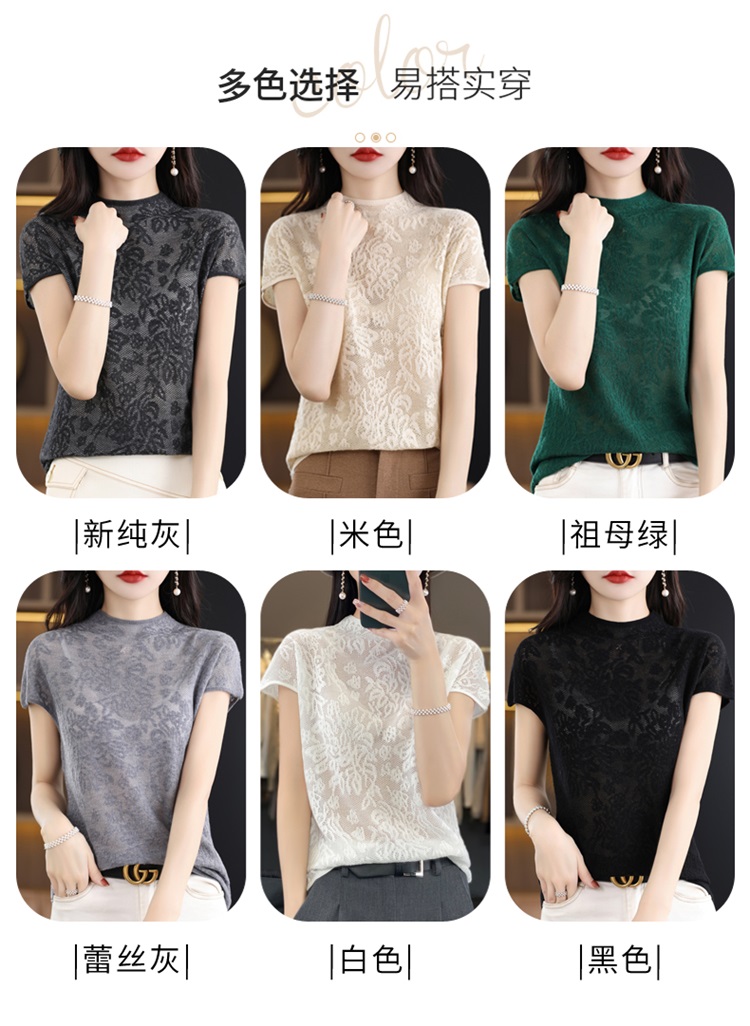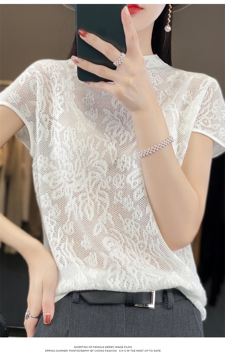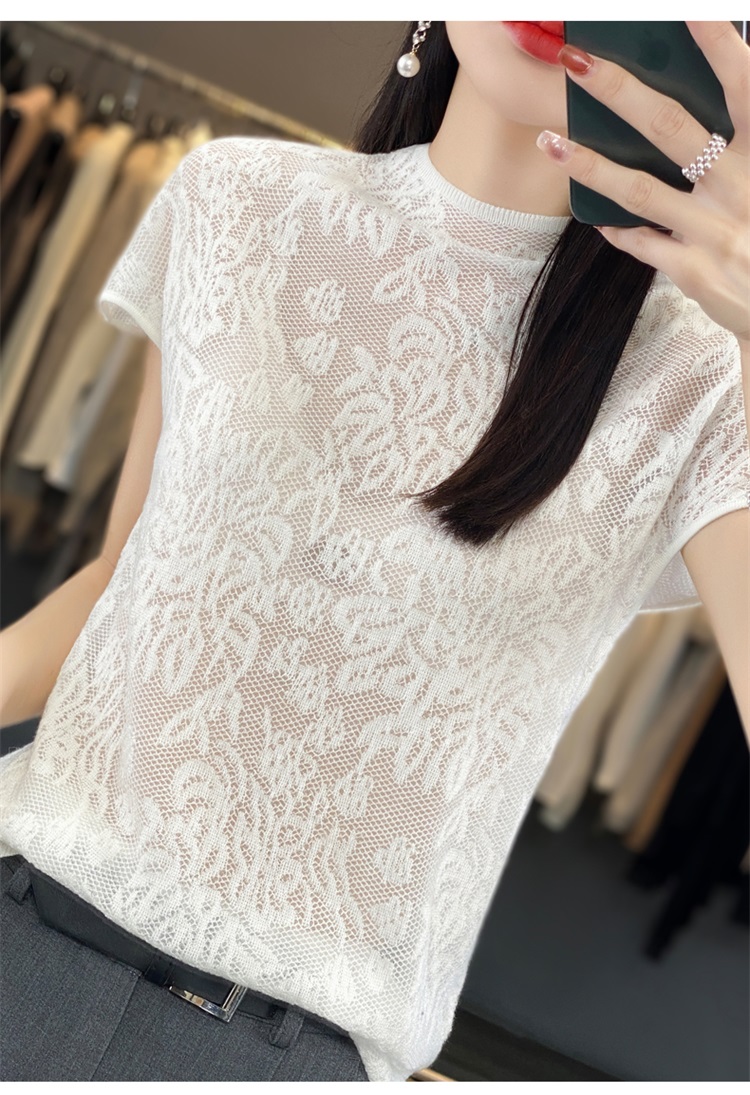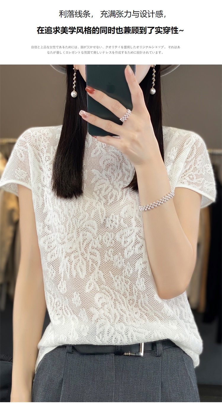 雀说 夏季蕾丝羊毛精纺针织体恤短袖女款镂空宽松打底上衣4ZF-2997