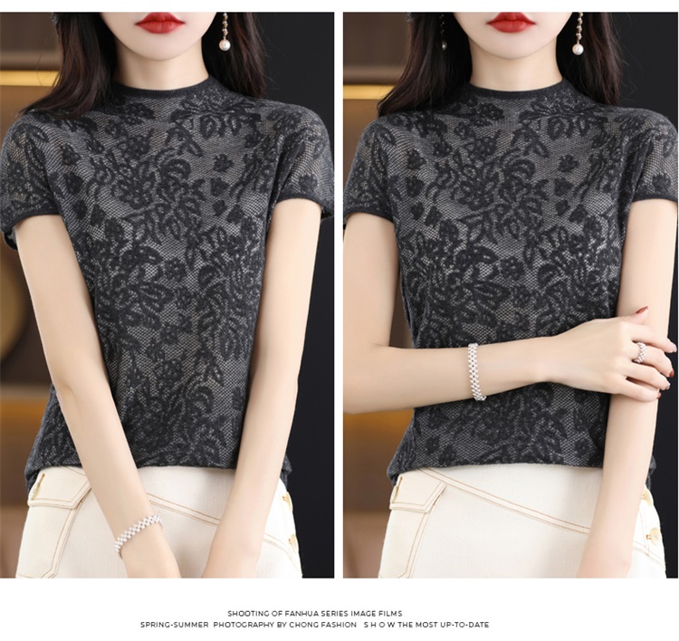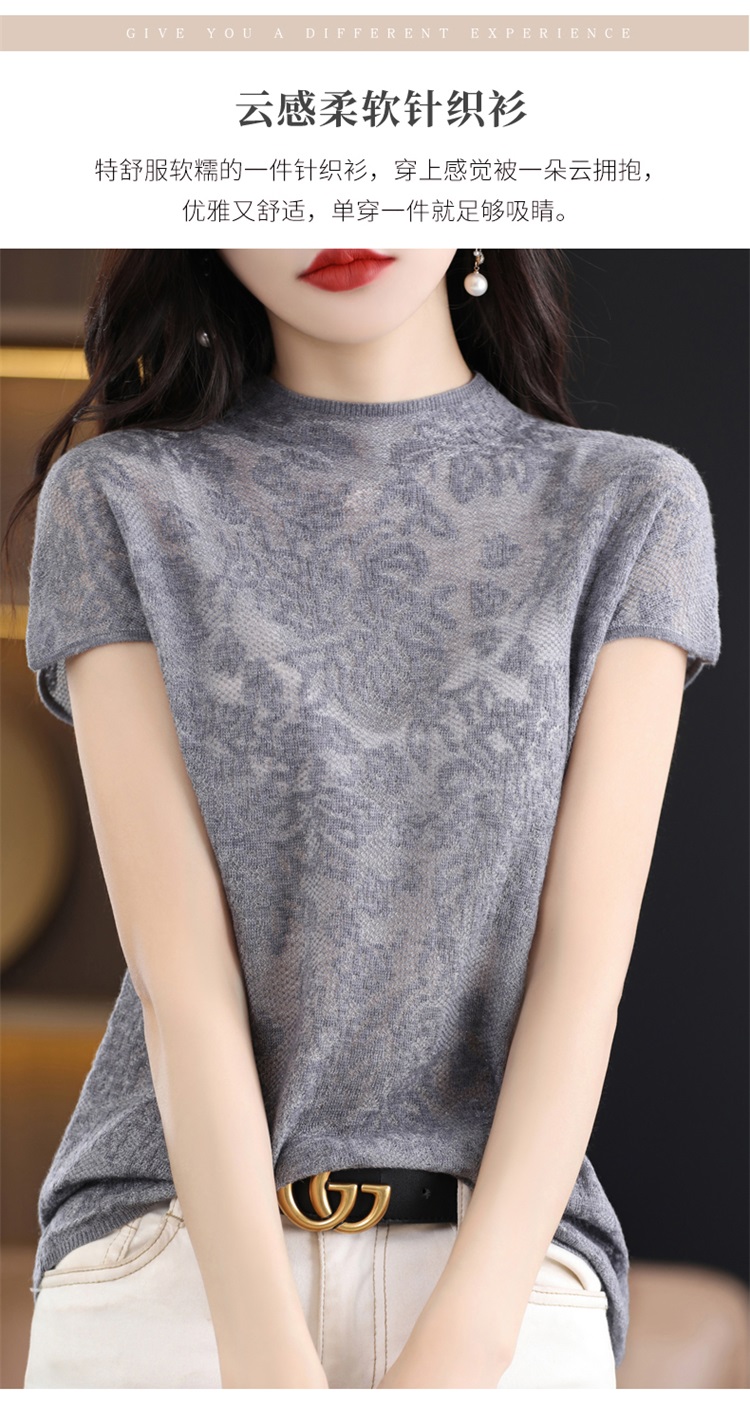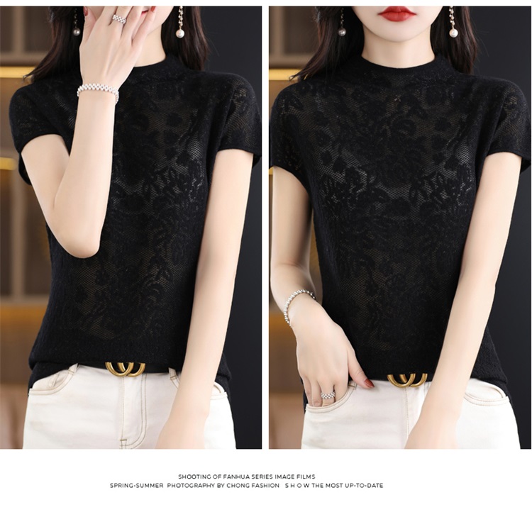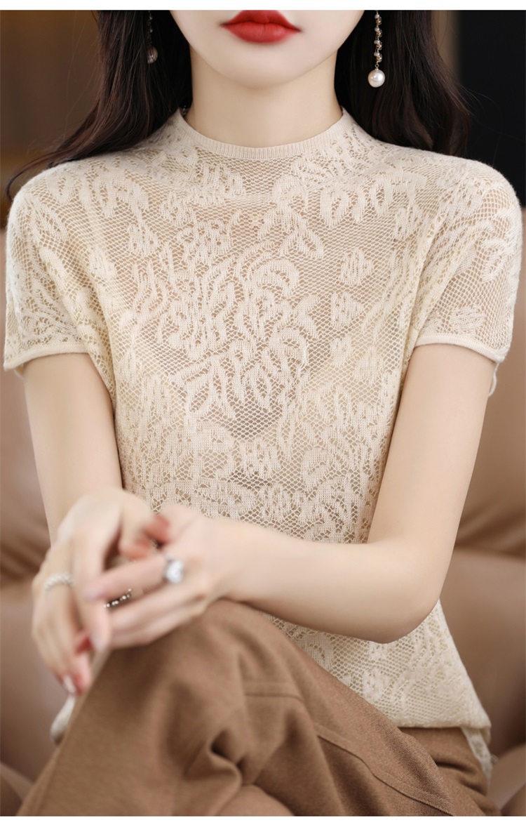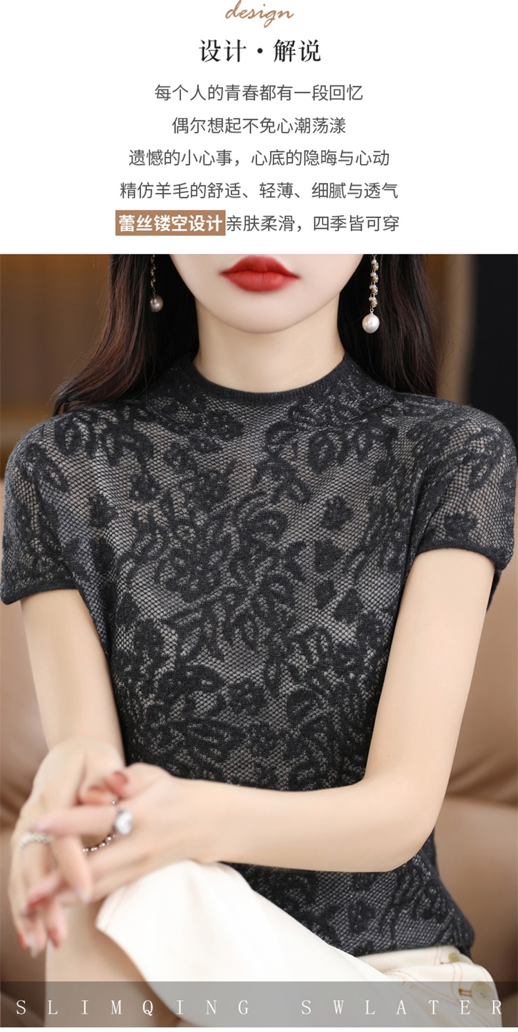 雀说 夏季蕾丝羊毛精纺针织体恤短袖女款镂空宽松打底上衣4ZF-2997