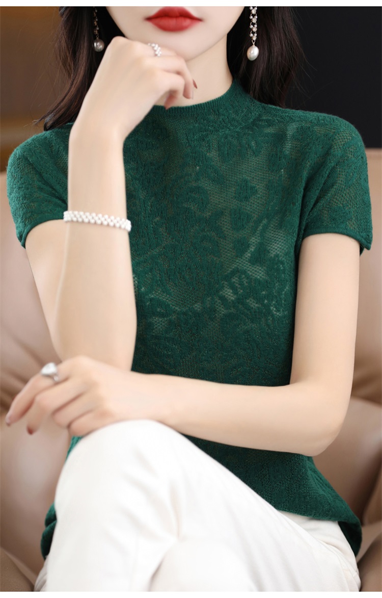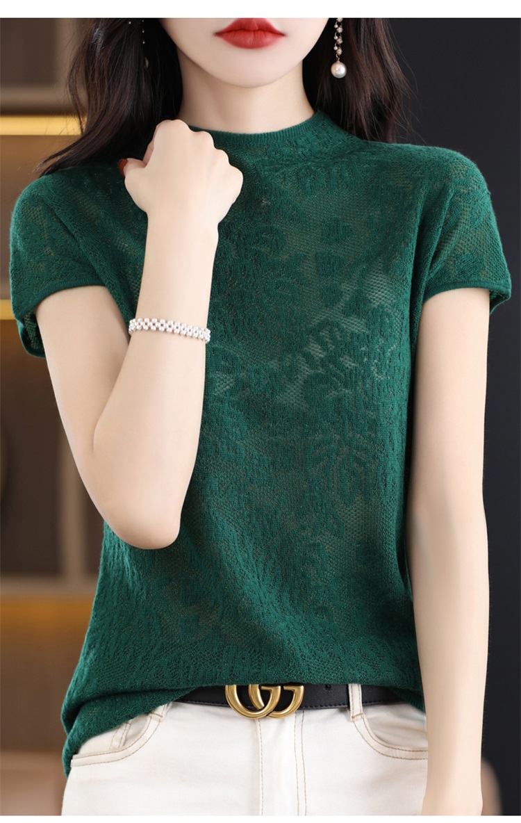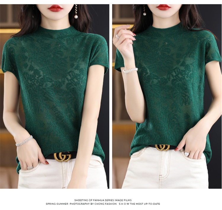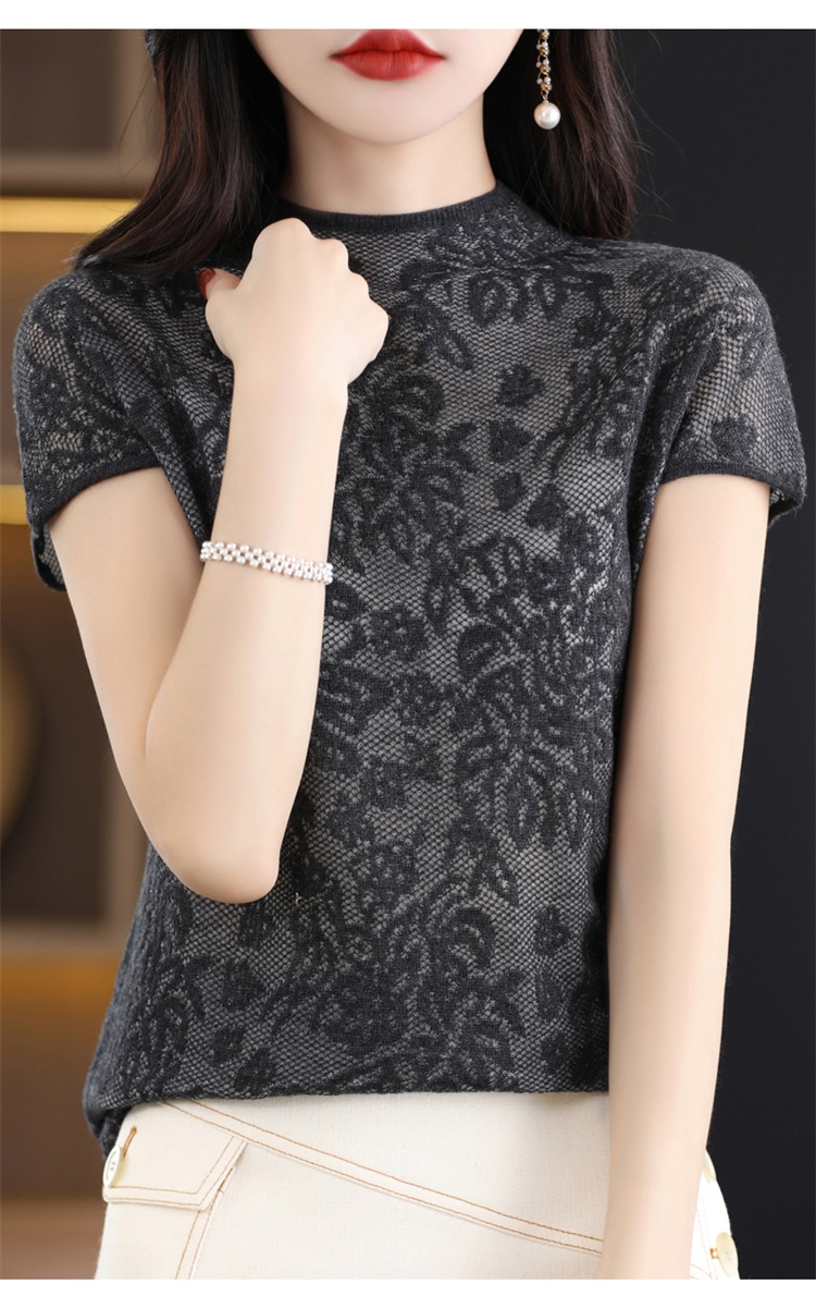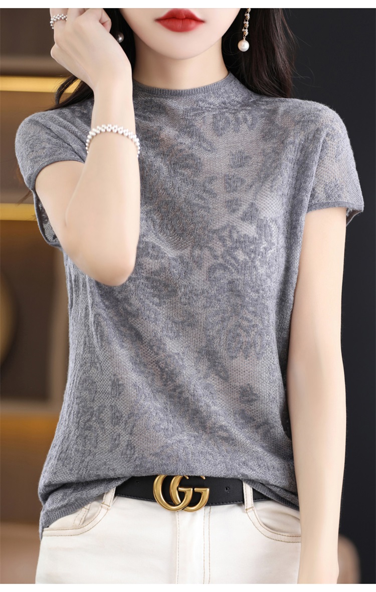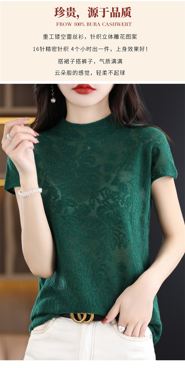 雀说 夏季蕾丝羊毛精纺针织体恤短袖女款镂空宽松打底上衣4ZF-2997