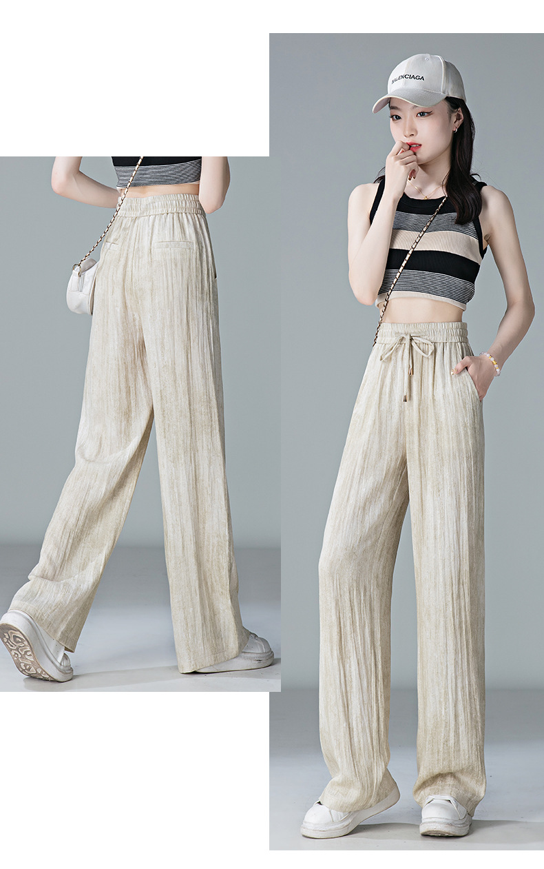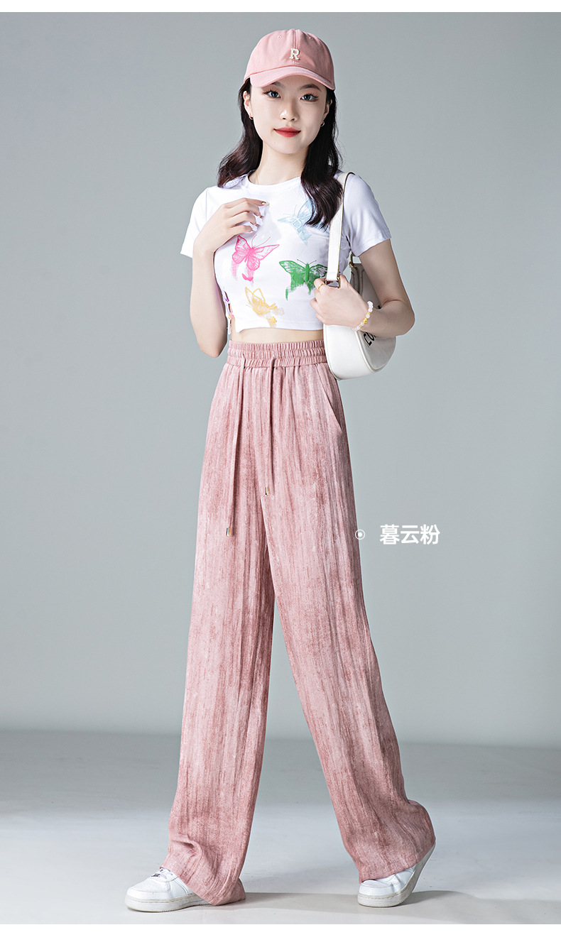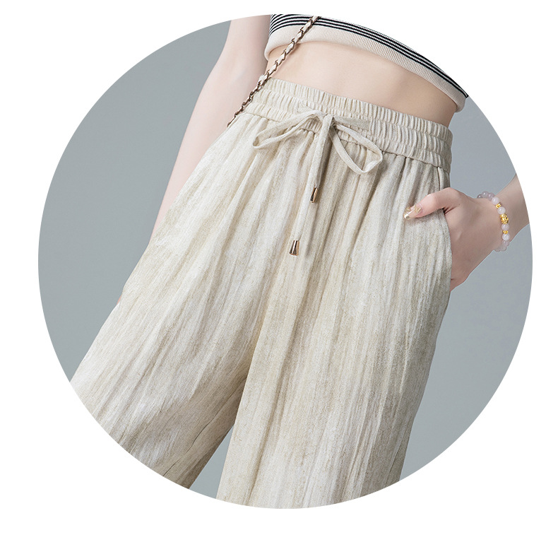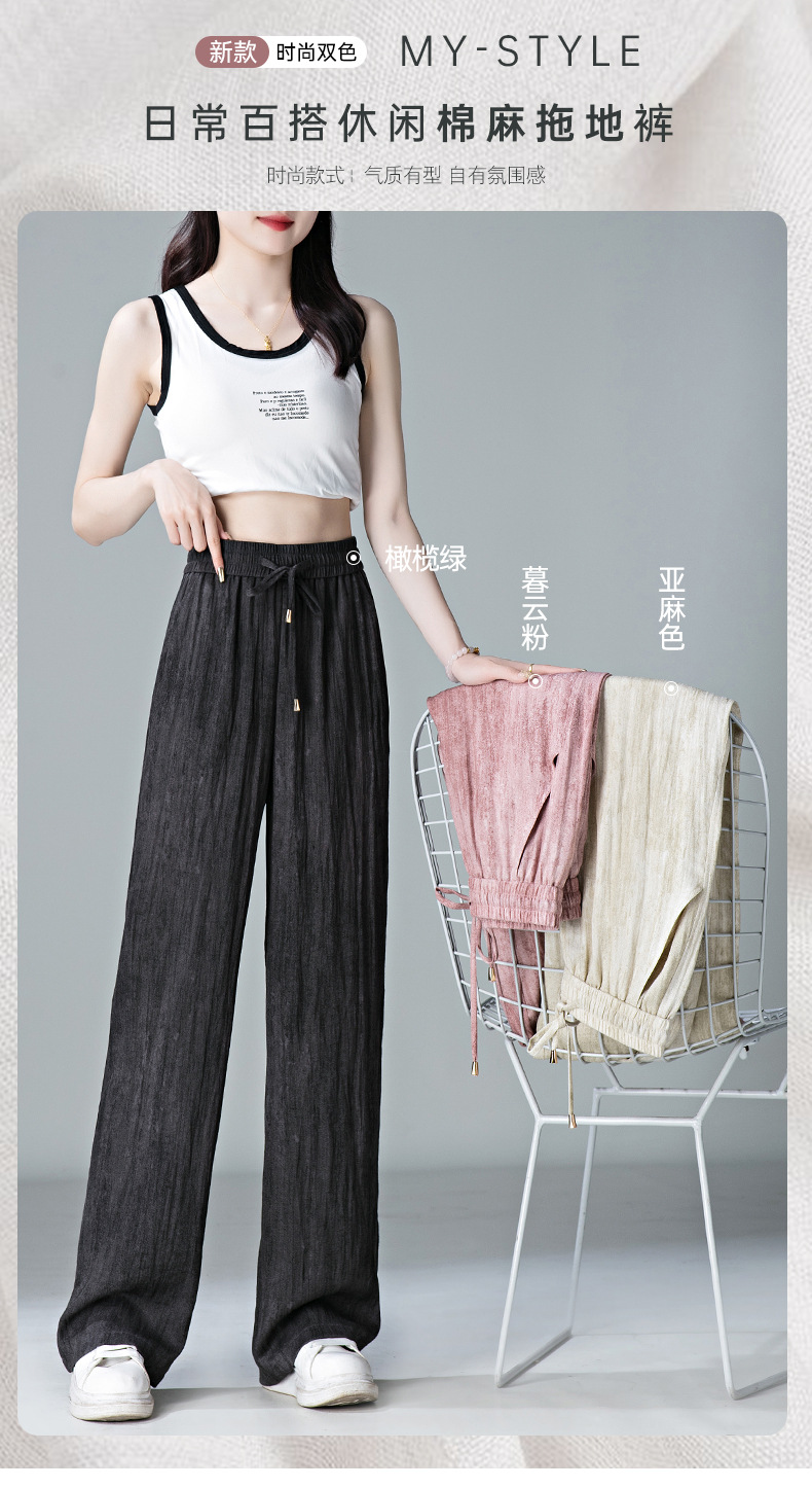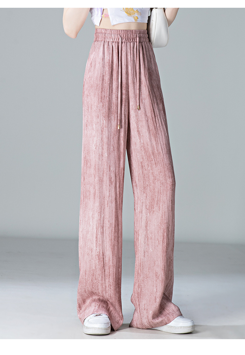 福利款~雀说 亚麻粉色晕染休闲裤女松紧腰夏季薄款宽松窄版阔腿长裤子4ZF-2865