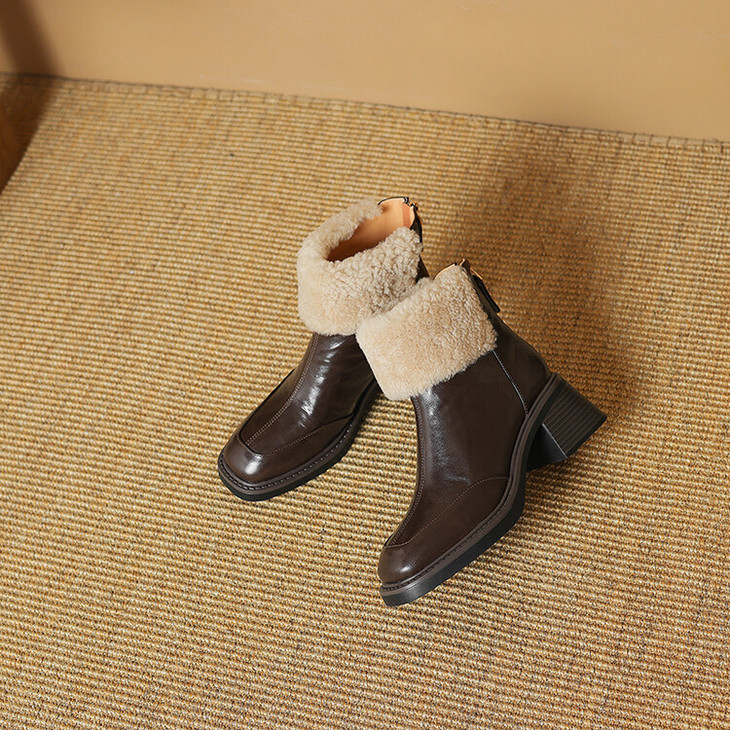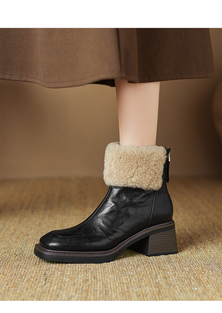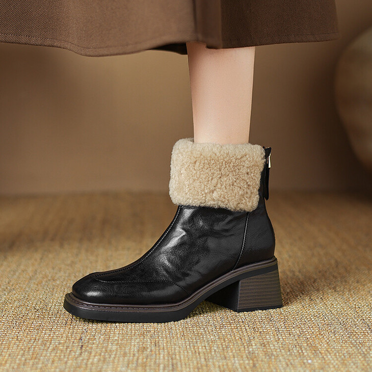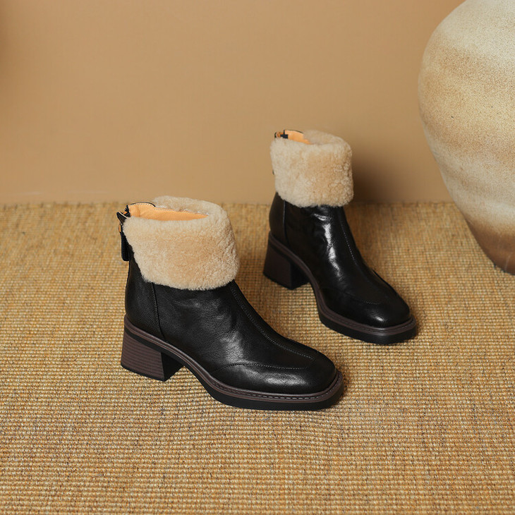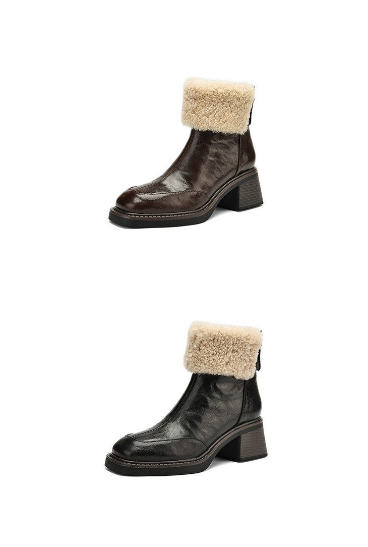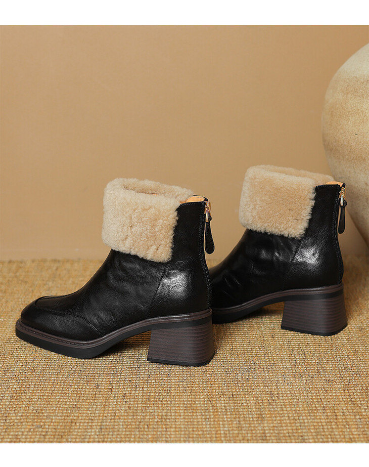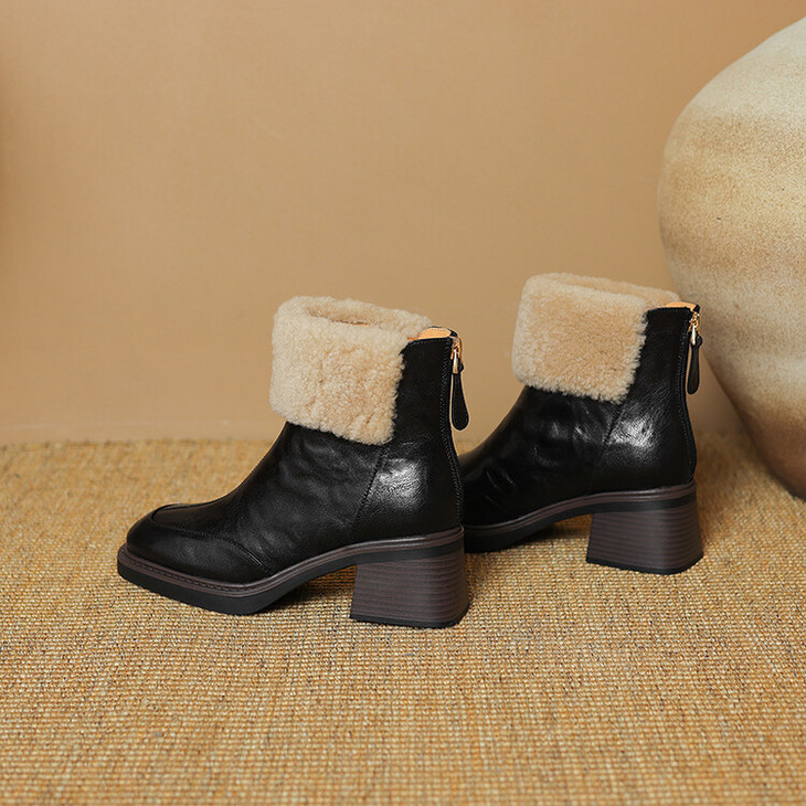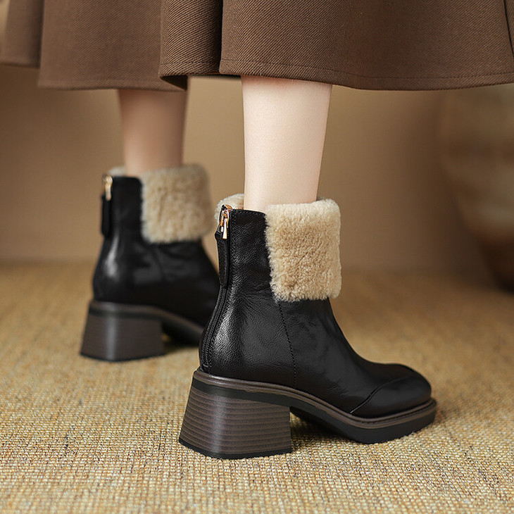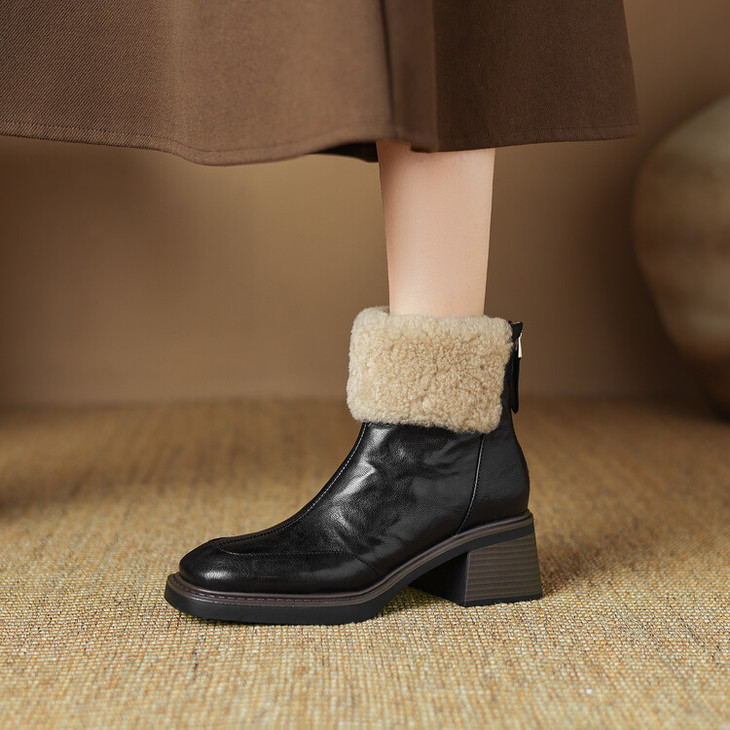 【预售5天】英伦风复古圆头粗跟短靴5.5cm厚底后拉链真皮羊羔毛领口短靴LD&6994