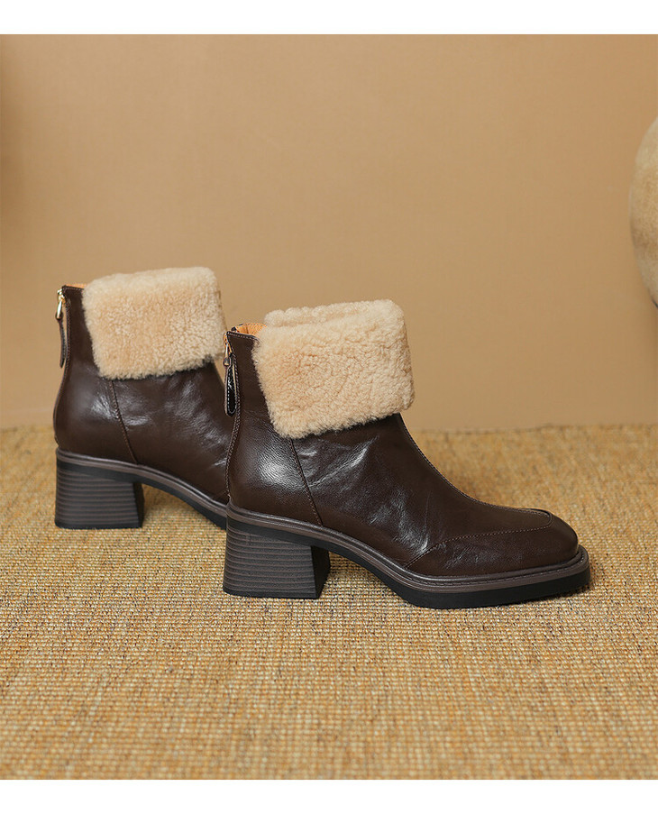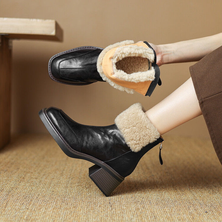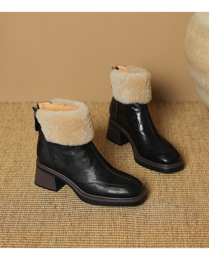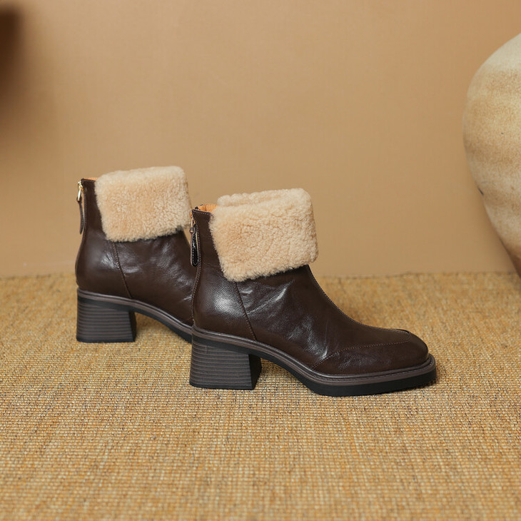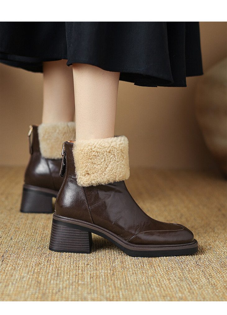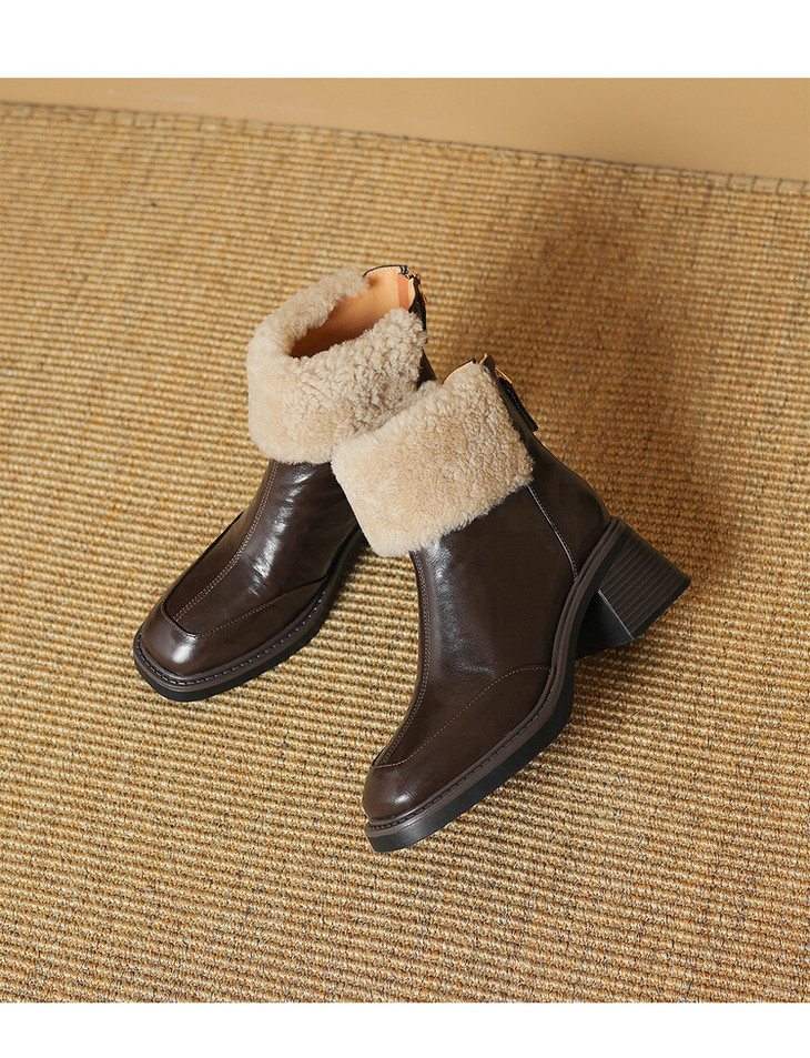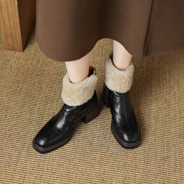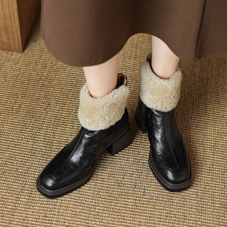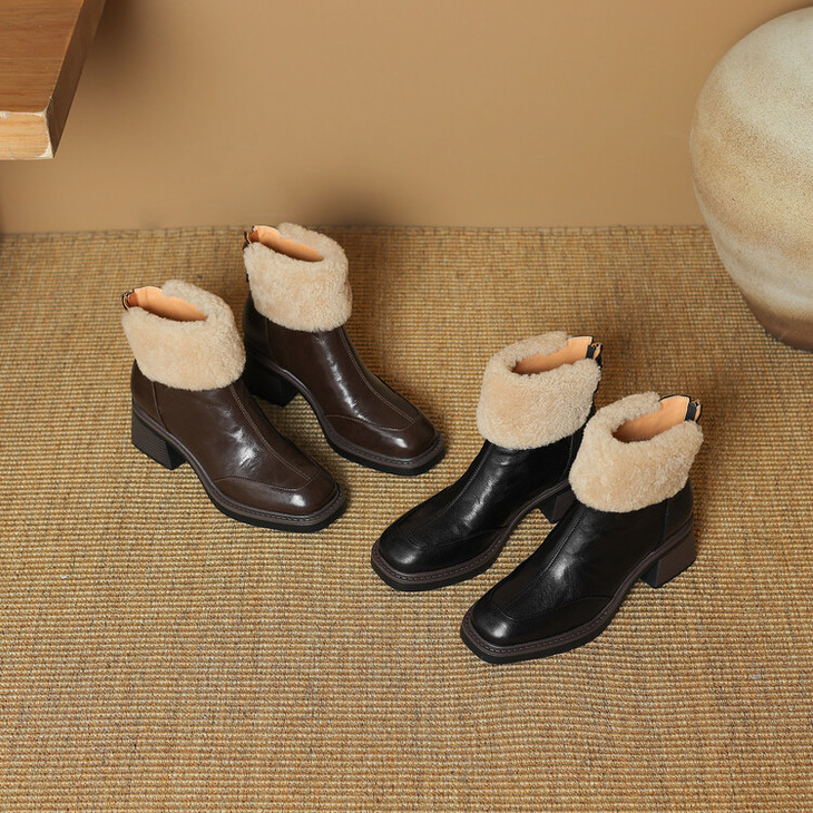 【预售5天】英伦风复古圆头粗跟短靴5.5cm厚底后拉链真皮羊羔毛领口短靴LD&6994