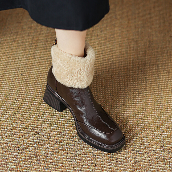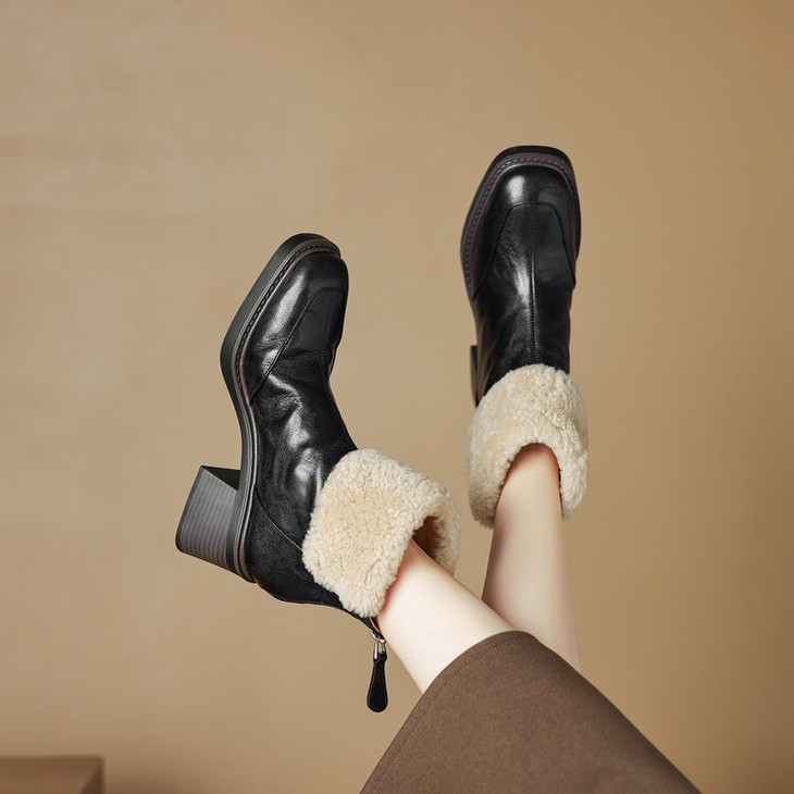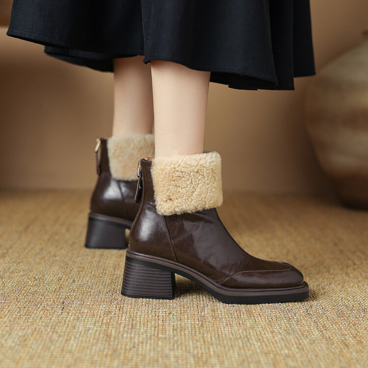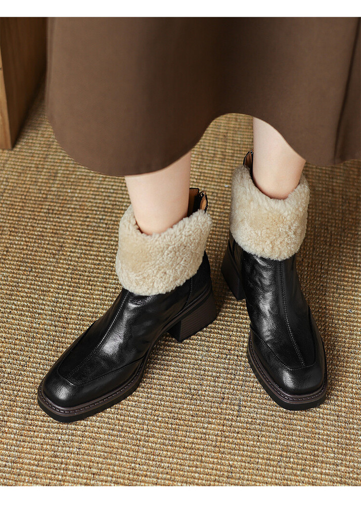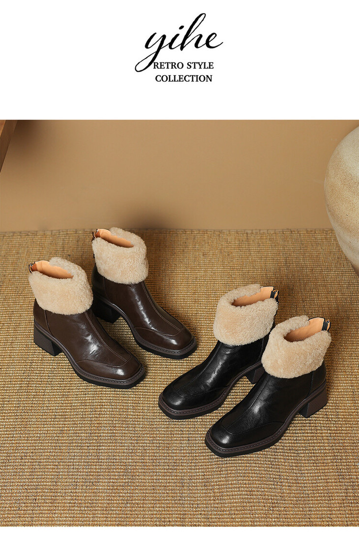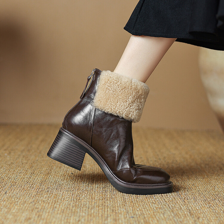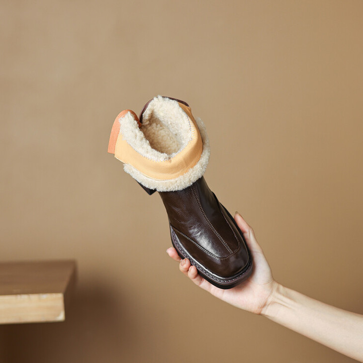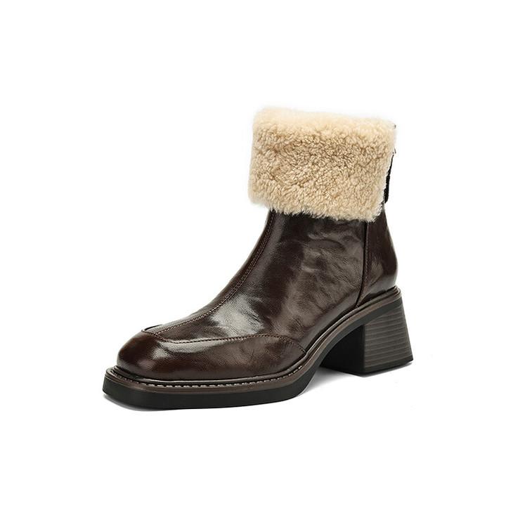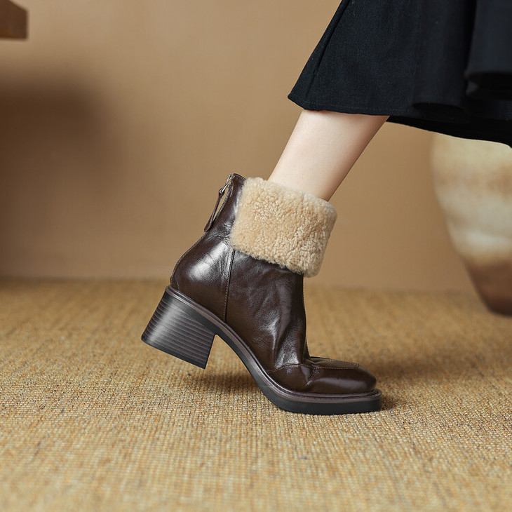 【预售5天】英伦风复古圆头粗跟短靴5.5cm厚底后拉链真皮羊羔毛领口短靴LD&6994