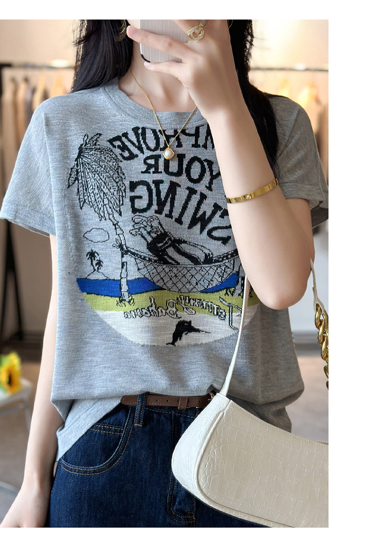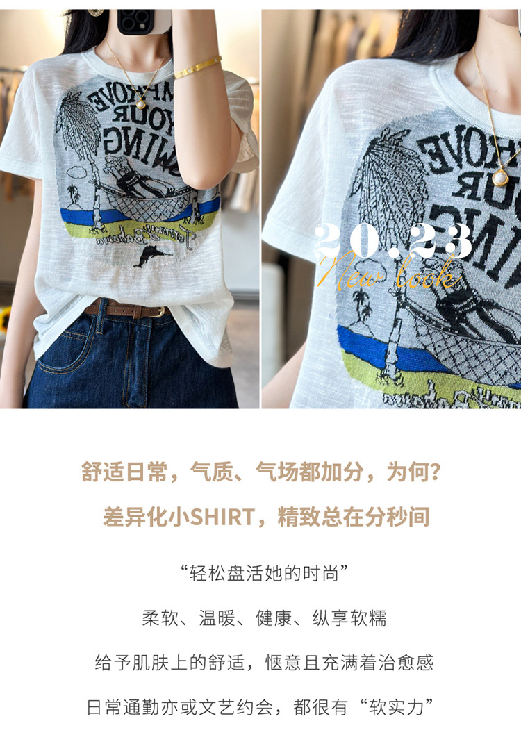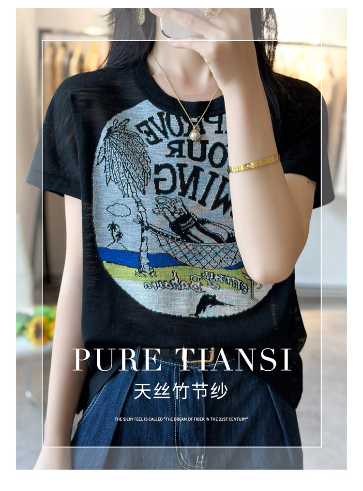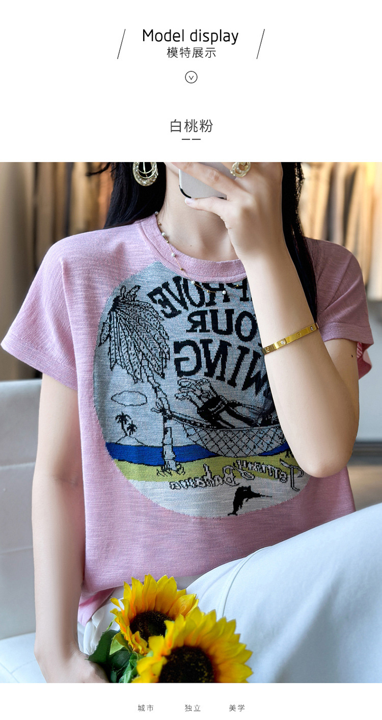 丁摩 爆款天丝竹节棉短袖T恤女夏季圆领宽松印花休闲针织衫半袖5ZF-2328