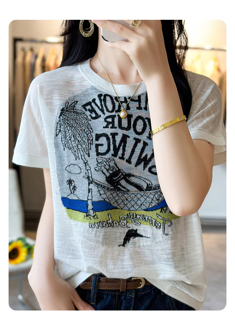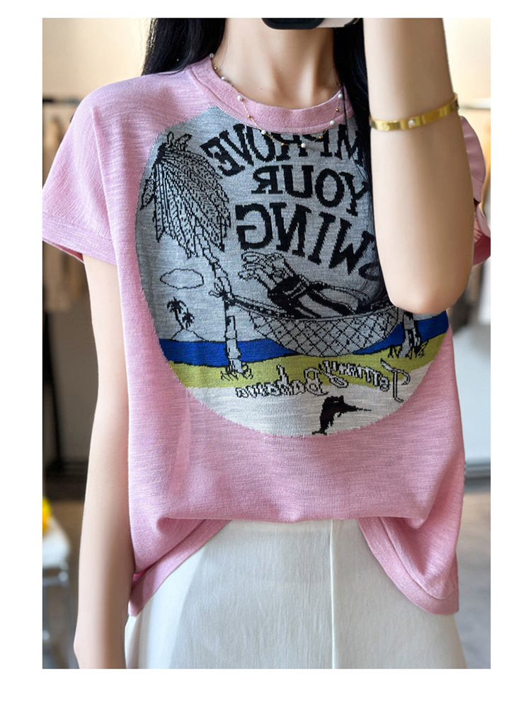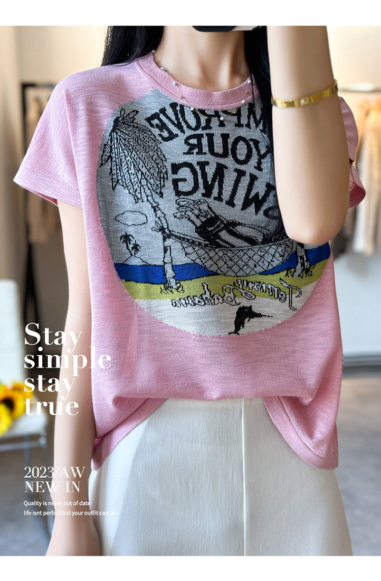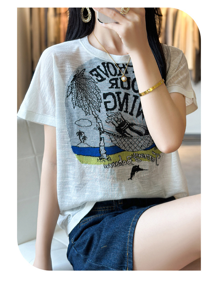 丁摩 爆款天丝竹节棉短袖T恤女夏季圆领宽松印花休闲针织衫半袖5ZF-2328