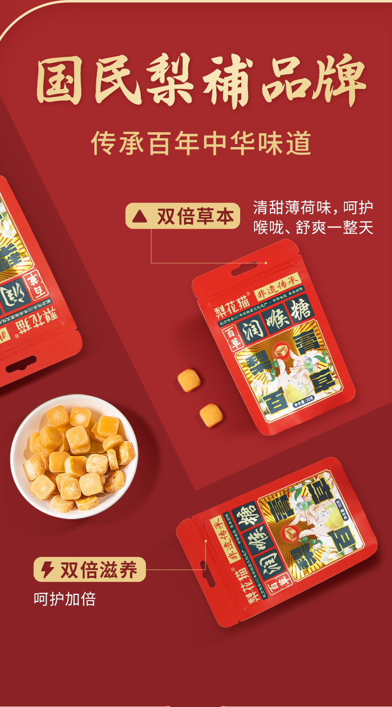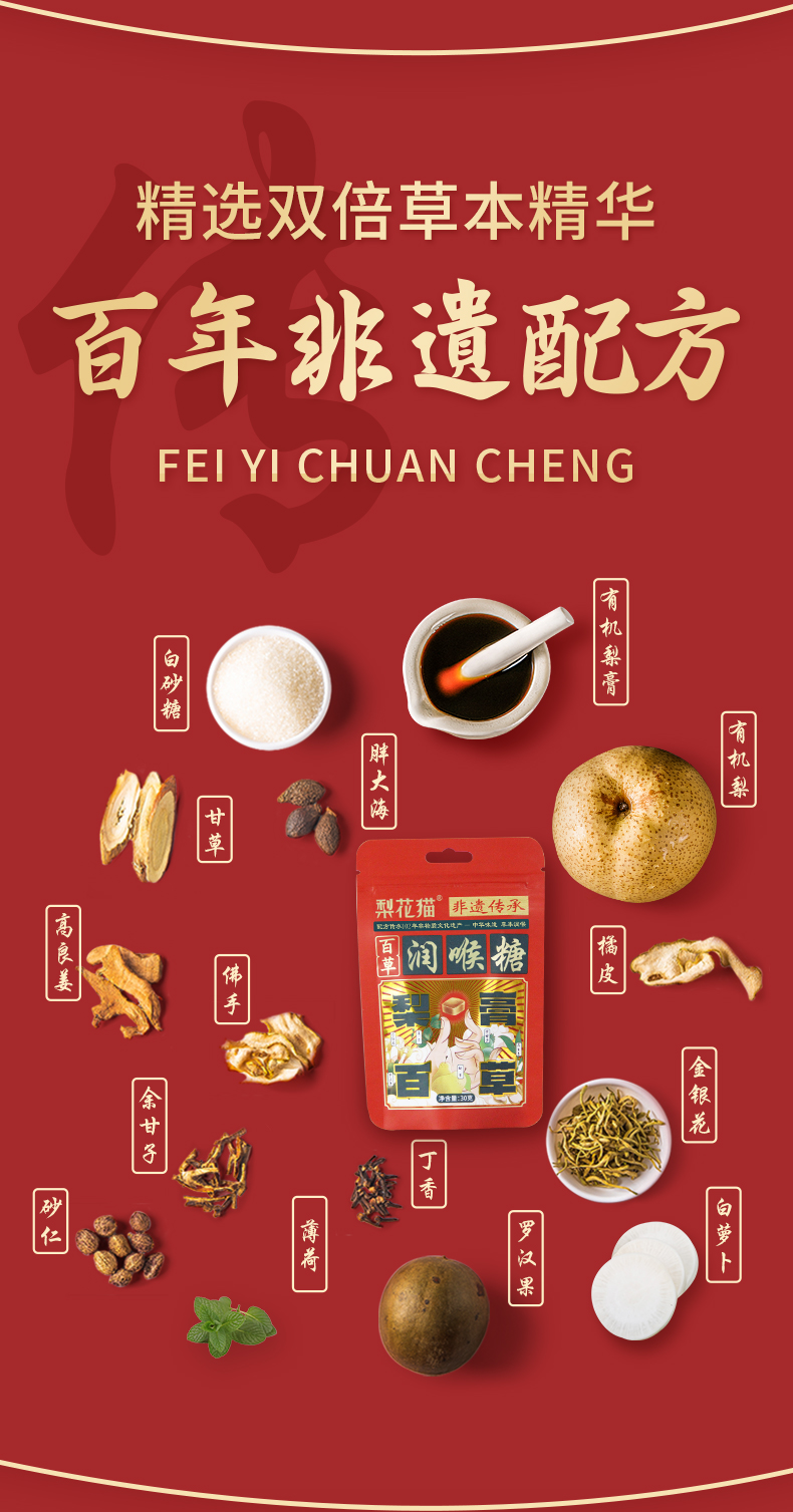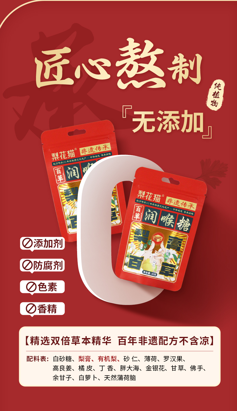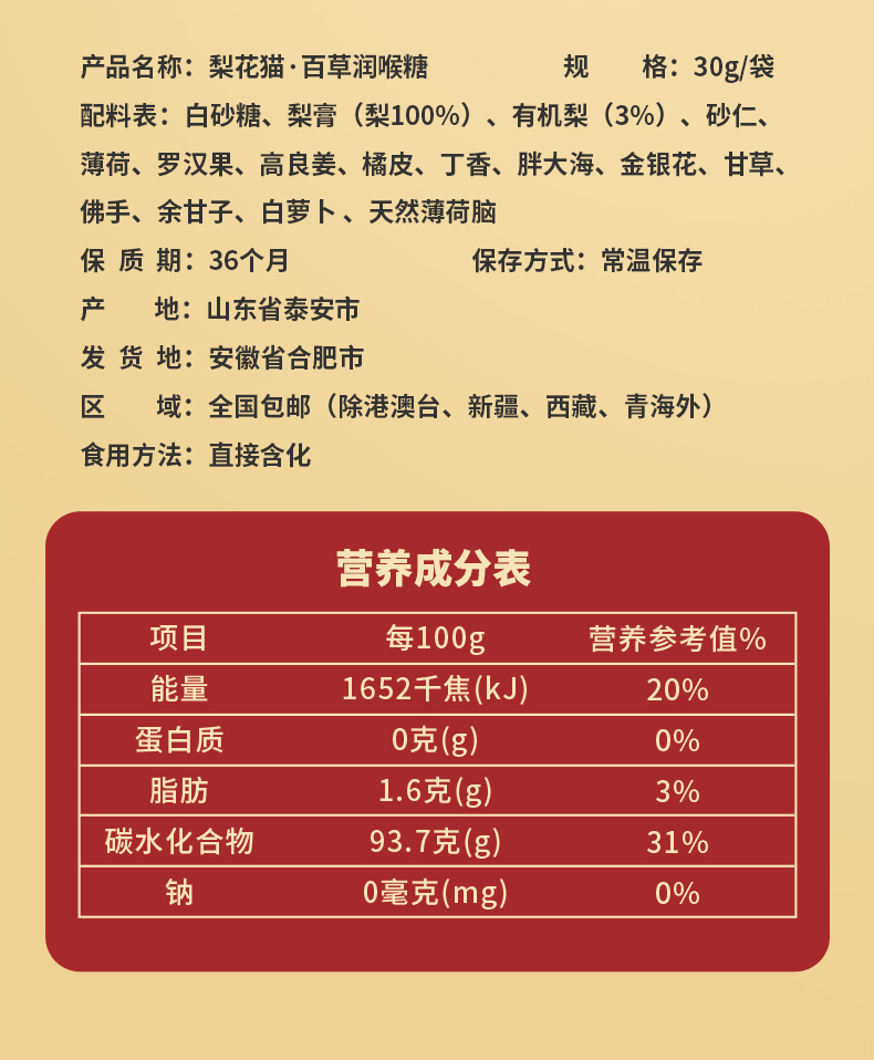 | 【品名】梨花猫百草有机润喉糖 【规格】30g/包 【保质期】36个月 【储存方法】请置于阴凉干燥处,避免阳光直射 【产地】山东泰安 【发货地】安徽/河南 【发货快递】中通/圆通/韵达 【不发货区域】新疆,西藏,港澳台地区不发 【发货时效】48小时,节假日顺延 |