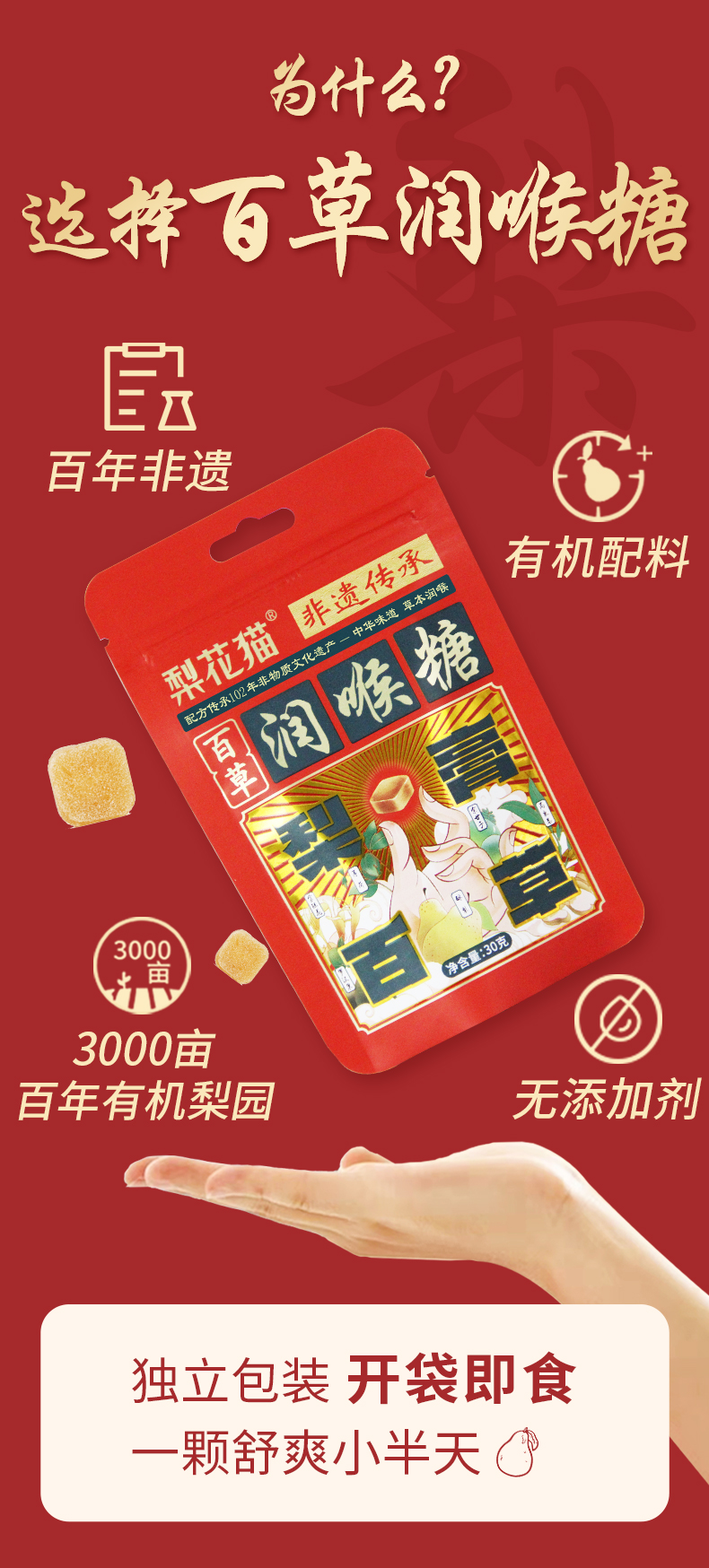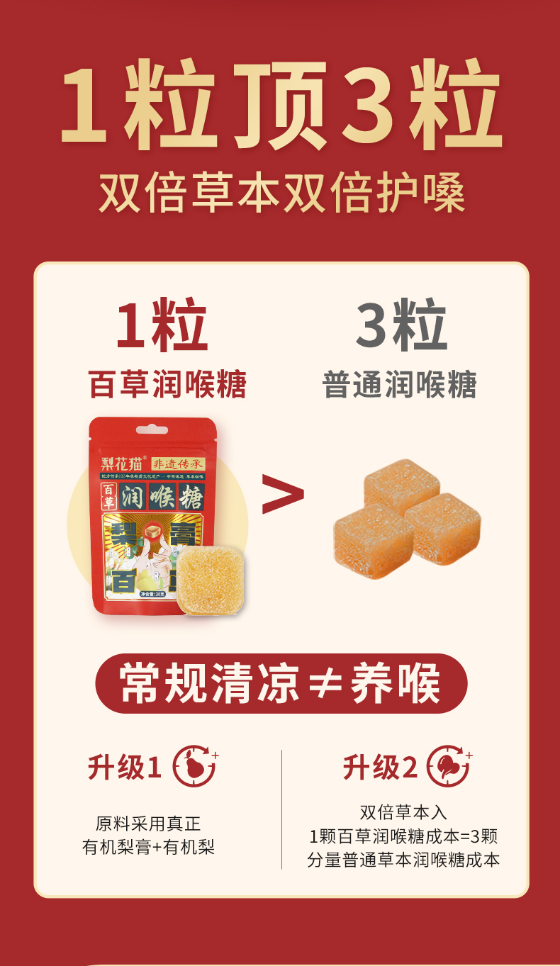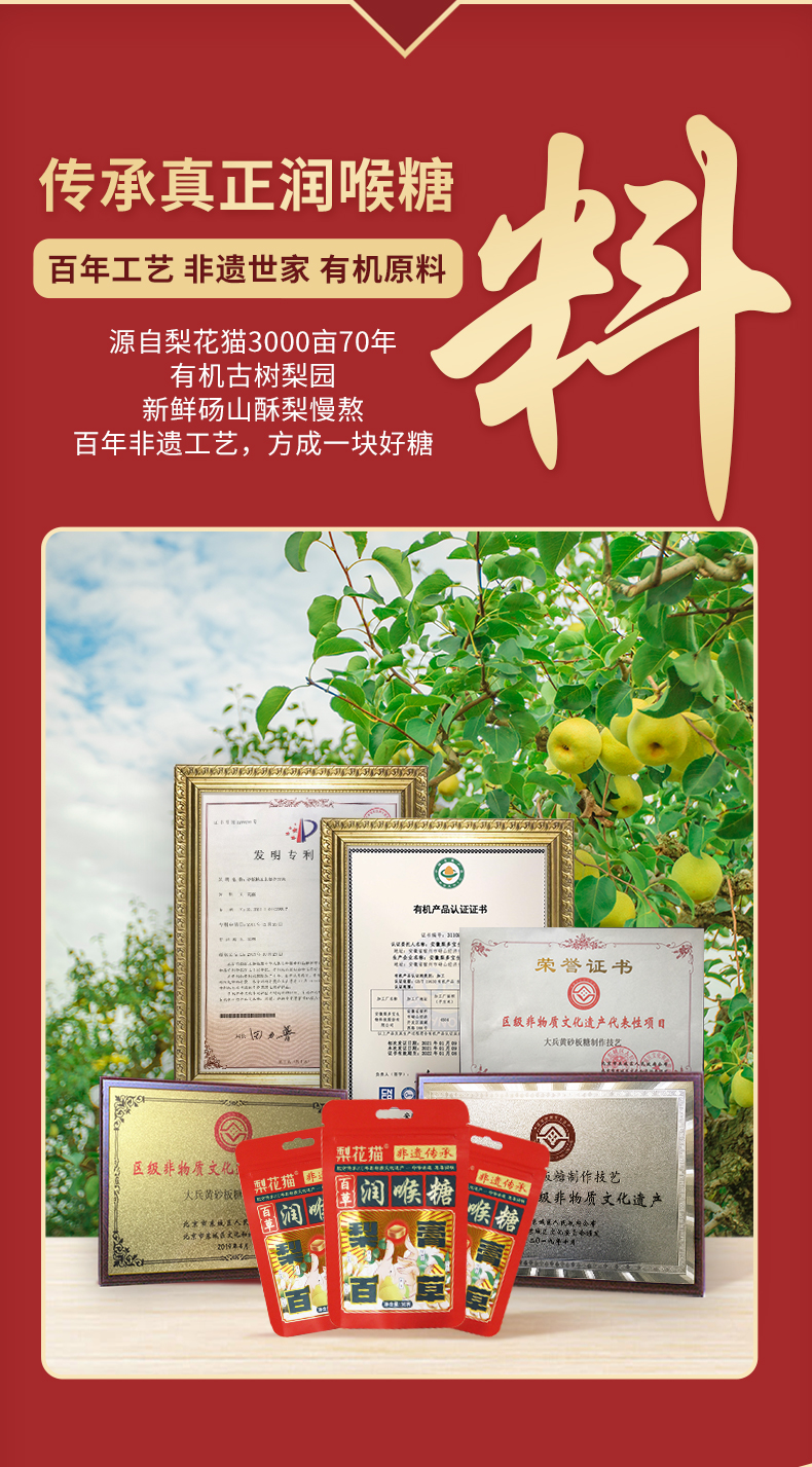 | 【品名】梨花猫百草有机润喉糖 【规格】30g/包 【保质期】36个月 【储存方法】请置于阴凉干燥处,避免阳光直射 【产地】山东泰安 【发货地】安徽/河南 【发货快递】中通/圆通/韵达 【不发货区域】新疆,西藏,港澳台地区不发 【发货时效】48小时,节假日顺延 |
